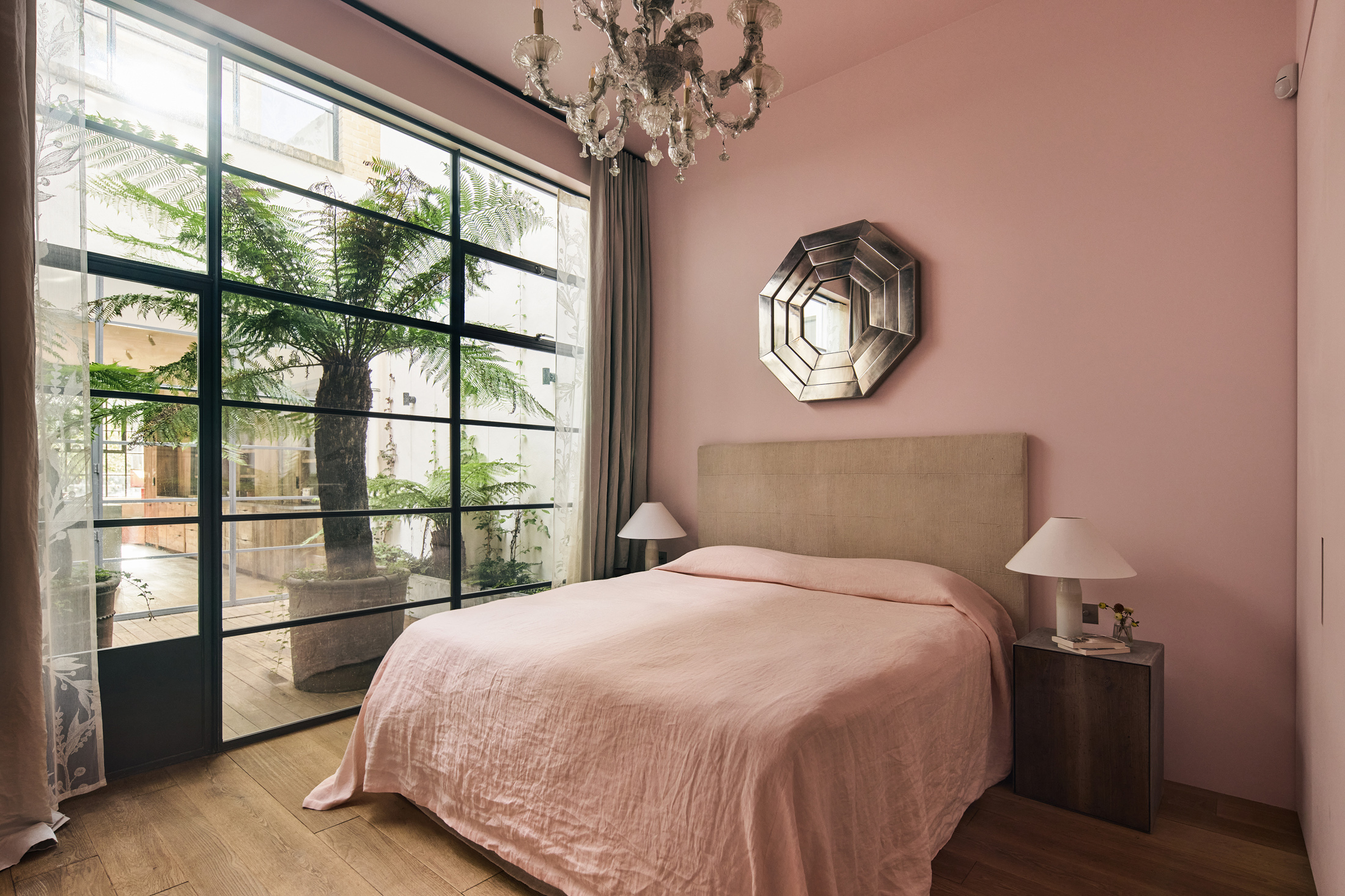 On the first floor, pink plaster walls lend a cosy feel to the generous proportions of the principal bedroom. Featuring light and space in spades, a sliding door draws back to connect a dedicated dressing room. In the luxurious en-suite bathroom: a dual vanity, a curved freestanding tub and a walk-in shower with fixtures by Vola.