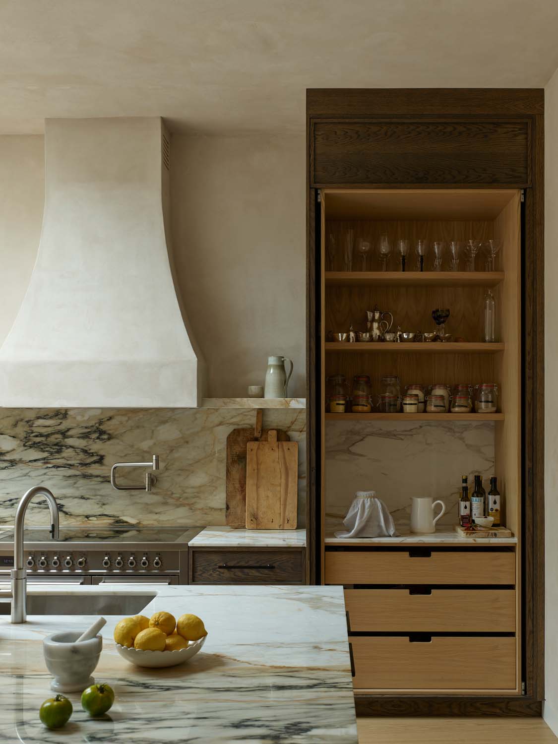 The colour palette here is soothing and understated. Another intricately veined slab of marble – its swirls reminiscent of a painting – adds a flourish to the functional splashback, while clay plaster gives the walls and ceiling a tactile finish. All cabinetry is custom-made – note the two convenient pantry stations that can be closed off from view behind pocket doors. When the weather obliges, triple-glazed doors slide open to the private garden – or enjoy the view from the picture window’s striped banquette.
