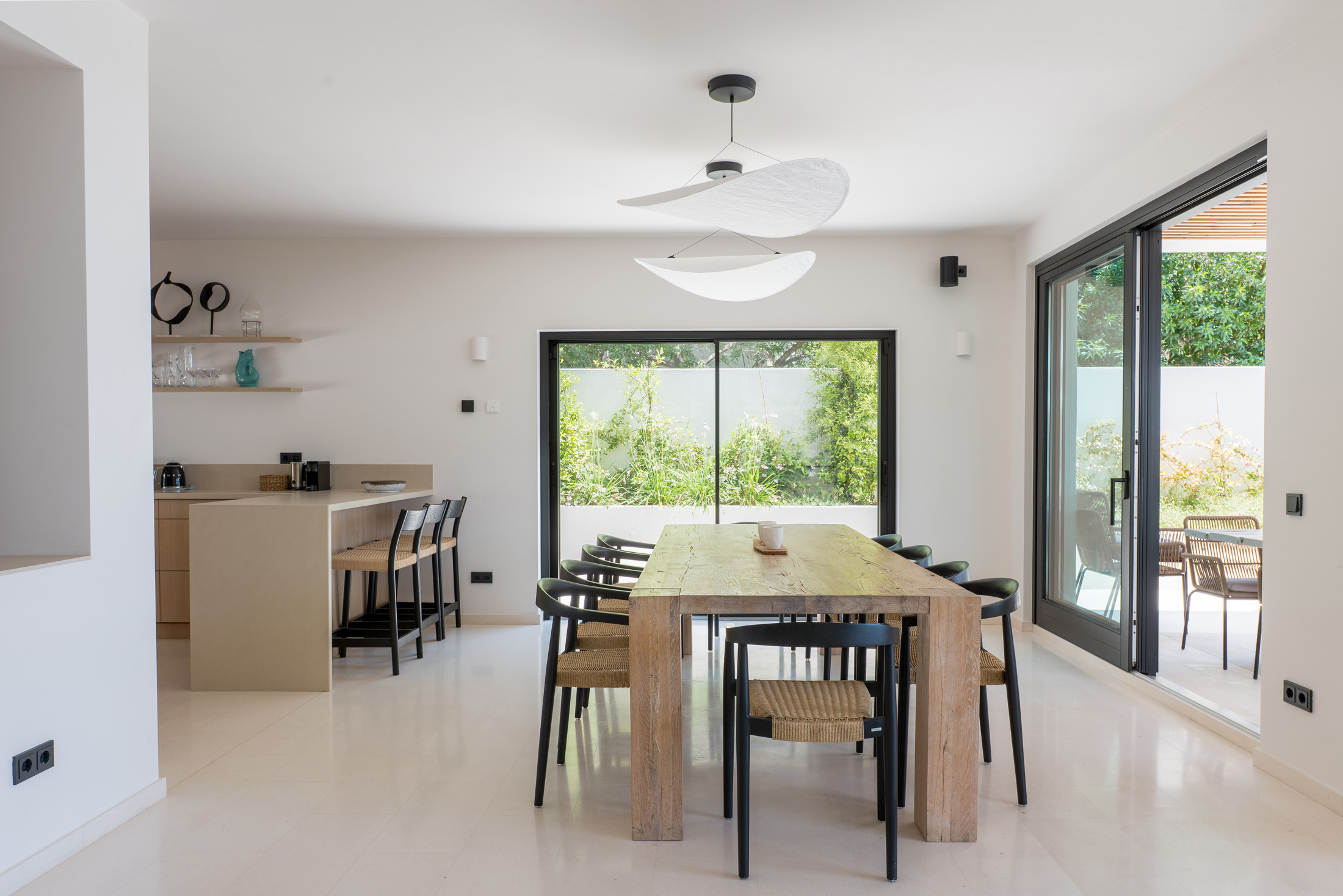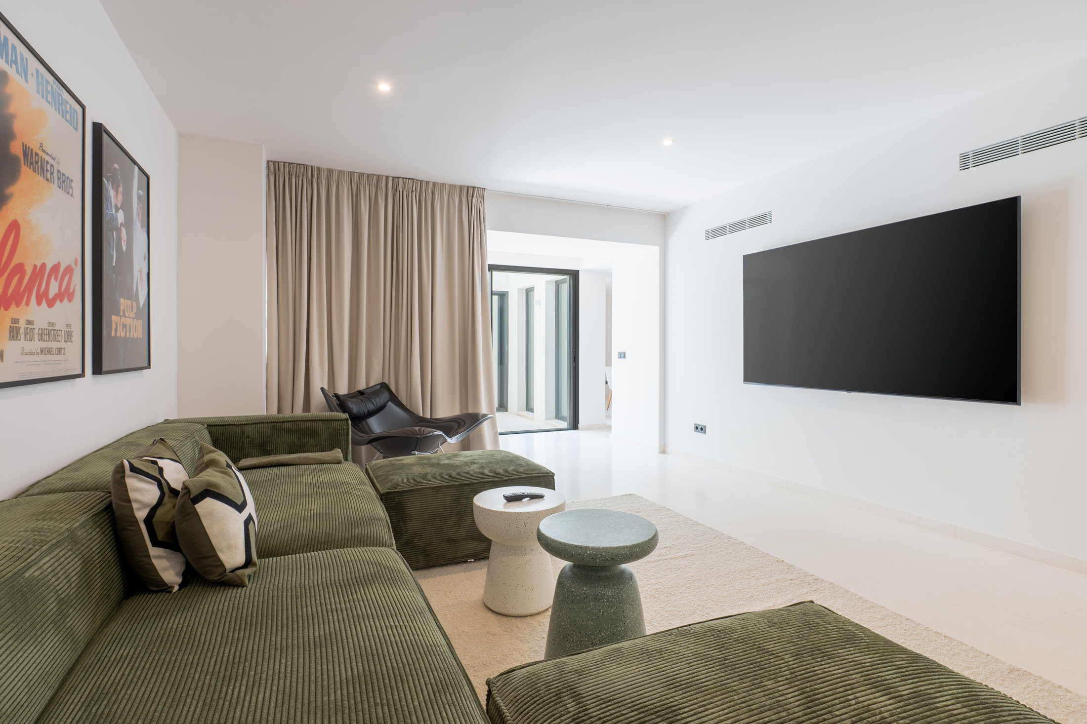 From the terrace, sliding glass doors push back to reveal a seamless open-plan living space. A wall of sleek wooden cabinetry anchors the kitchen, its minimalist design balanced by warm countertops and an elegant waterfall breakfast bar. Fully equipped with integrated appliances, it balances form and functionality. Adjacent, a dining table for 10 sets the scene for convivial dinners, while an expansive L-shaped sofa faces the fireplace – ideal for cooler evenings, framed by floor-to-ceiling views of the sea. Downstairs, a cinema room and home office add versatility.