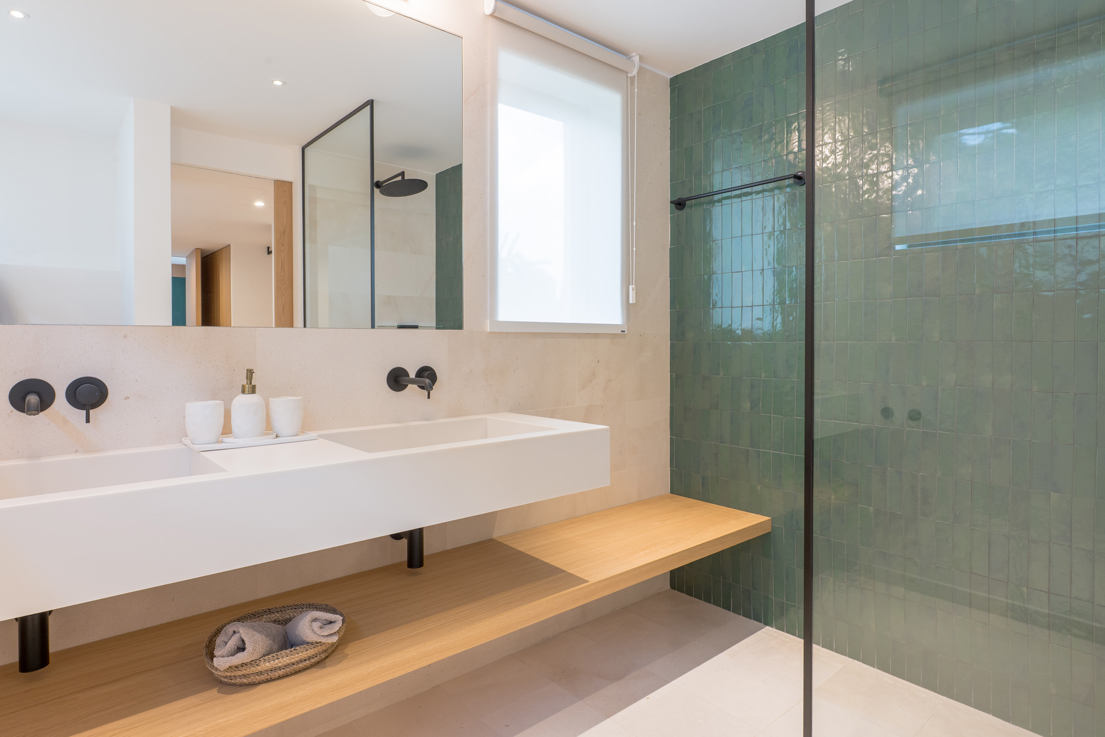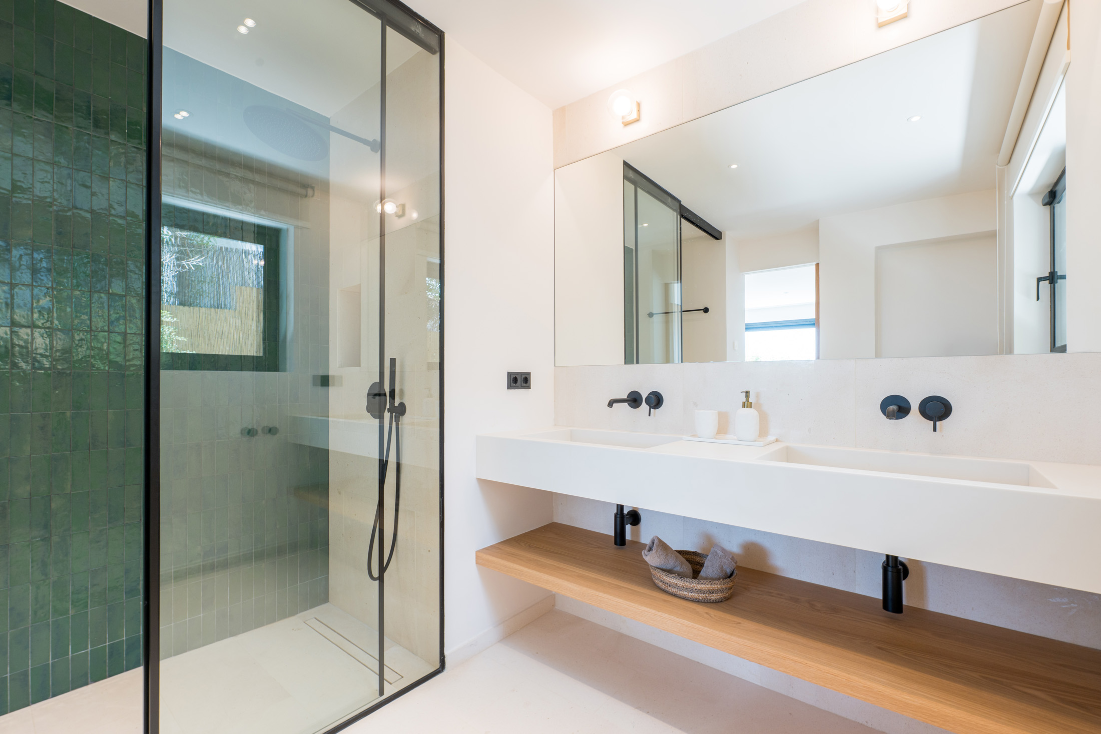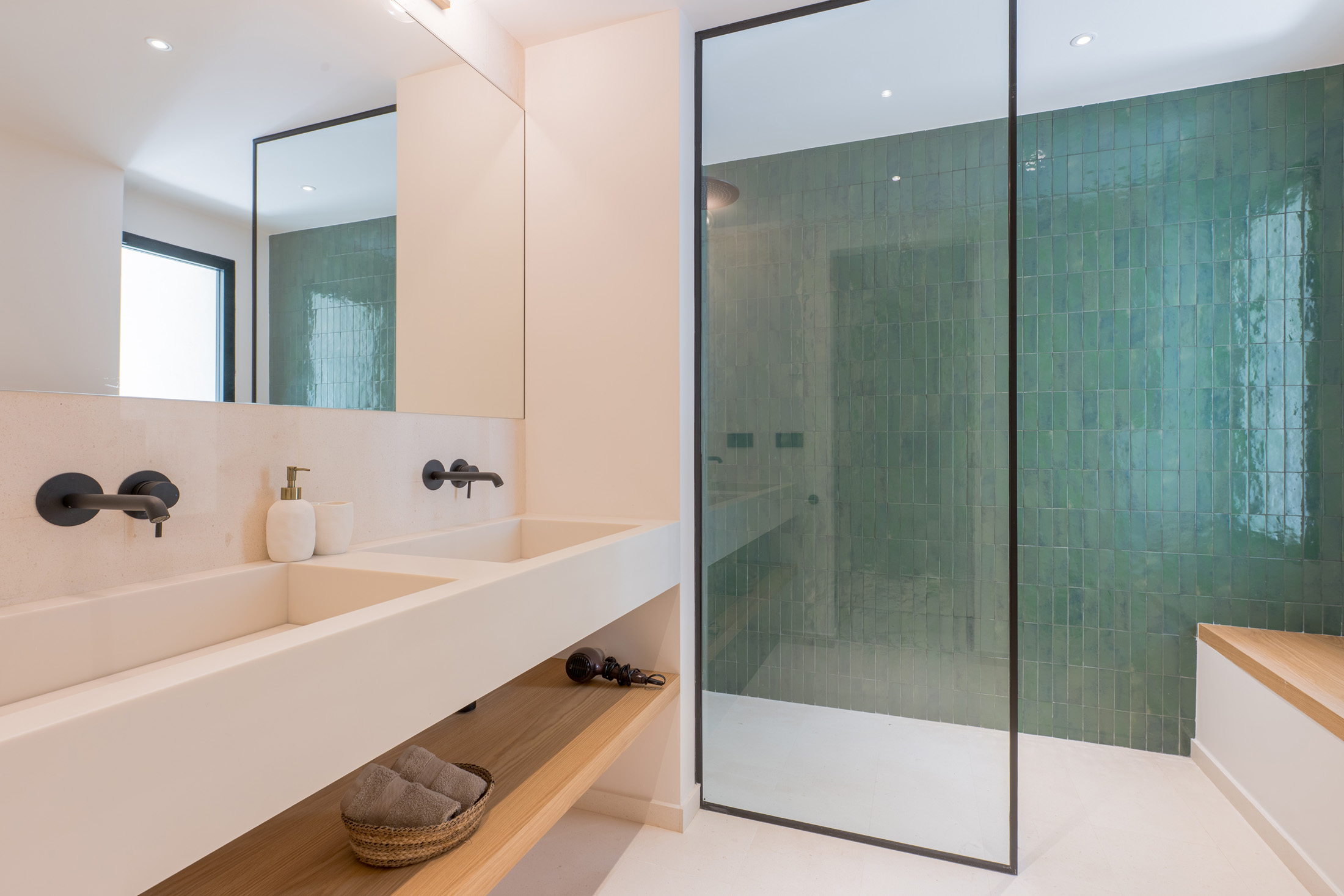 The upper level is dedicated to rest and retreat. The principal suite occupies a south-east facing position, its French doors opening to a terrace for soaking up the sunrise. Through a dedicated dressing area lies a serene en suite, finished in turquoise tiles and natural textures. Two further bedrooms share the same elevated outlook and refined palette, with access to a panoramic terrace.