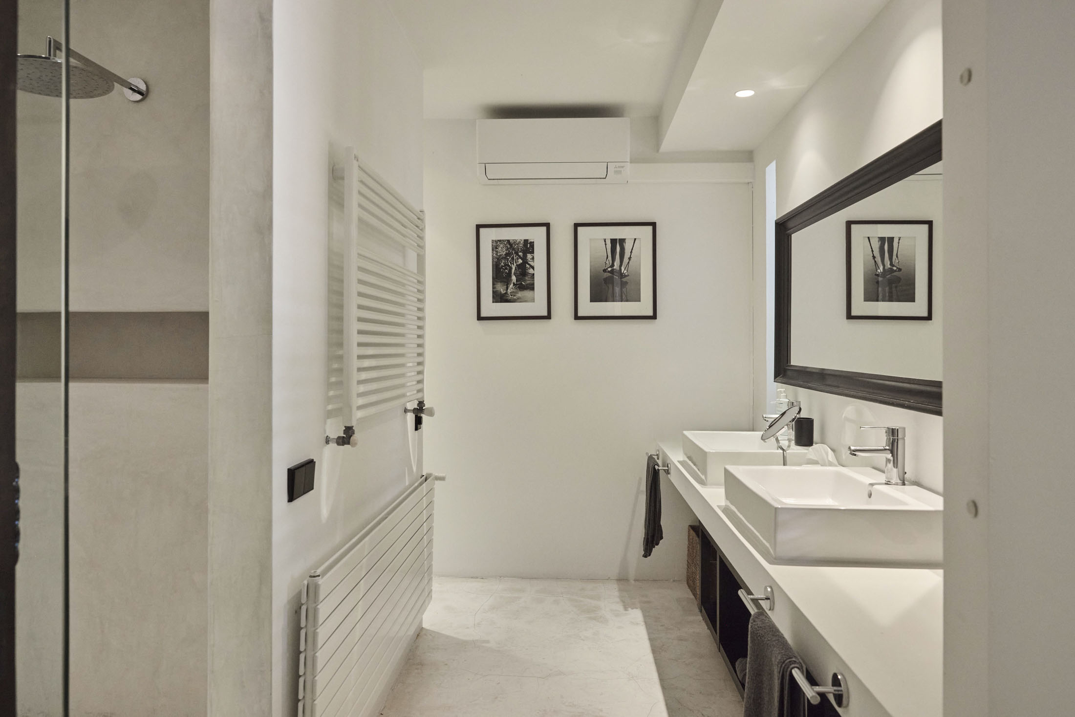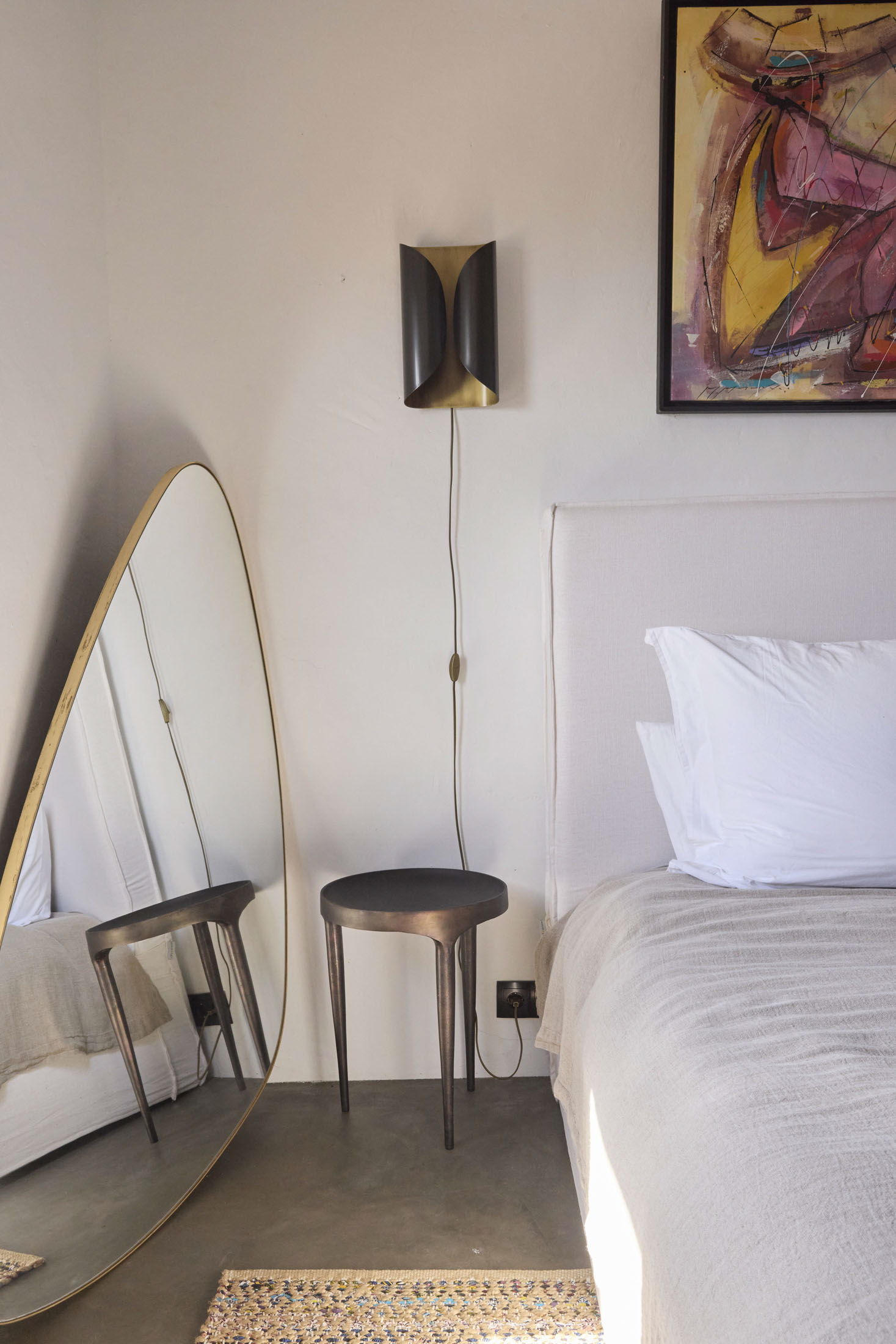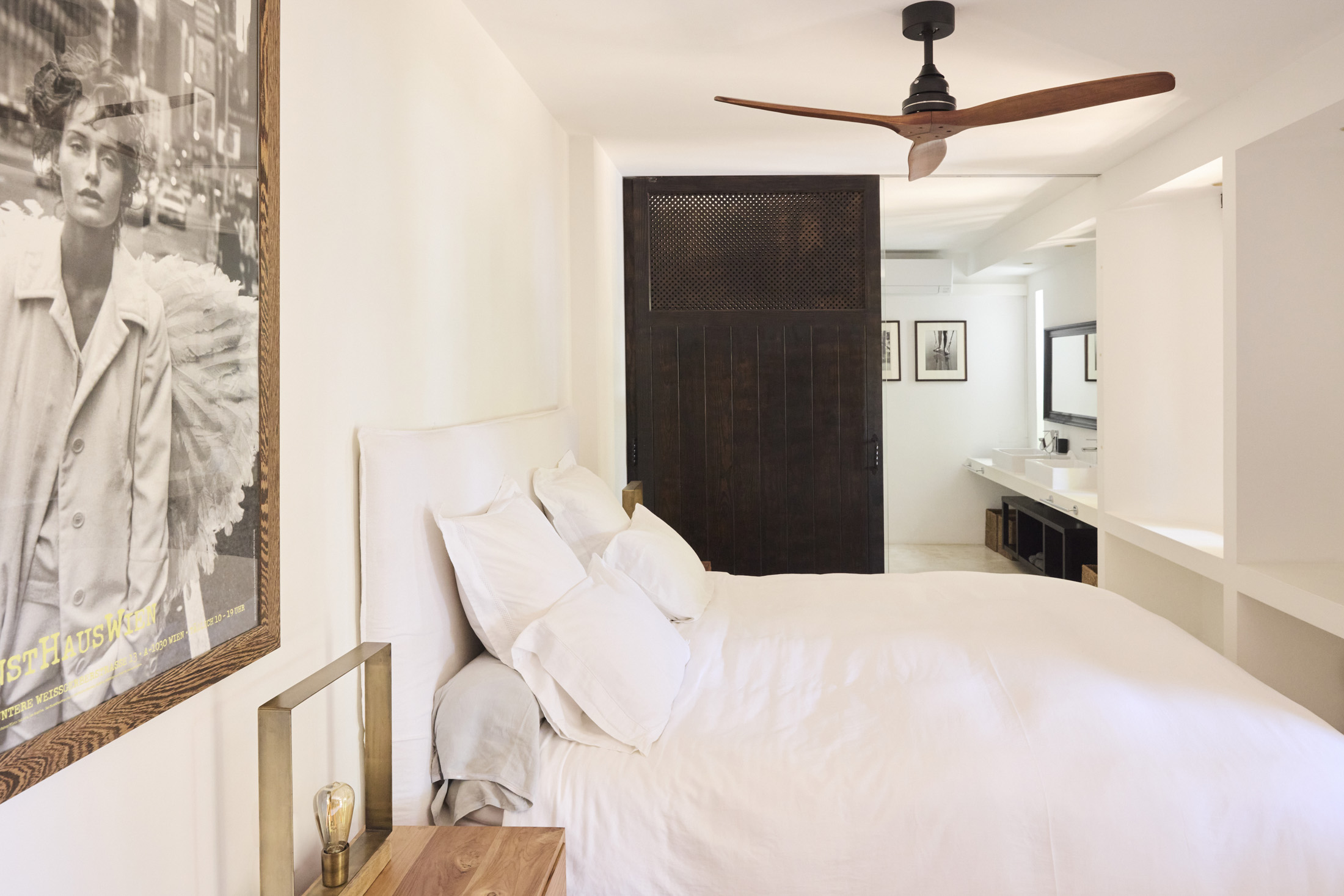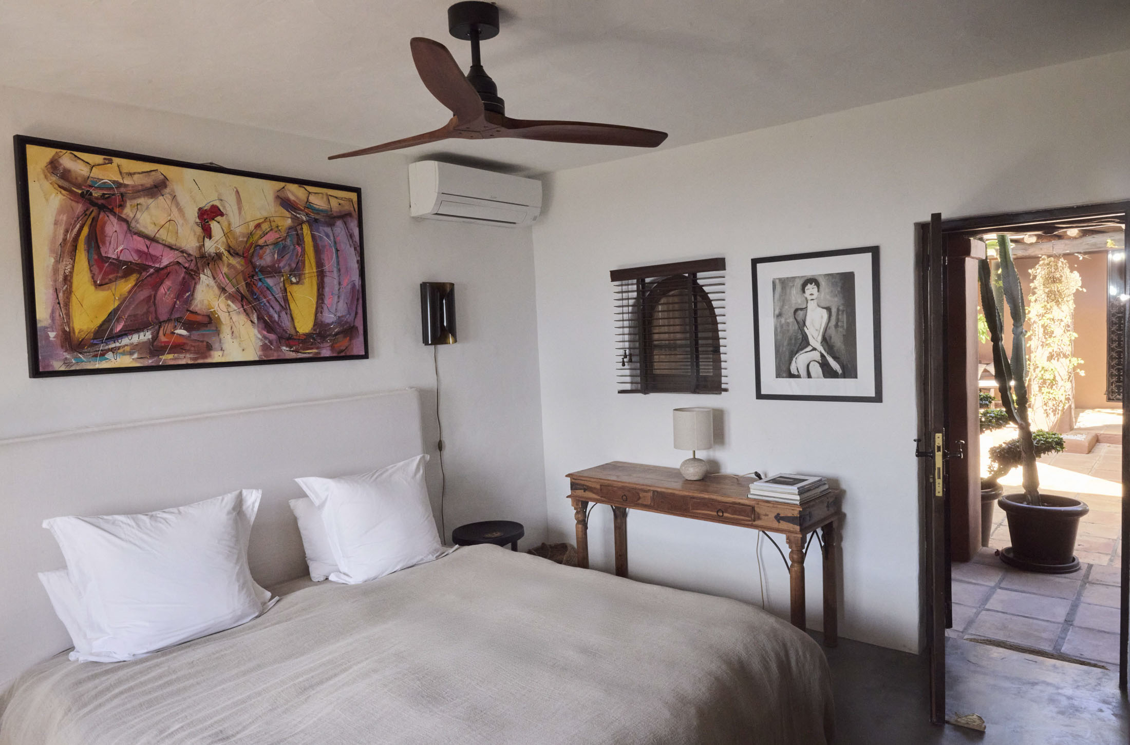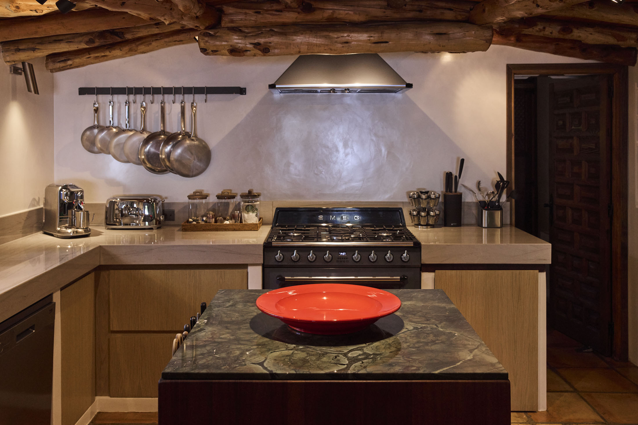 Back inside, interior design balances the rustic with the contemporary. Natural light pours across whitewashed walls and bold artwork, while sightlines draw you instinctively to the water. The open-plan kitchen is finished with organic materials: eye-catching Sabina beams above, surrounded by smooth marble countertops. A Smeg range oven, wine cellar and walk-in refrigerator are as functional as they are stylish.