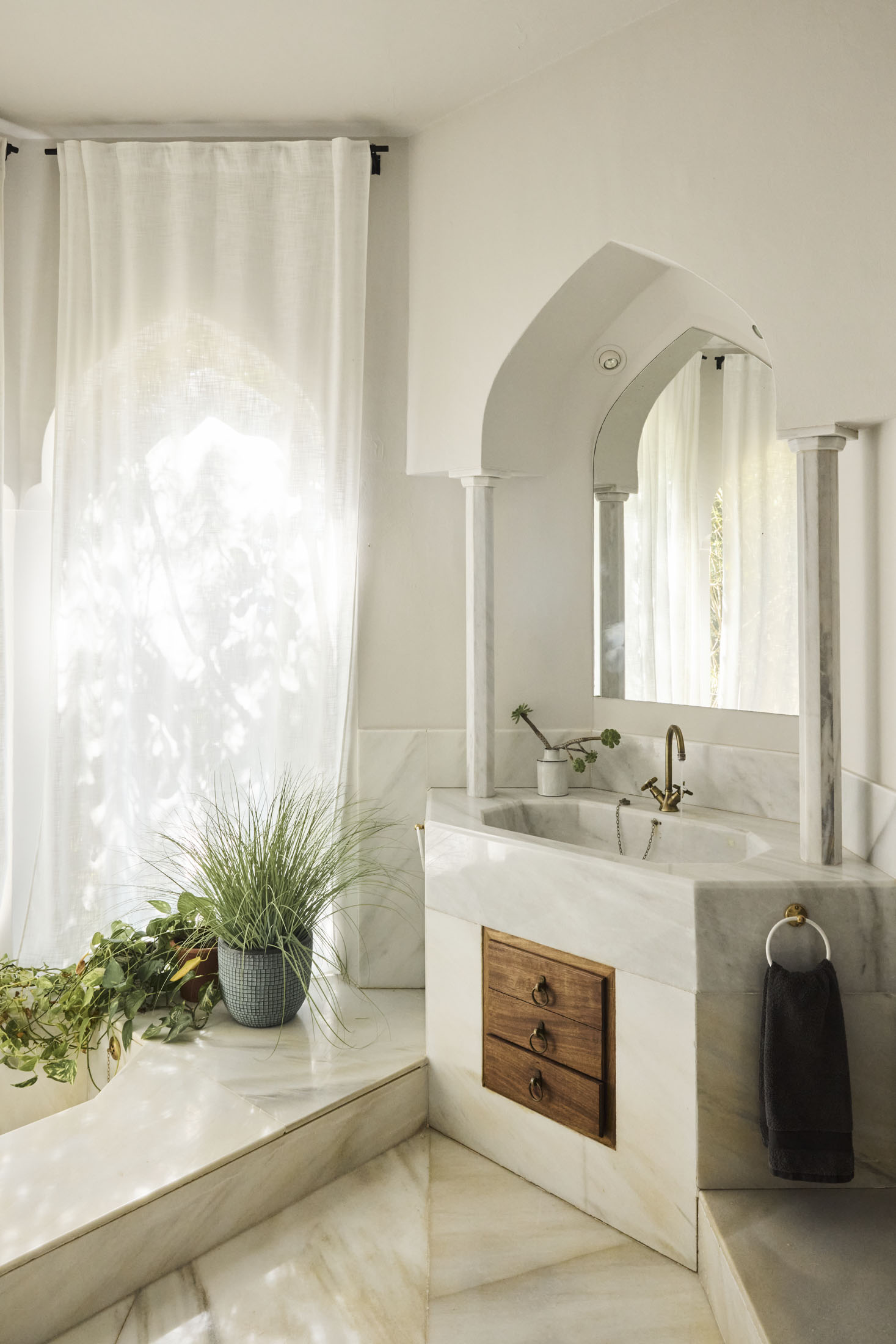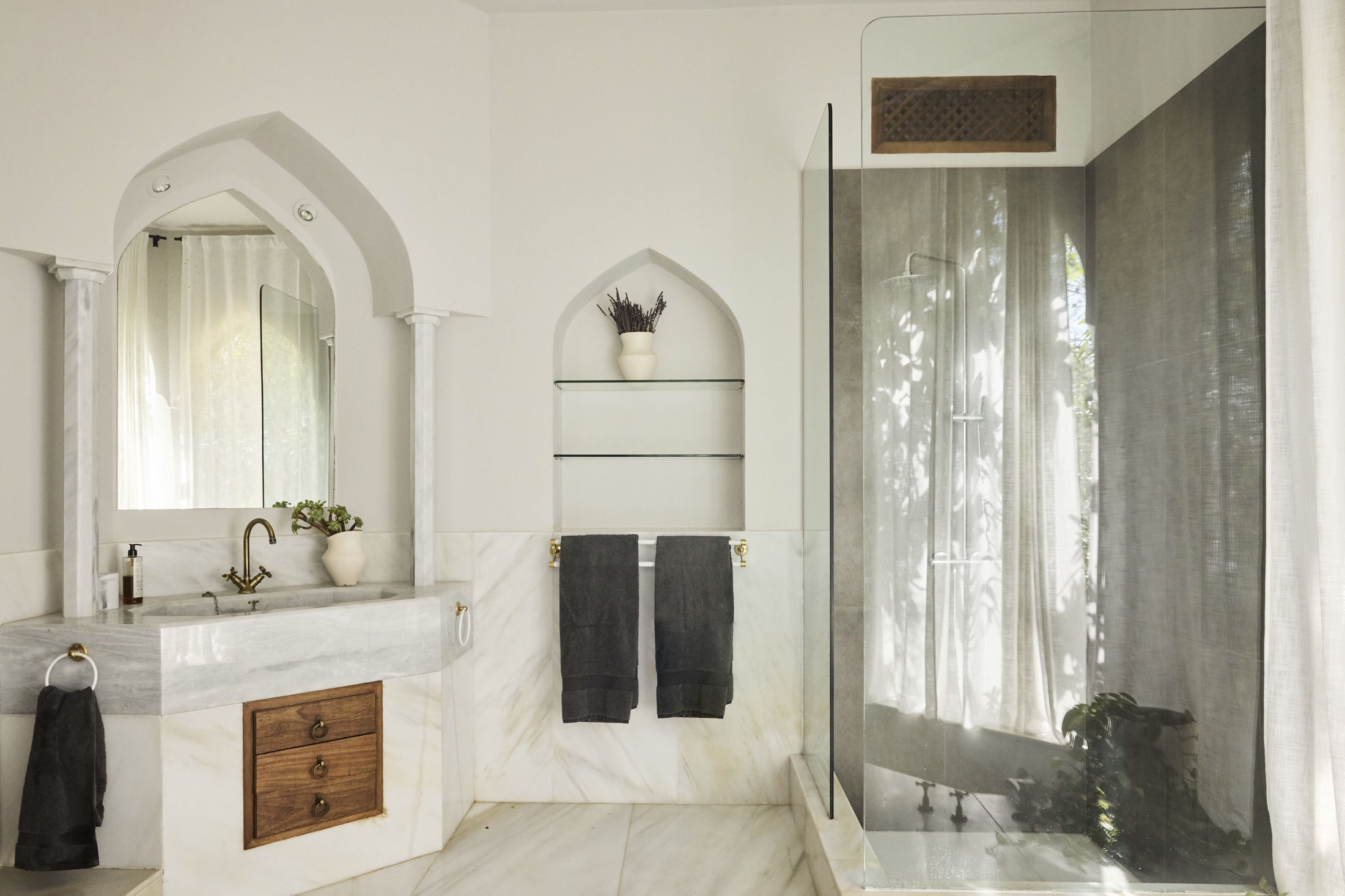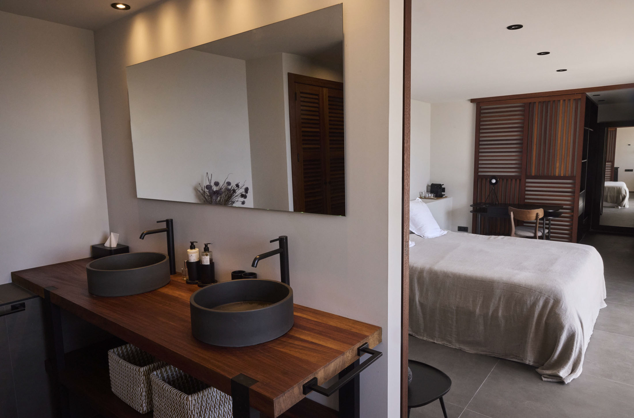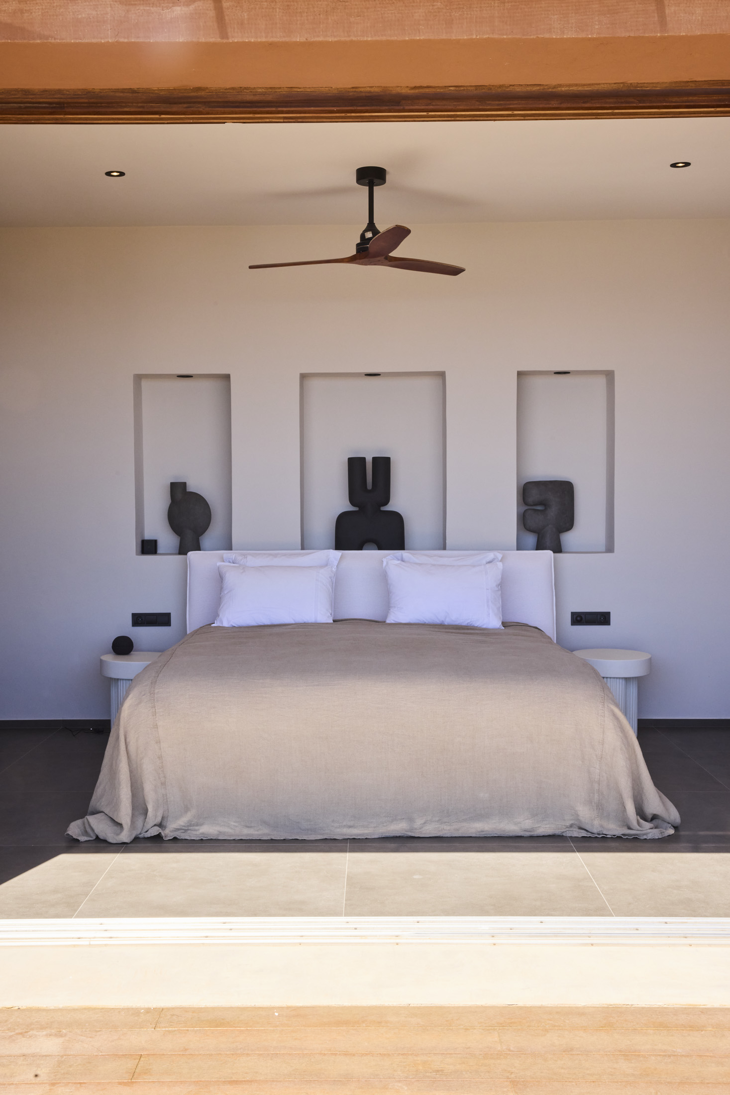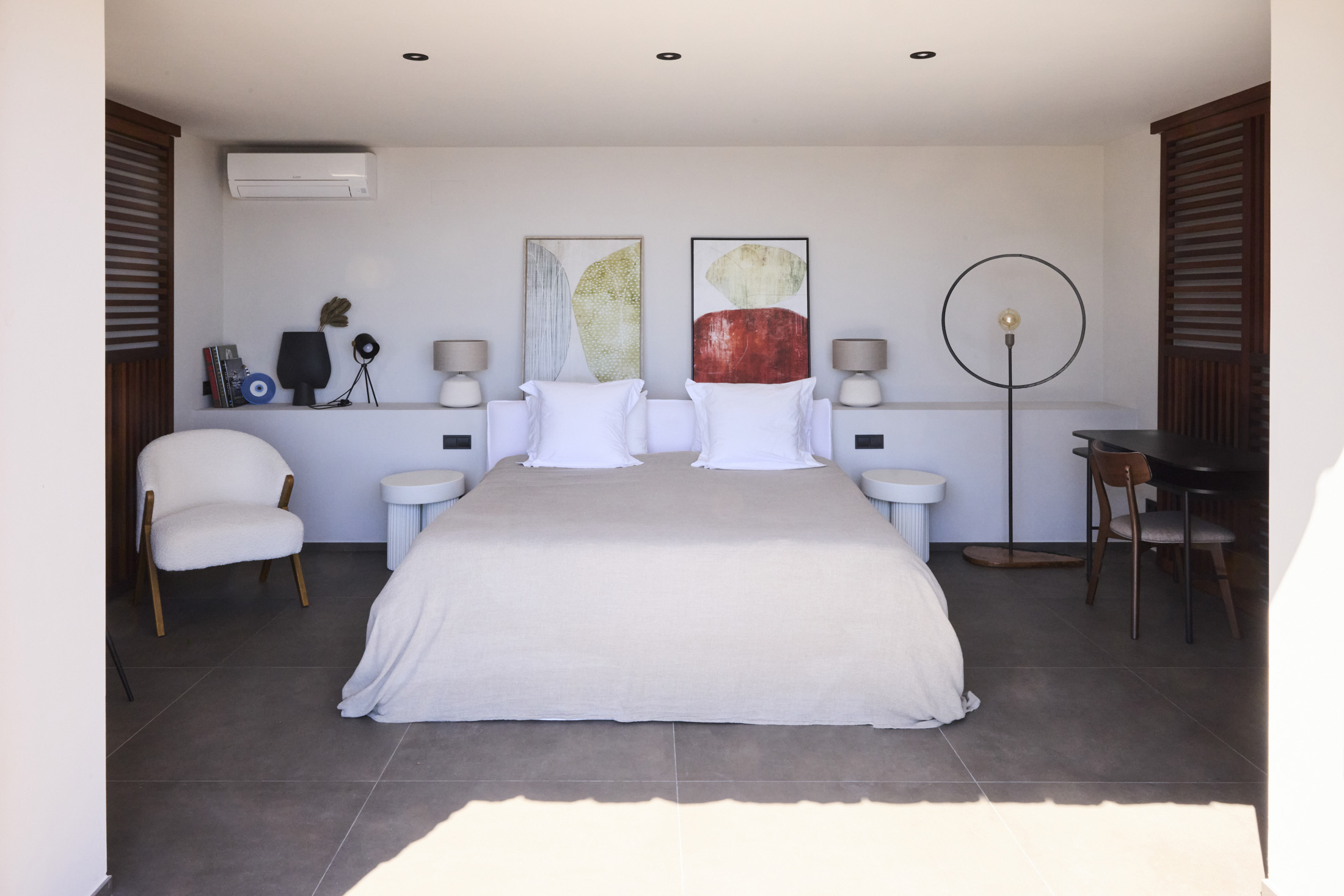 Across the grounds, five bedroom suites are arranged for privacy, each with its own connection to the scenery. Three suites have independent entrances, making the villa as practical as it is picturesque. The principal suite is a standout – vast doors pull back so you wake to an uninterrupted sea view, with a private terrace to soak it in from sunrise to nightfall. Elsewhere, the en suite bathroom is elevated with smooth white stone. A second bedroom suite pairs sweeping panoramas with a spa-like en suite, while others feature walk-in dressing rooms and secluded courtyards.