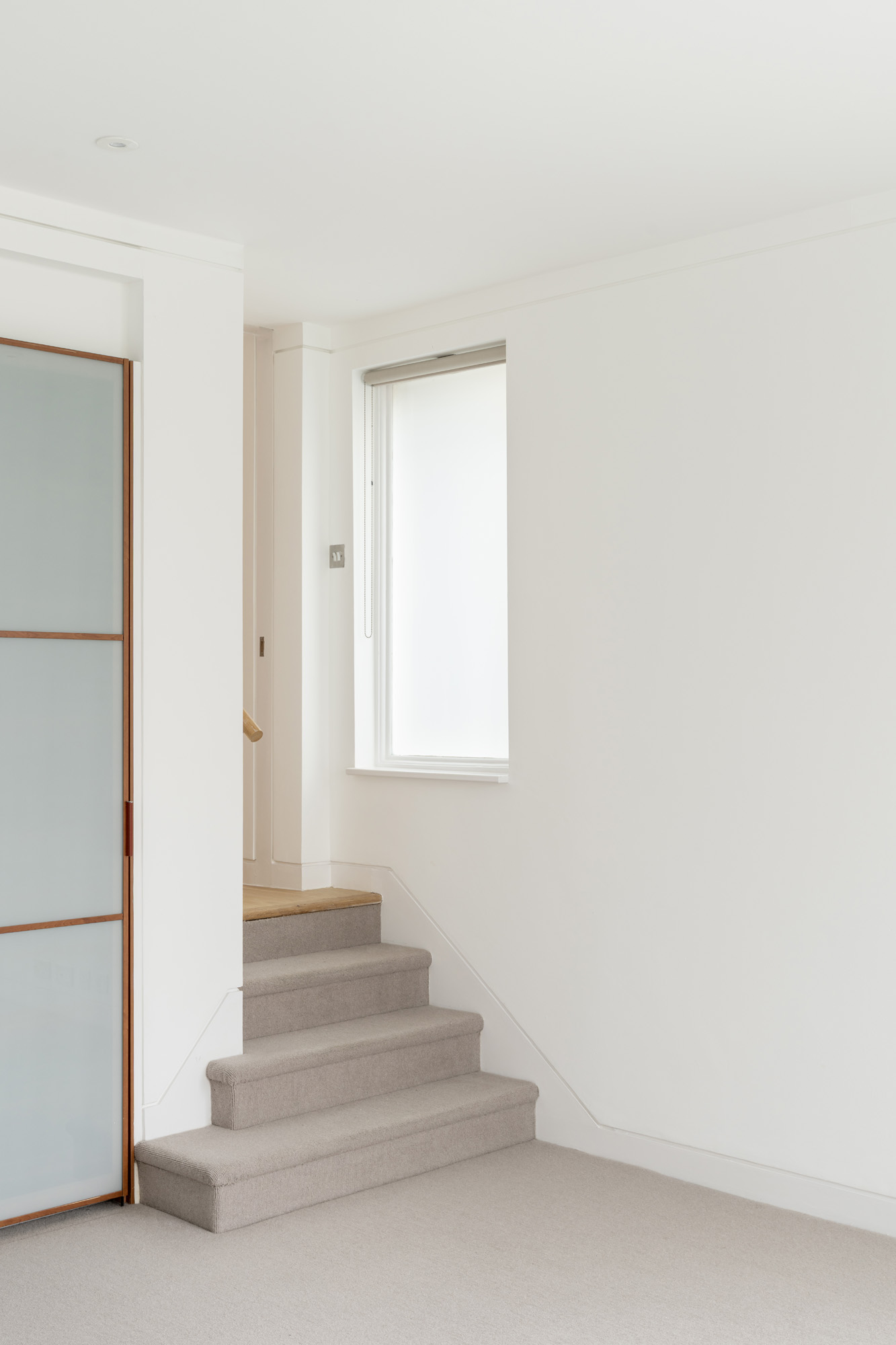 Another pair of double doors lead from the reception room into a more intimate communal space, fitted with floor-to-ceiling storage, a compact modern fireplace and access to a third balcony. From here, steps descend to the principal bedroom suite, where the restrained palette continues. Its en suite bathroom is generous and serene, with a tiled bath, separate shower and direct access to the balcony overlooking the gardens. On the floor below, a guest bedroom suite echoes the same calm aesthetic and thoughtful layout.