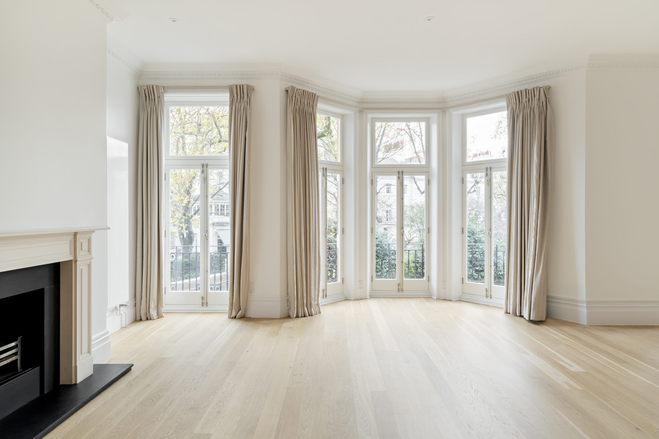 Stretching from floor to ceiling, the windows flood the space with natural light, illuminated oak floors, white walls and marble fireplaces at either end.
