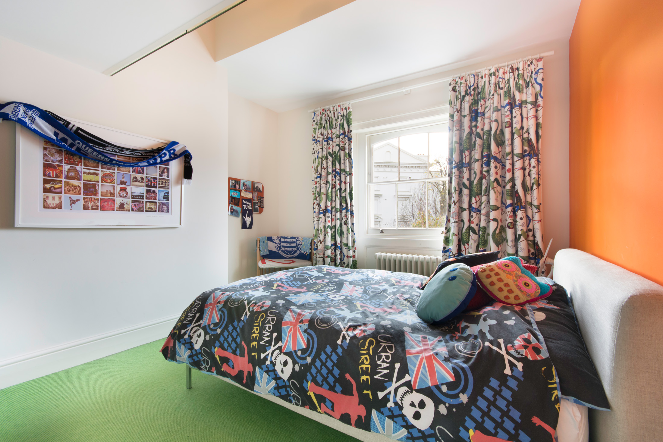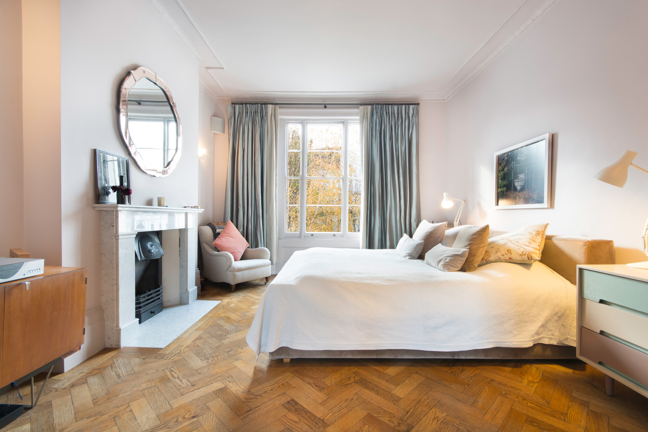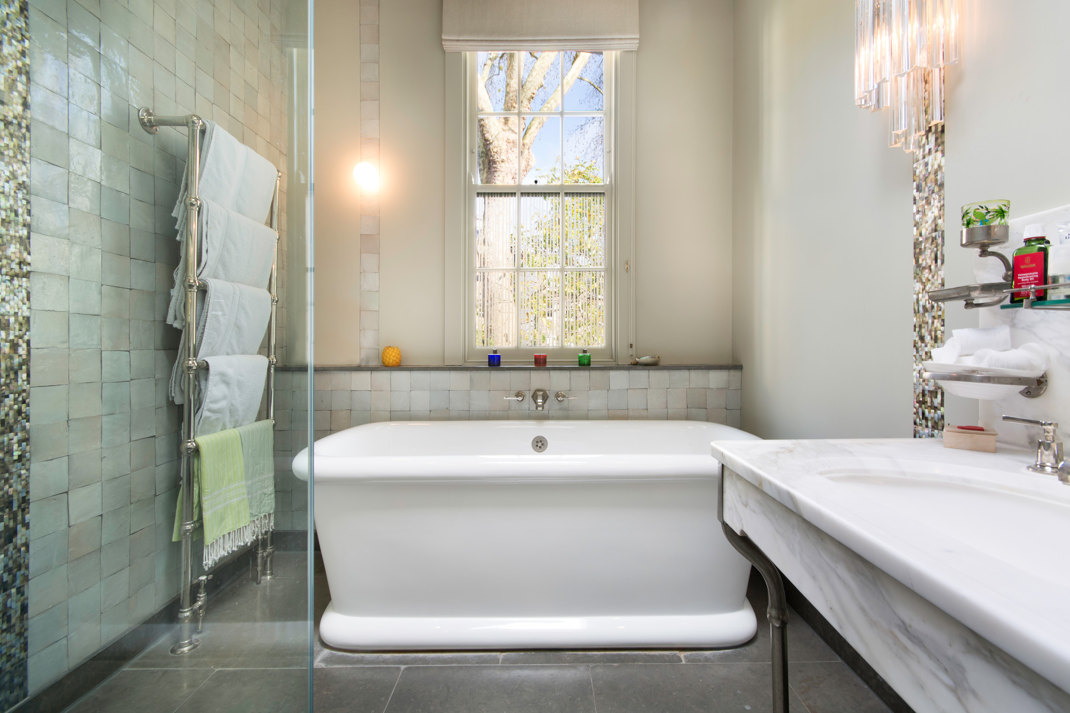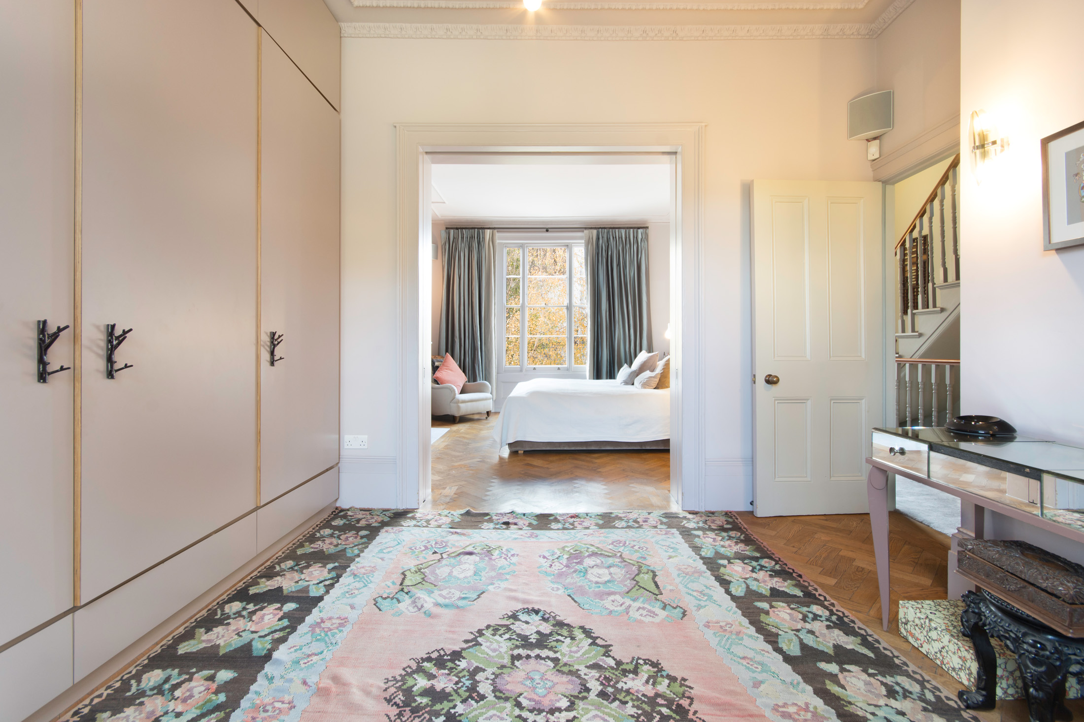 The principal suite takes over the entire first floor. Calm in palette and refined in detail, it features a marble-surround fireplace, a bespoke dressing room with tall blush-toned cabinetry, and a luxurious en suite with a roll-top bath and rainfall shower. Three additional bedrooms on the second floor are served by a striking green-tiled bathroom, while a further bedroom lies on the lower ground floor – ideal for guests or live-in staff.