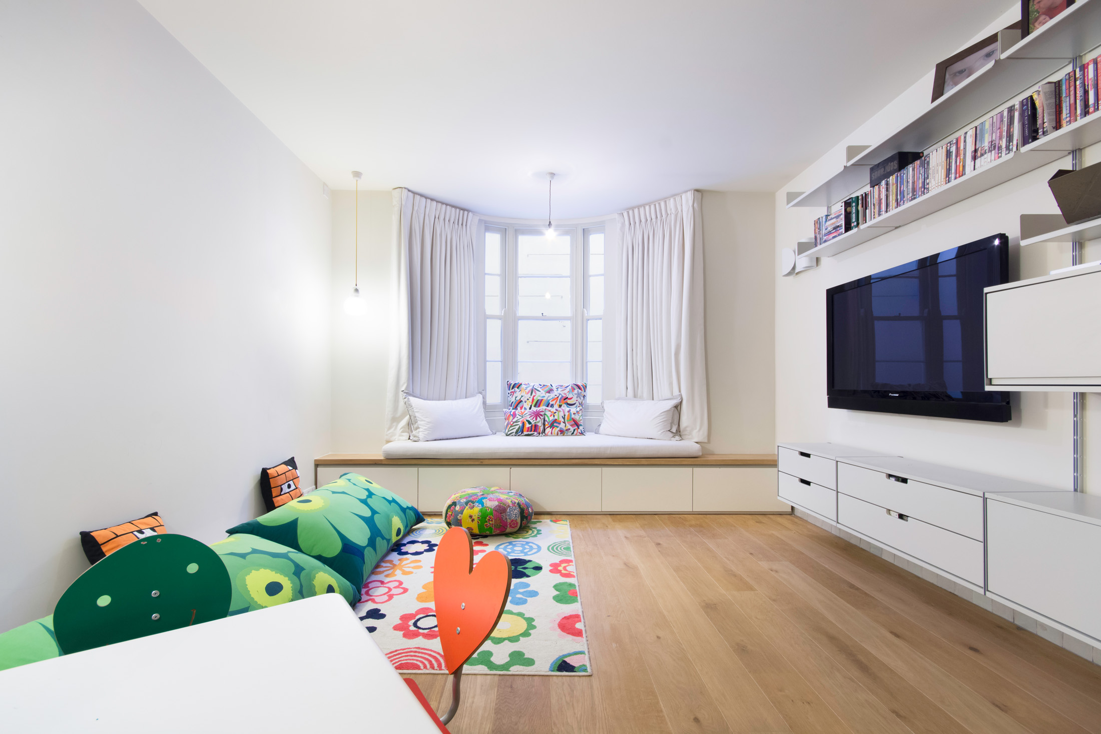 The ground floor has been conceived as a generous social hub. At one end, a tall sash window fills the reception space with light, where warm wood floors and a marble fireplace set a welcoming scene. At the other, a contemporary kitchen is framed in deep cabinetry and veined stone, anchored by a painted brick wall. A skylight channels sunlight over the dining area, while bi-fold doors extend the space onto a large garden – note the built-in bench seating for effortless summer gatherings. Flexible living options extend downstairs: a media room invites easy downtime, while a dedicated study and utility room lend further practicality.