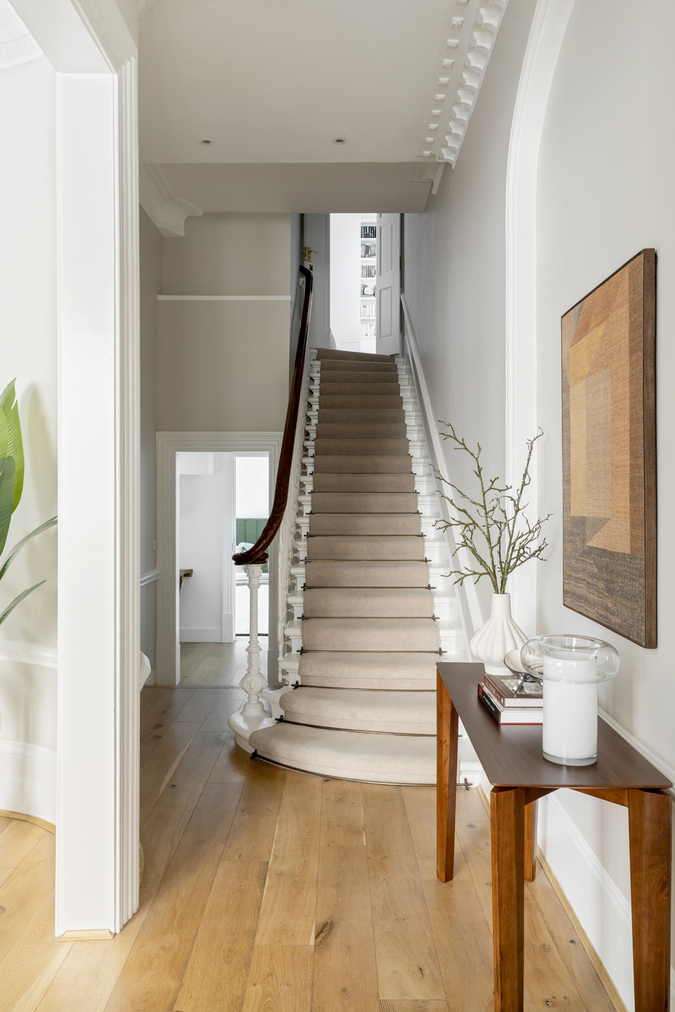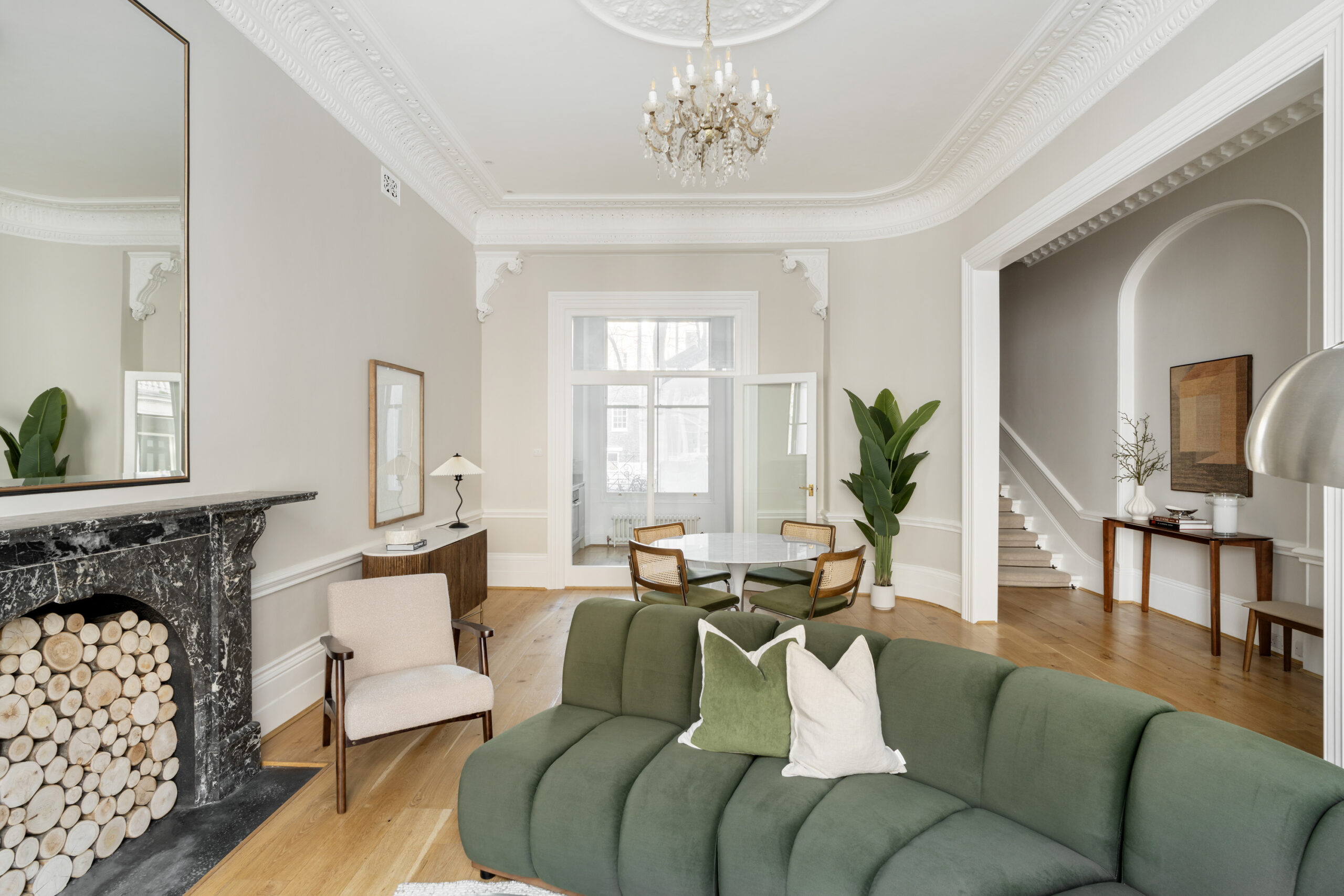 Set behind a stucco-fronted façade on a quiet street just moments from Notting Hill Gate, this duplex on Clanricarde Gardens immediately captivates. From its portico entrance to the elegant interplay of heritage and contemporary design, the home is a masterclass in refined renovation.
