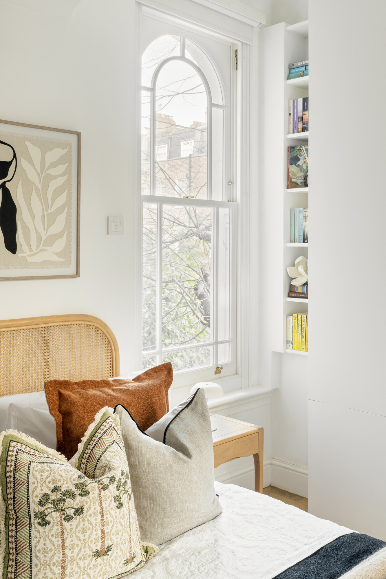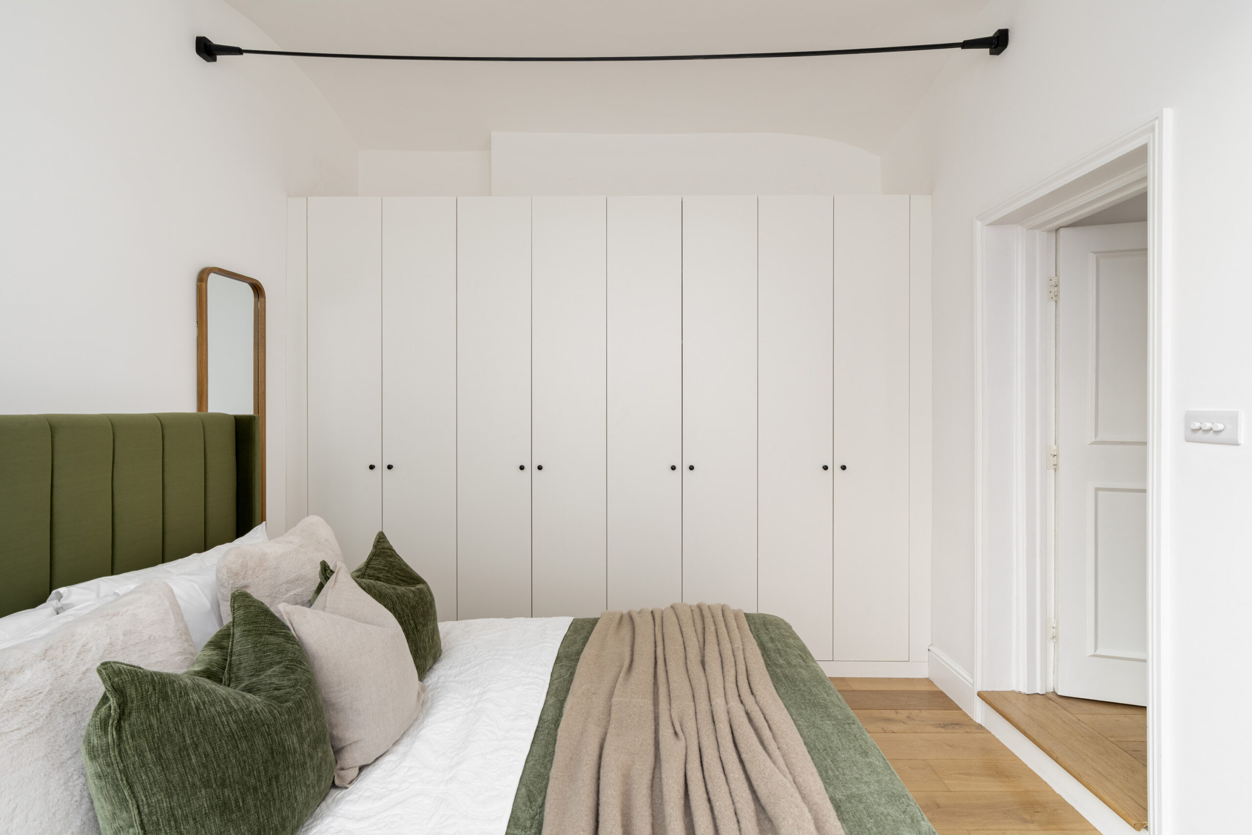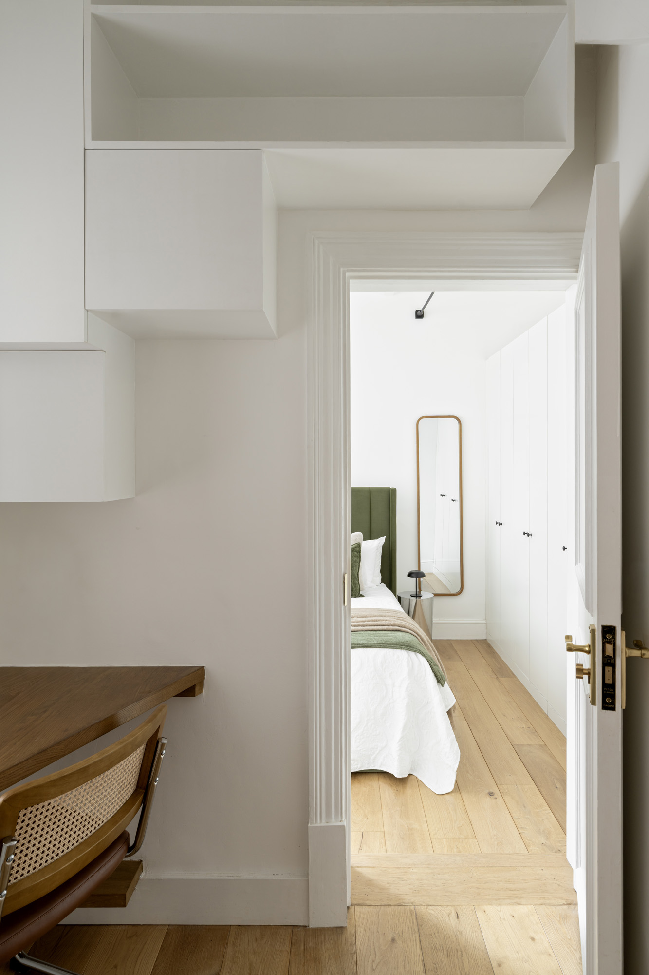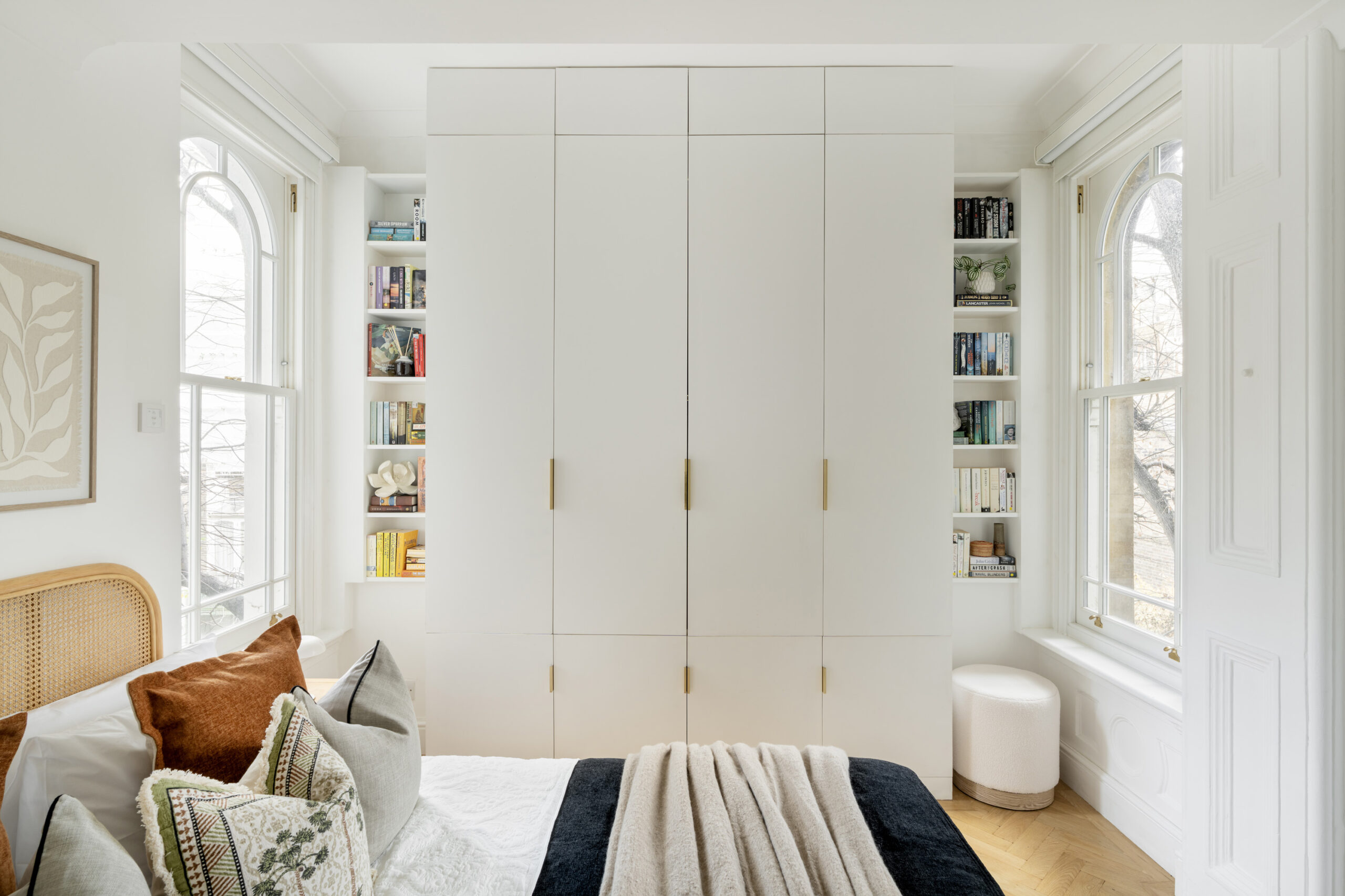 Occupying the entire first floor, the principal bedroom suite is an elevated sanctuary. Carpeted stairs transition to herringbone wood flooring, while a double-height ceiling soars overhead, emphasising the room’s sense of space. Full-height wardrobes flanked by integrated bookshelves create a seamless balance of storage and style. Arched sash windows bookend the space, offering leafy views, while the en suite echoes the refined aesthetic – marbled tiles paired with sleek black accents.