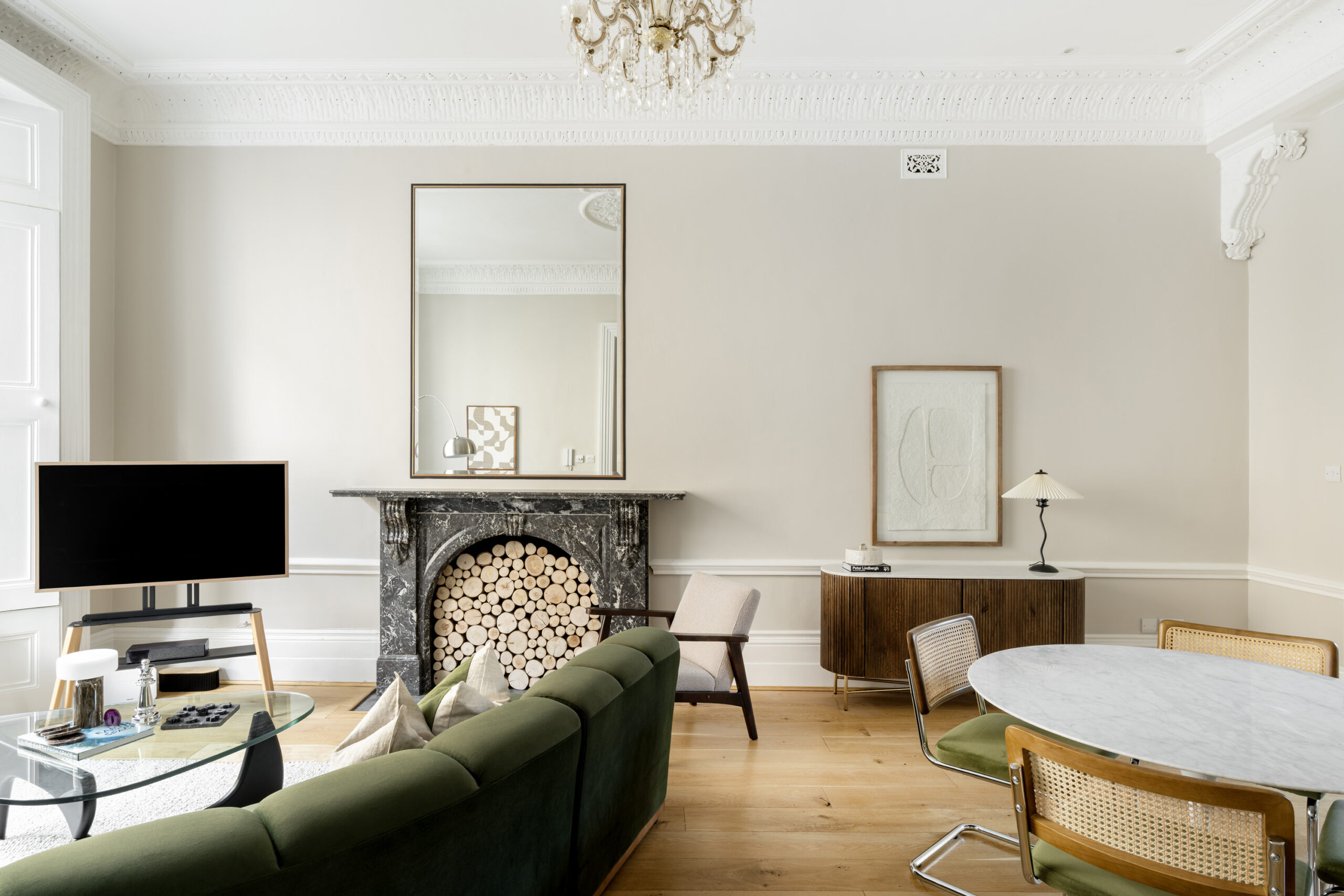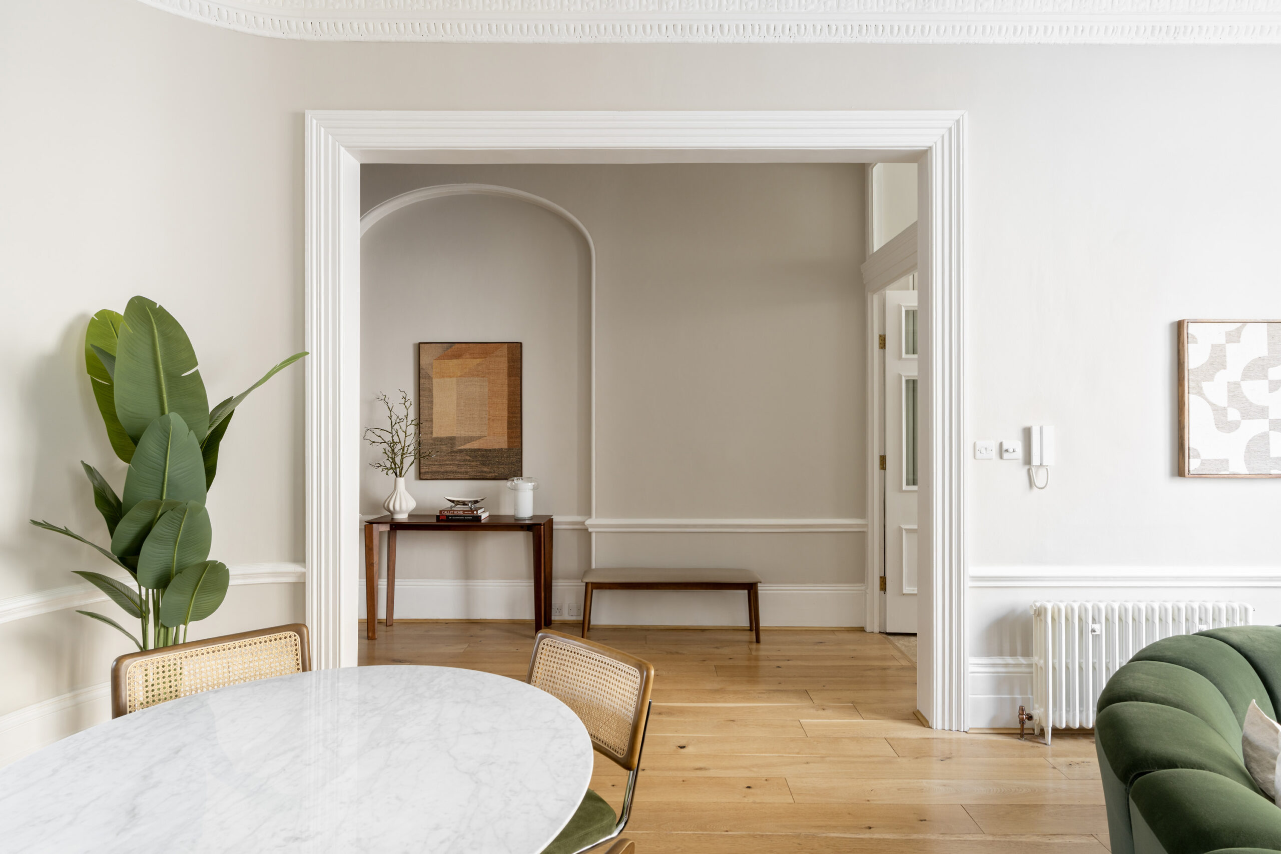 Entering to the raised ground floor, the reception room sets the tone: expansive, light-filled and intricately detailed. Natural light floods through a generous bay window, highlighting the ornate ceiling rose, decorative cornicing and warm hardwood floors. An arched antique marble fireplace anchors the space – a traditional centrepiece softened by neutral tones. Beyond sliding glass doors, the kitchen enjoys integrated Miele appliances and modern design. A tall sash window frames a peaceful view over the private patio and neighbouring gardens.