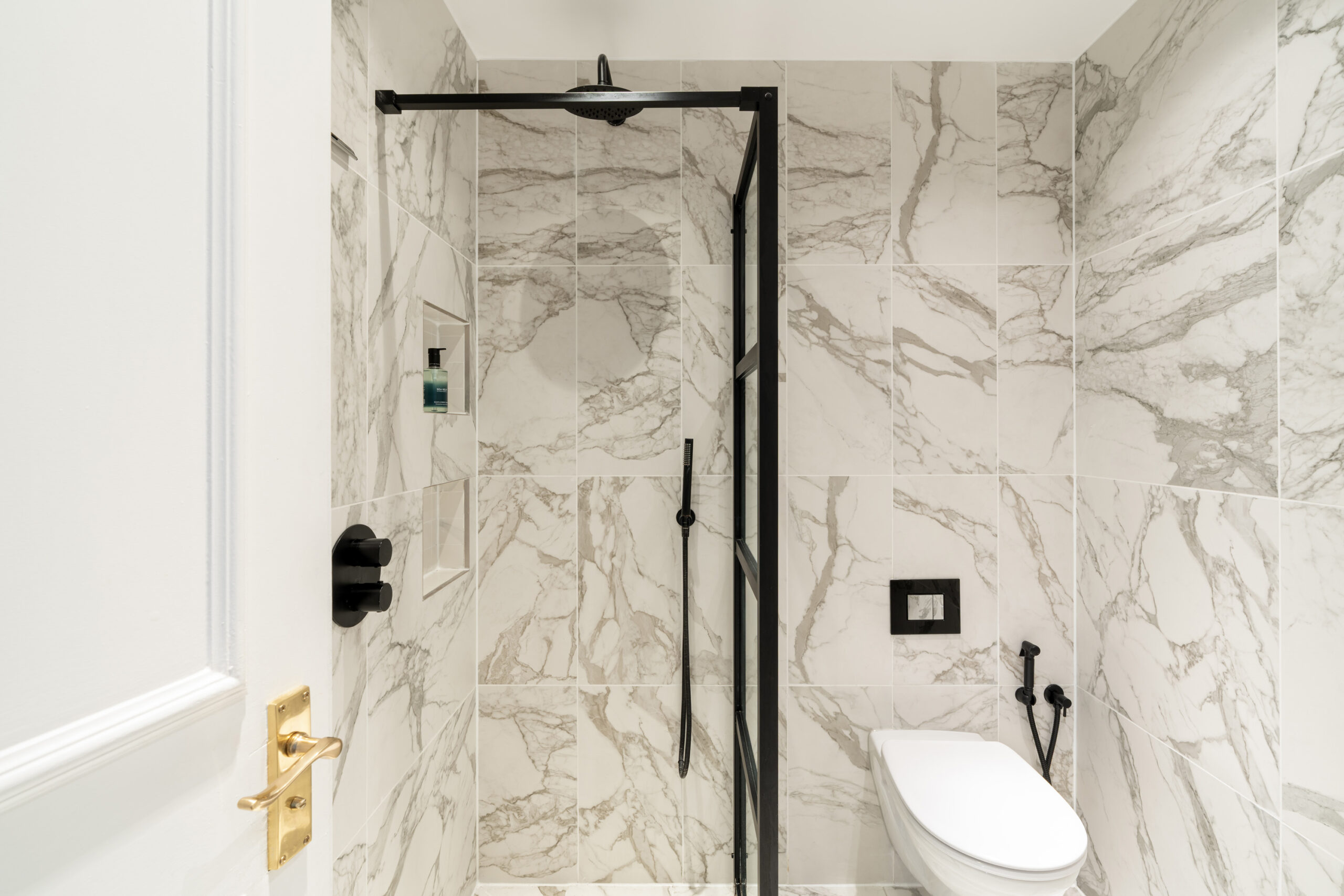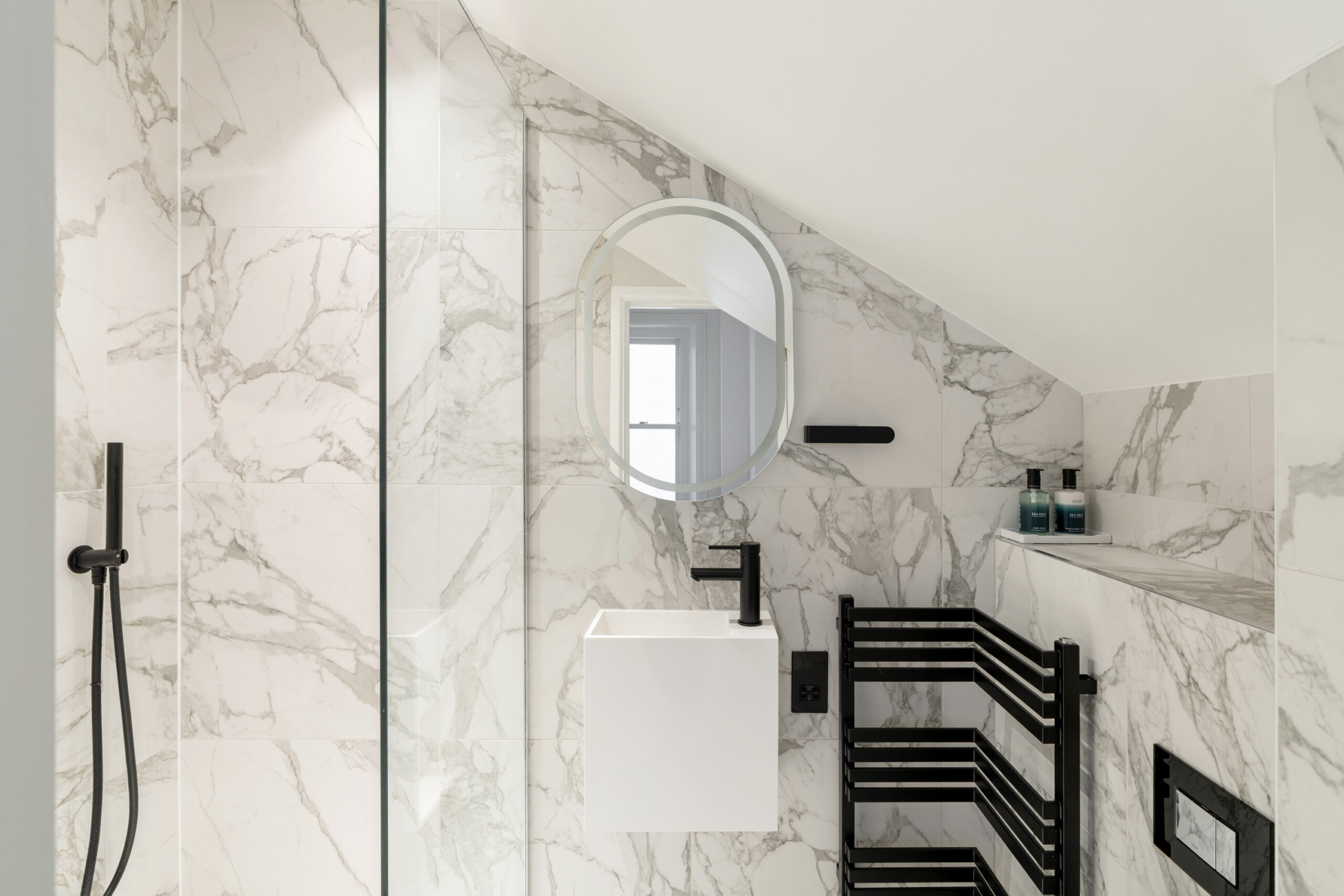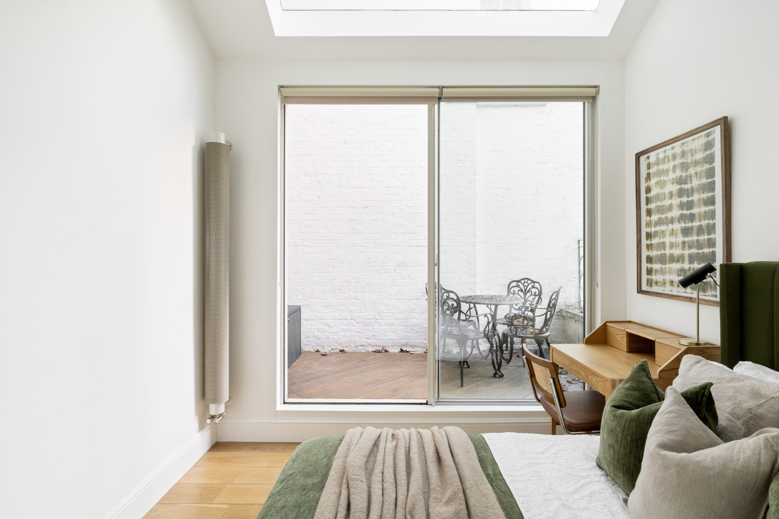The sense of considered design continues into the guest bedroom suite. A skylight overhead and sliding glass doors onto the private patio infuse the space with natural light, while a vertical radiator and wall of bespoke wardrobes add function and form. The adjoining en suite is wrapped in veined tiles and finished with matte black hardware, including a rainfall shower and towel rail.