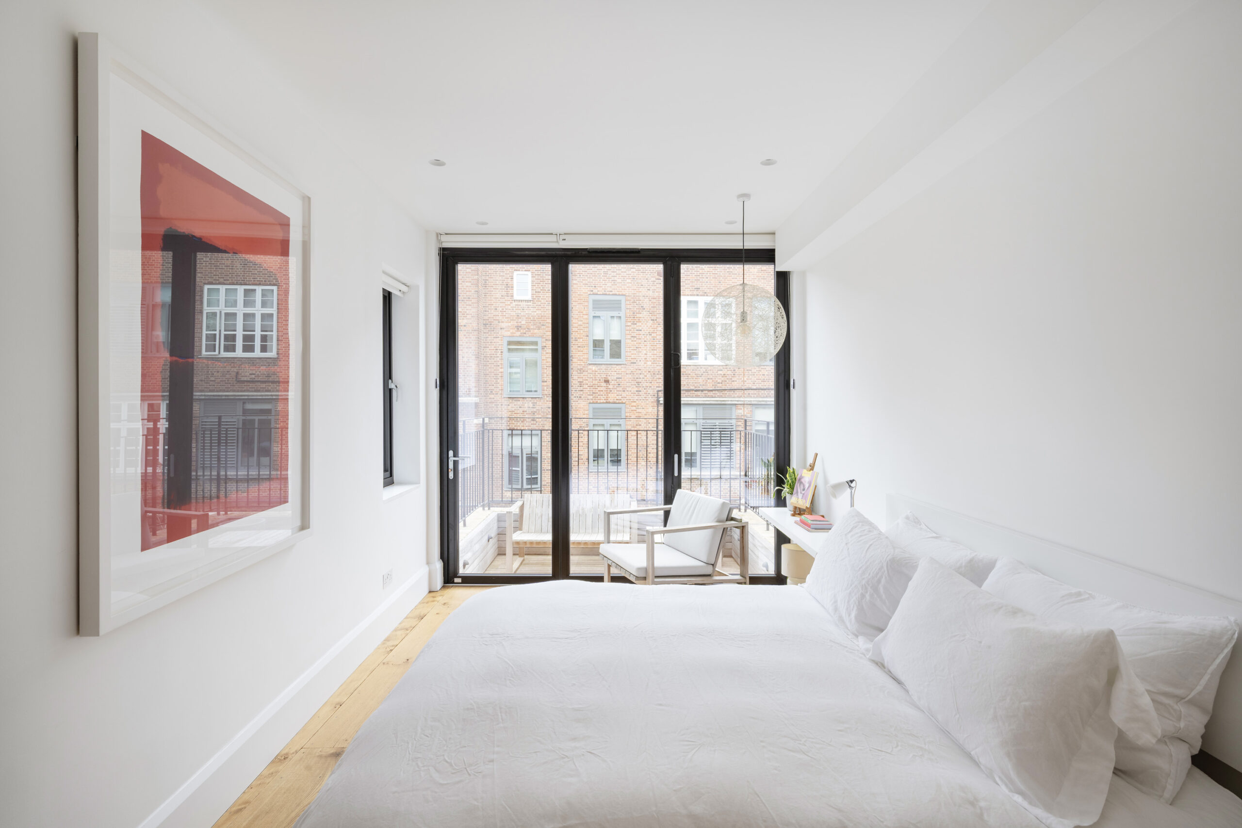 The principal bedroom is a minimalist sanctuary with a Dux double bed, with a wall of bi-folding windows that open directly onto a private roof terrace. Here, Carl Hansen teak furniture makes the space perfect for al fresco dining or quiet afternoon reading. Come evening, ambient lighting is guaranteed with the Marcel Wanders Moooi Random pendant light.