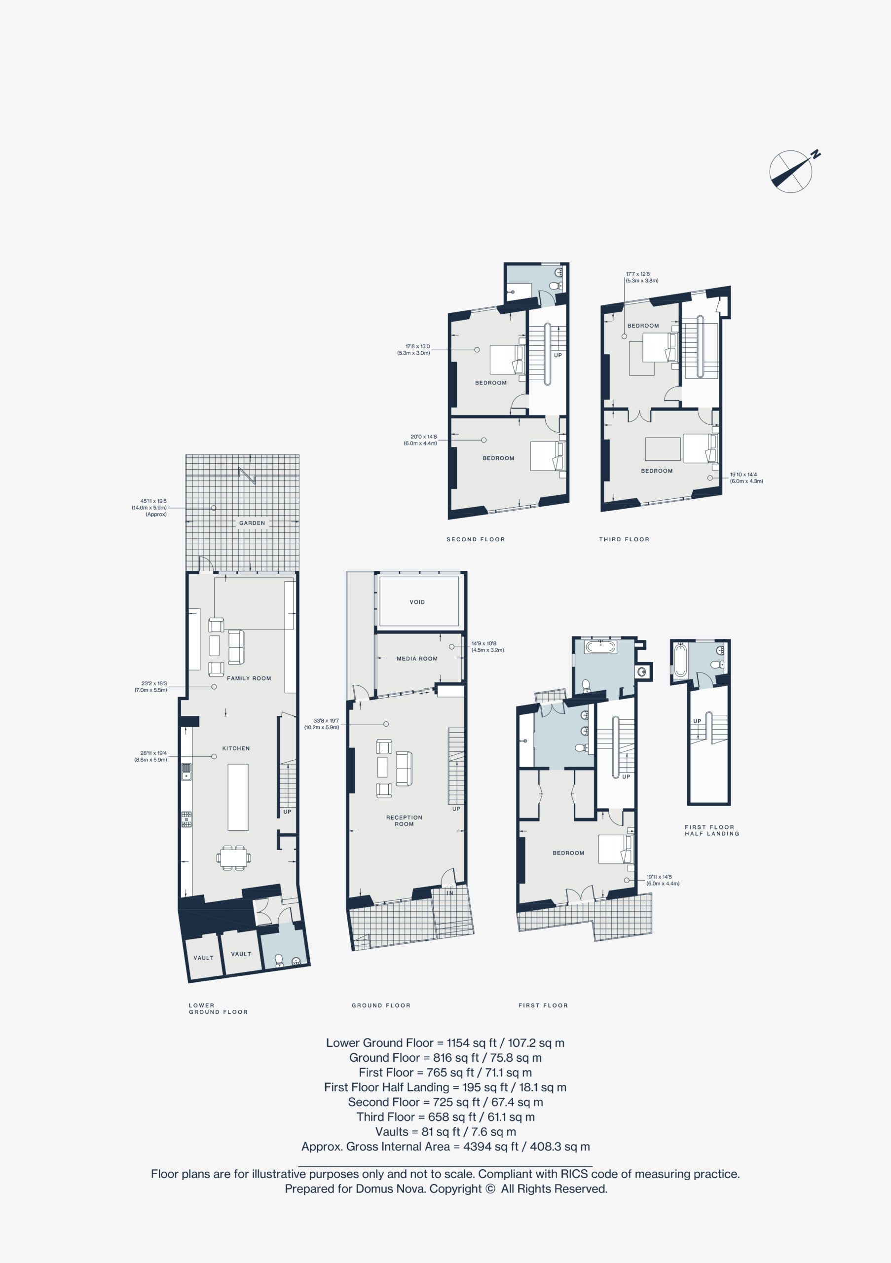 Outside, a stucco-fronted façade paints a picture of classic Victorian design: cast-iron railings, stock brickwork and a grand portico entrance. Beyond however, five sprawling floors put a bold, modern spin on period bones. Enter into a spacious reception room, where intricate ceiling cornicing and a bespoke black slate fireplace are met with a sleek glass wall – casting the eye down to a vast picture window. The space is bathed in sunlight, and zoned between a stylish living area and cosy media room. Here, there’s a projector, retractable screen and surround sound, which is kept behind a professional acoustic wall and darkened by grey blackout curtains.