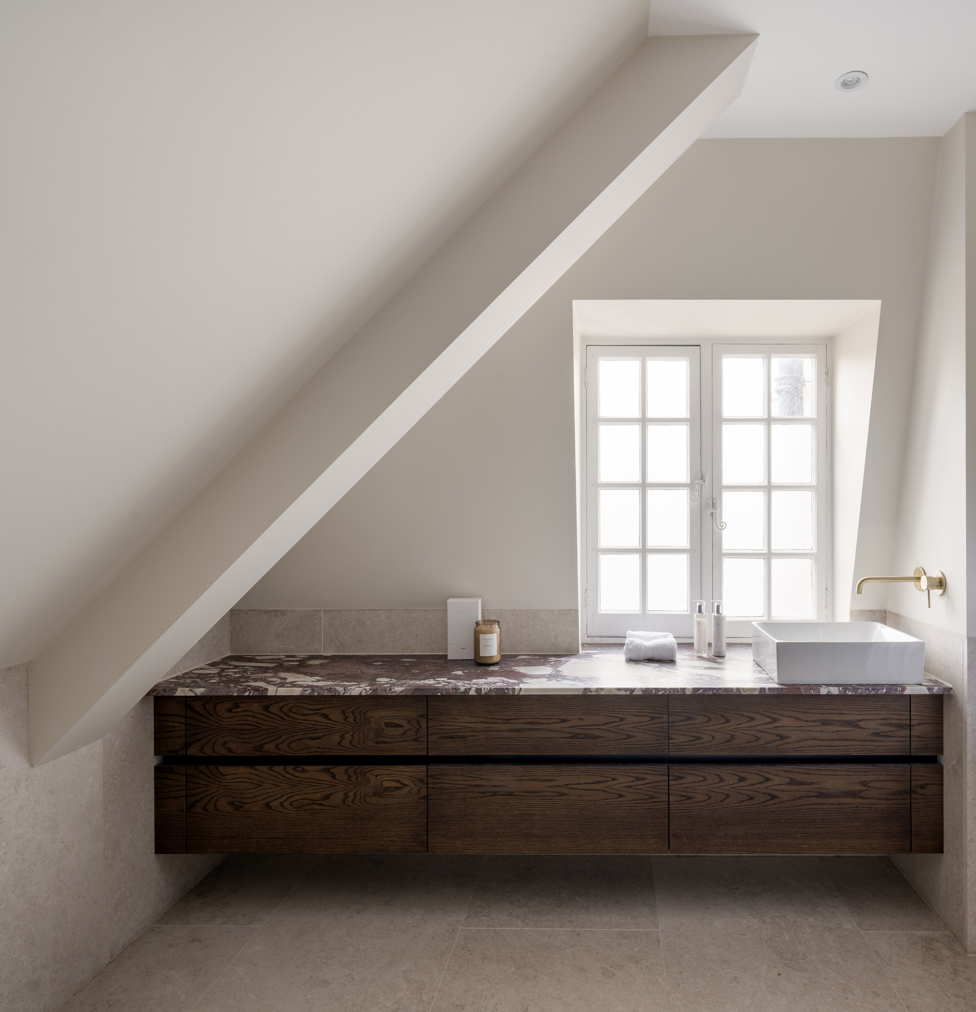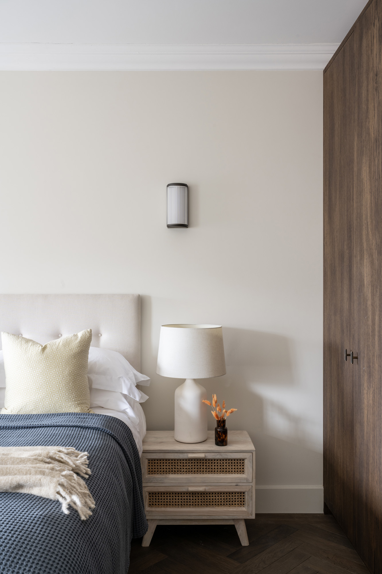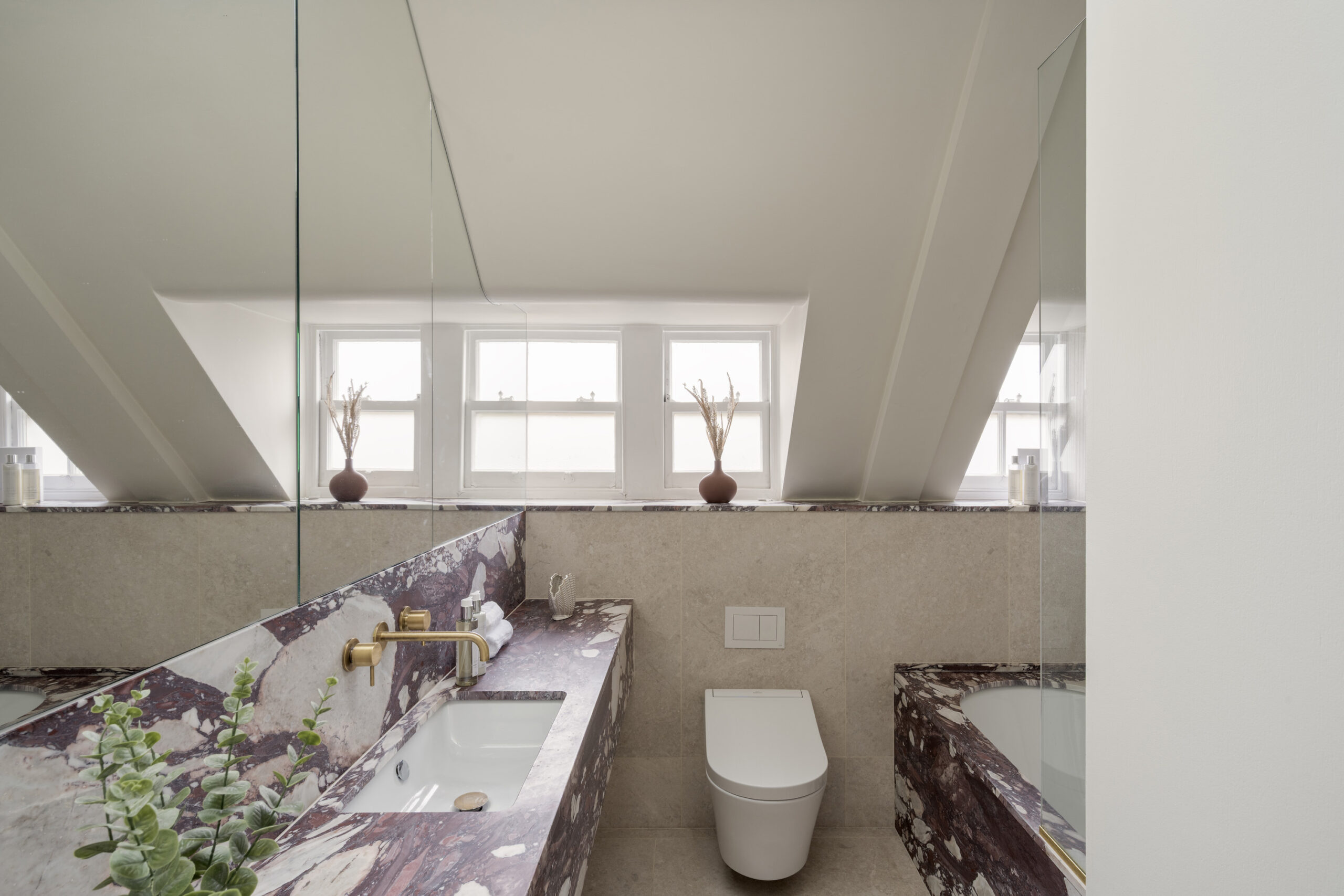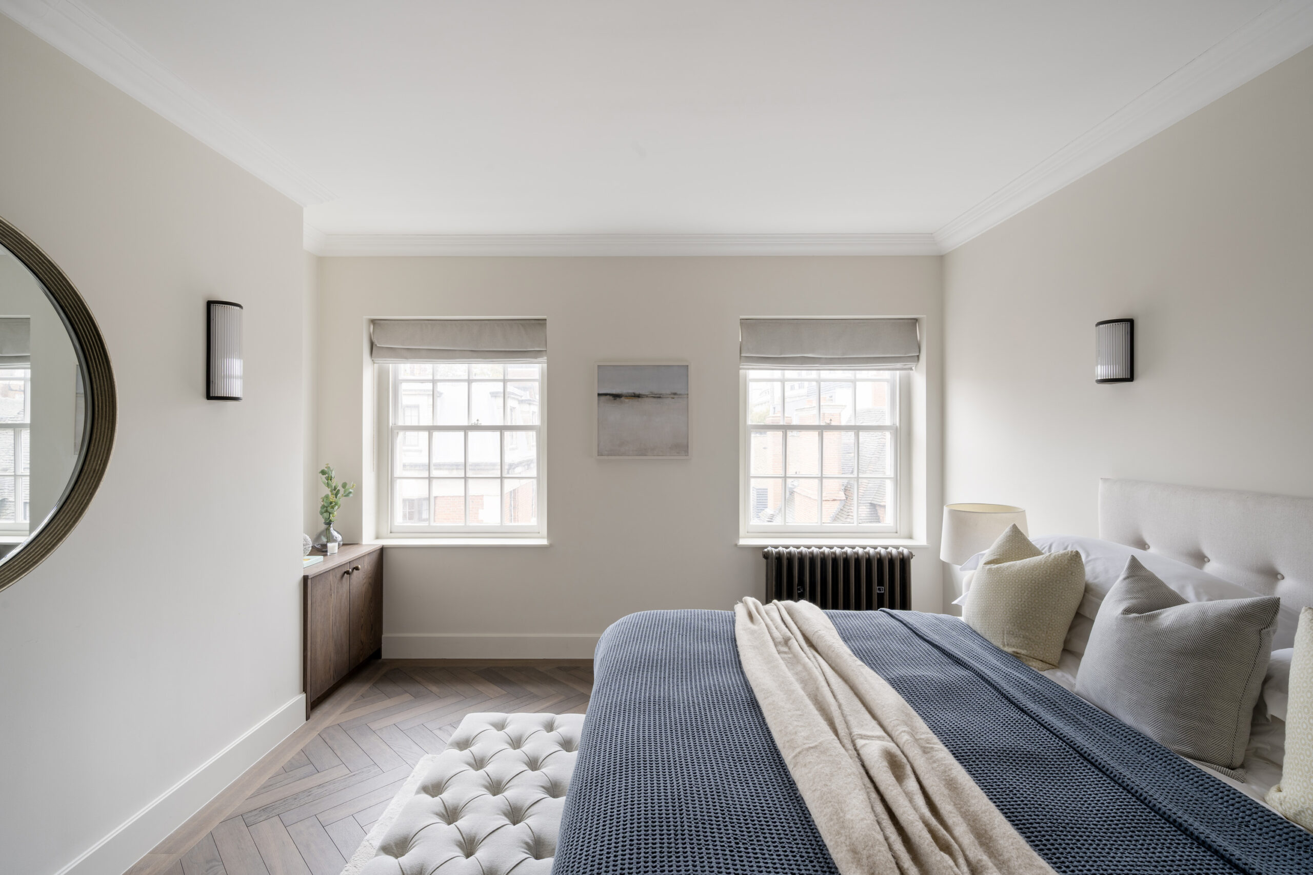 Two bedrooms maintain the home’s calming atmosphere and refined styling. The first bedroom is all pale tones and soft sunlight, with fitted wood wardrobes and a smart upholstered bed. A second bedroom matches this minimalist aesthetic, with a Crittall-style door leading to an en suite bathroom. An oversized walk-in shower is wrapped in bold marble and accented with gilded hardware. A further bathroom, crafted with the same materials, features an indulgent bathtub.