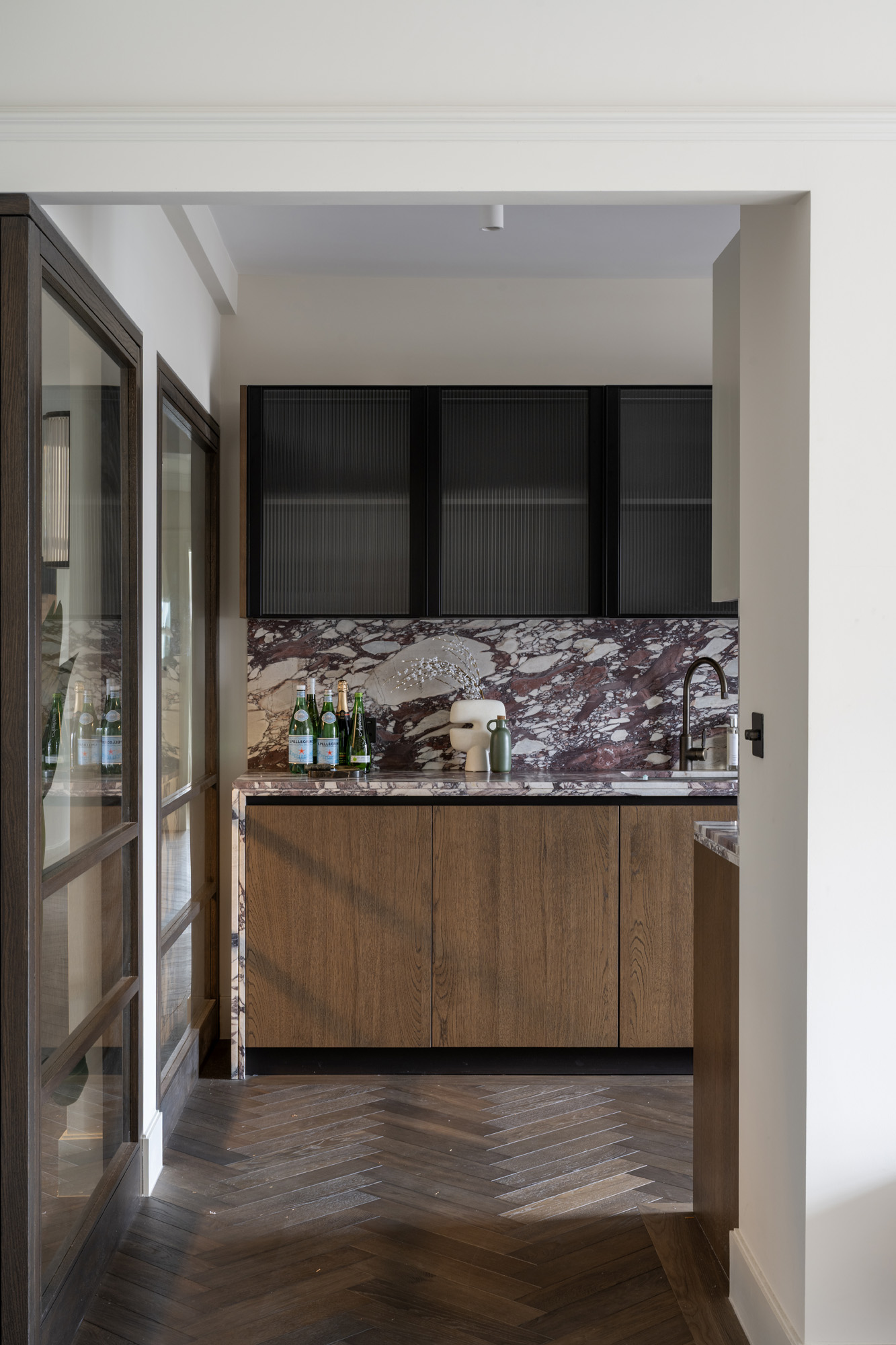 Through an archway, the kitchen is a masterpiece in marble. Striking stone worktops and splashbacks frame the room, complemented by dark wood and frosted-glass cabinets, plus neatly integrated Miele appliances.