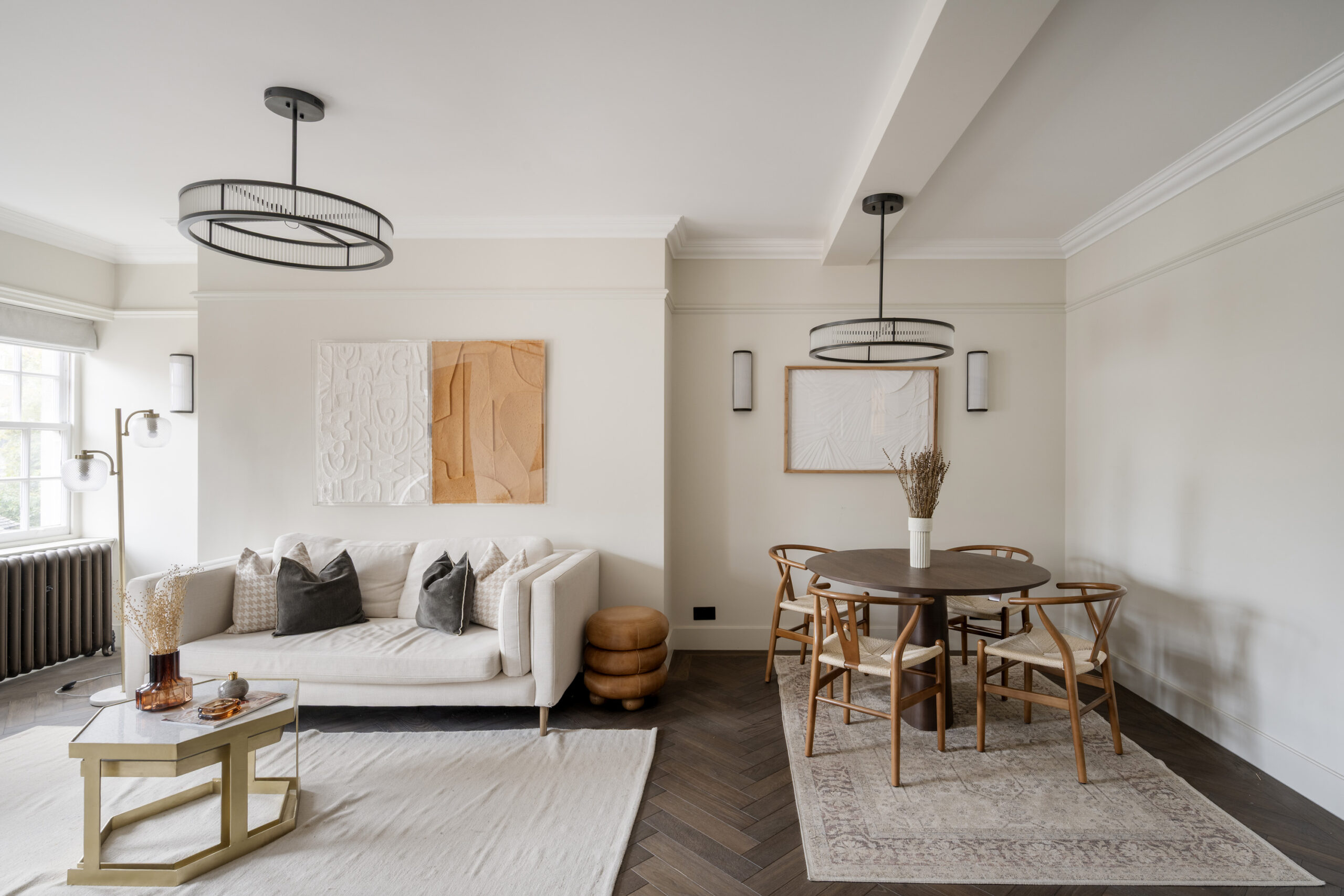 Take the lift to the fourth floor and enter a bright entrance hallway. Dark wooden parquet floors run underfoot, while vast interior windows invite you into the heart of the home. Glass-fronted double doors open into the reception and dining room, where soaring ceilings and pale walls afford a voluminous feel to the space. Sunlight filters in through a sash window, illuminating the carefully-considered furnishings: designer lighting, modern artwork, a sleek circular dining table and relaxed tuxedo sofa.