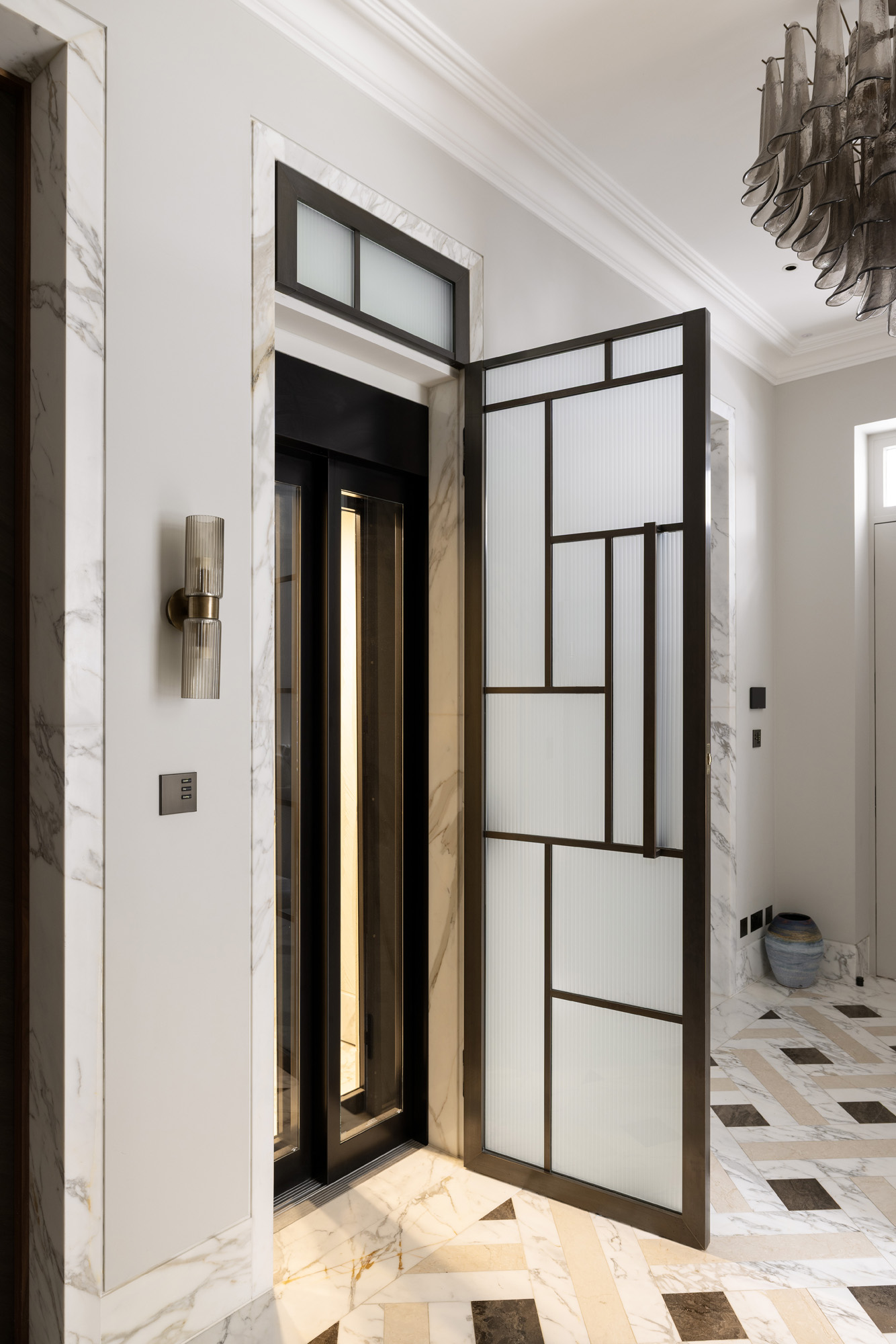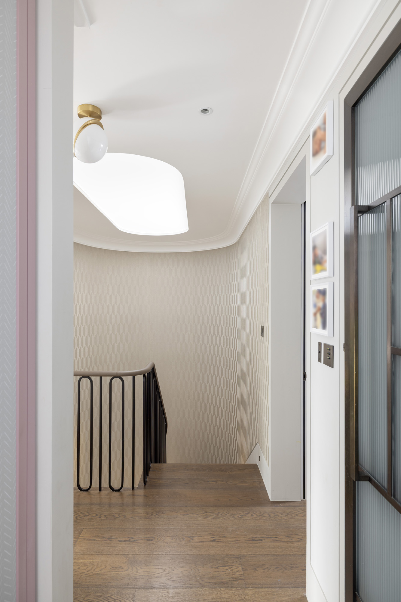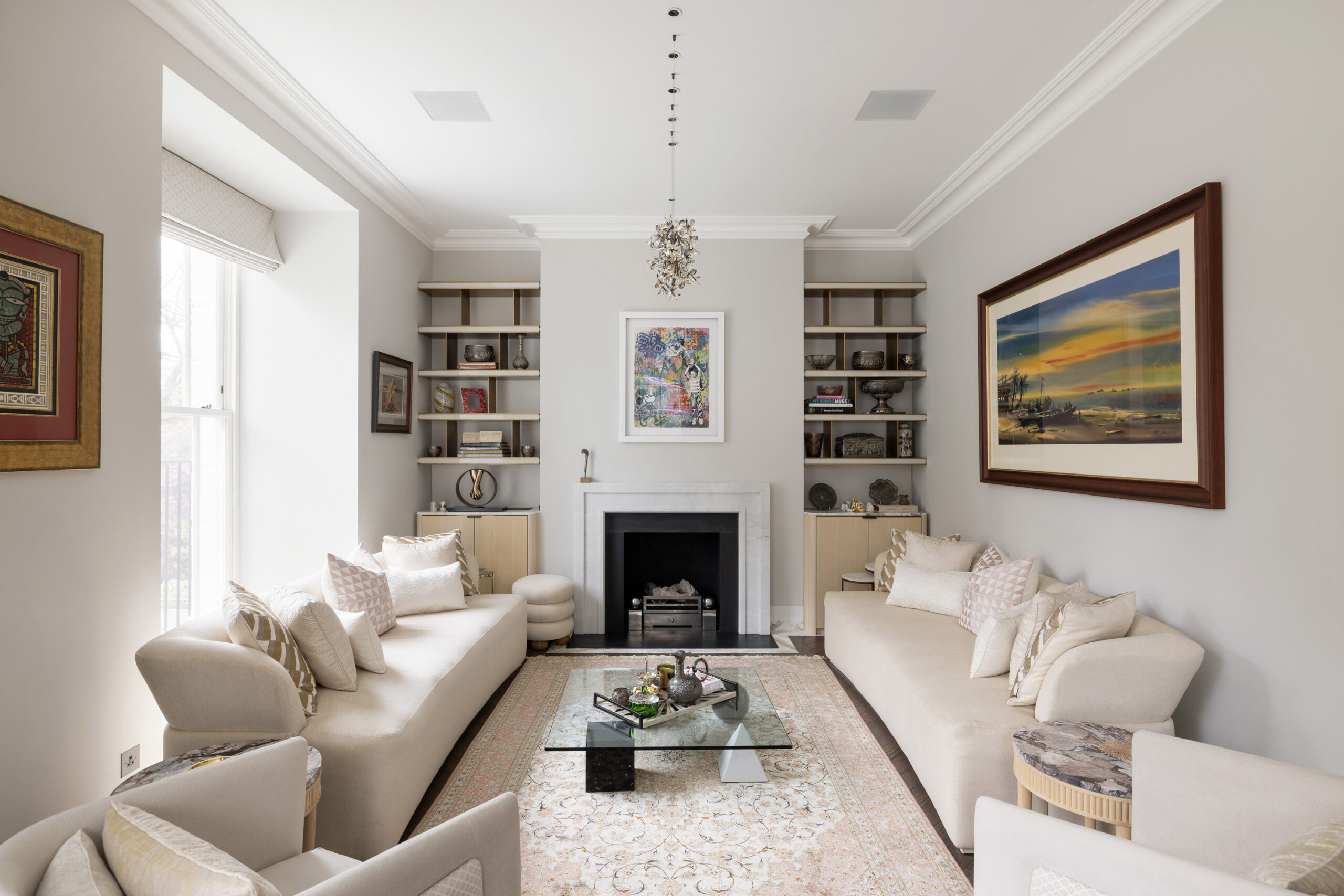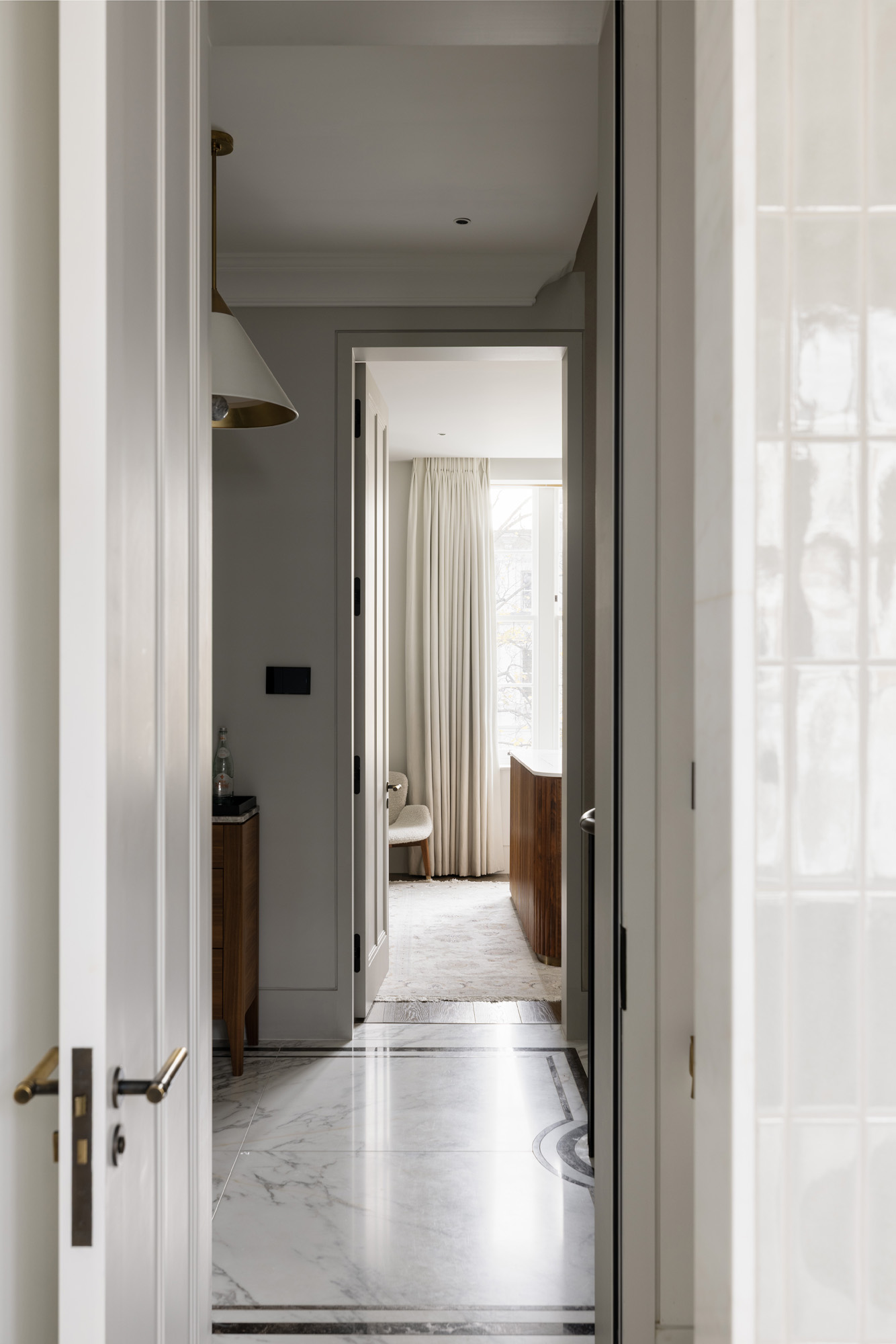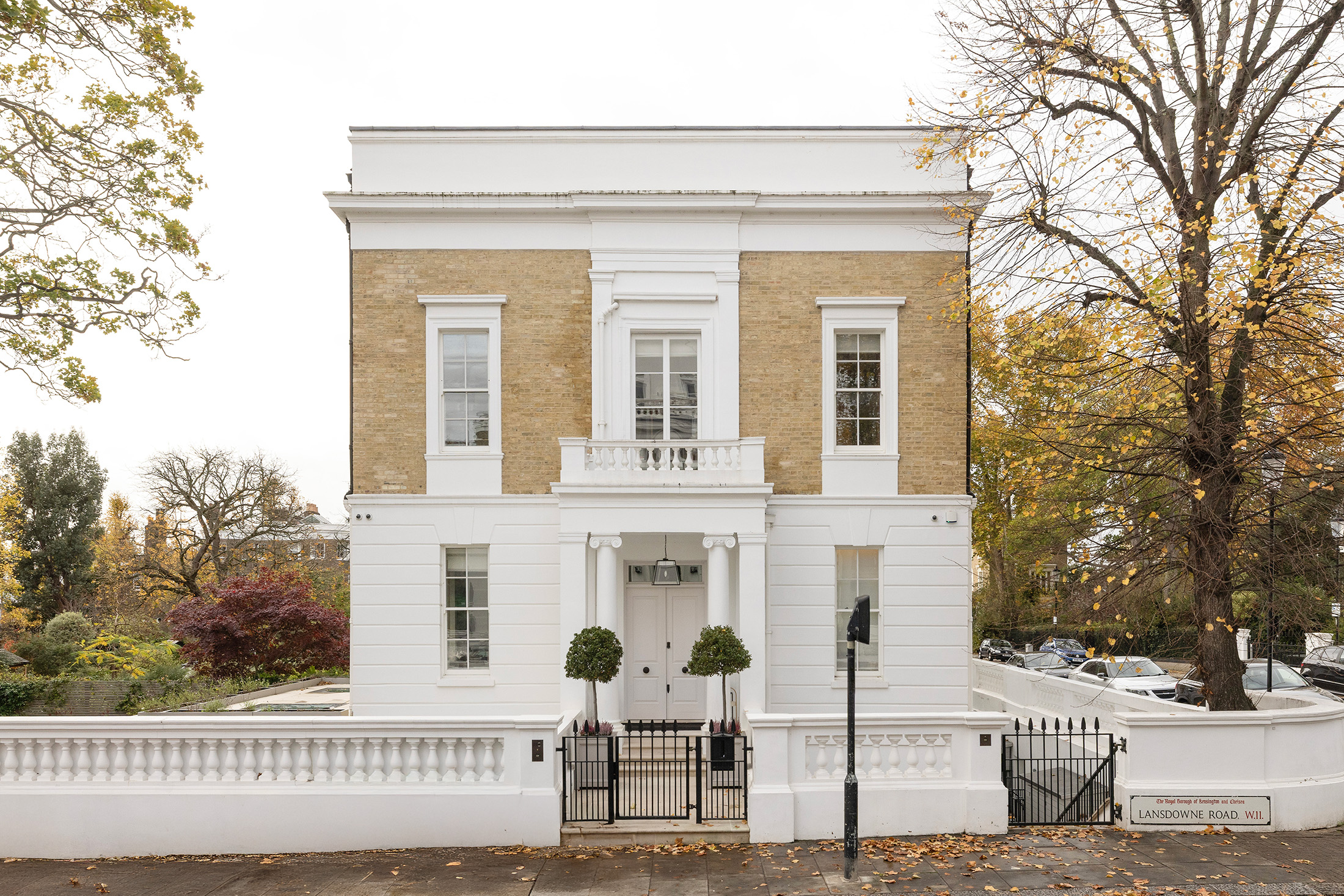 A grand stucco façade sets a commanding tone on Lansdowne Road, where Studio Indigo‘s architectural finesse meets the refined interiors of Shalini Misra. The sense of arrival is nothing short of cinematic: a four-column portico porch gives way to a home where a sweeping staircase twists gracefully between all five floors. Inside, a basketweave marble floor, Phillip Jeffries wallpaper and intricate cornicing nod to the building’s classical roots. Behind a frosted glass door, a discreet lift adds a touch of modern convenience.