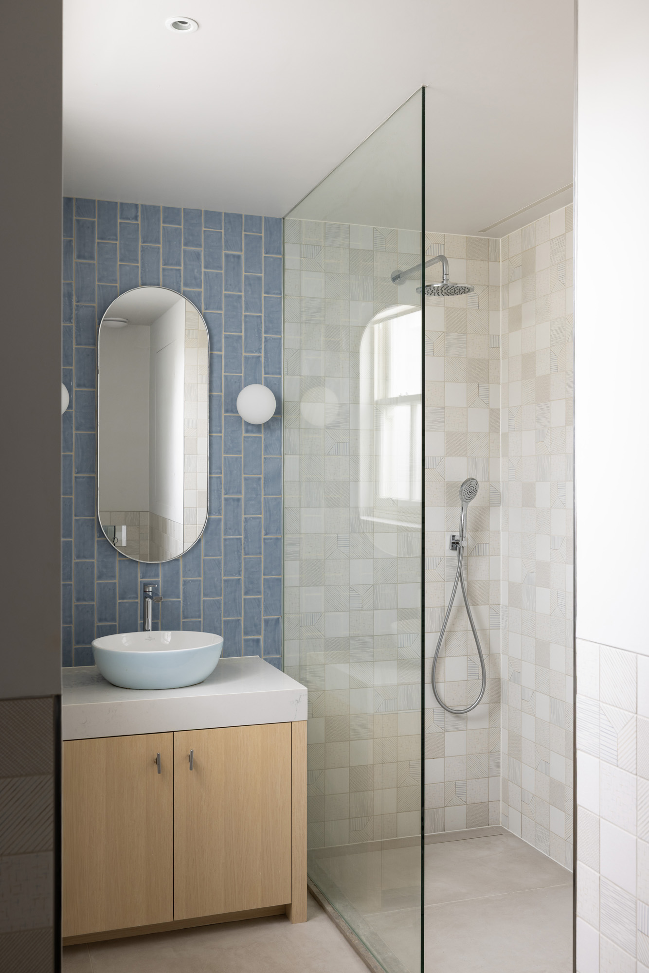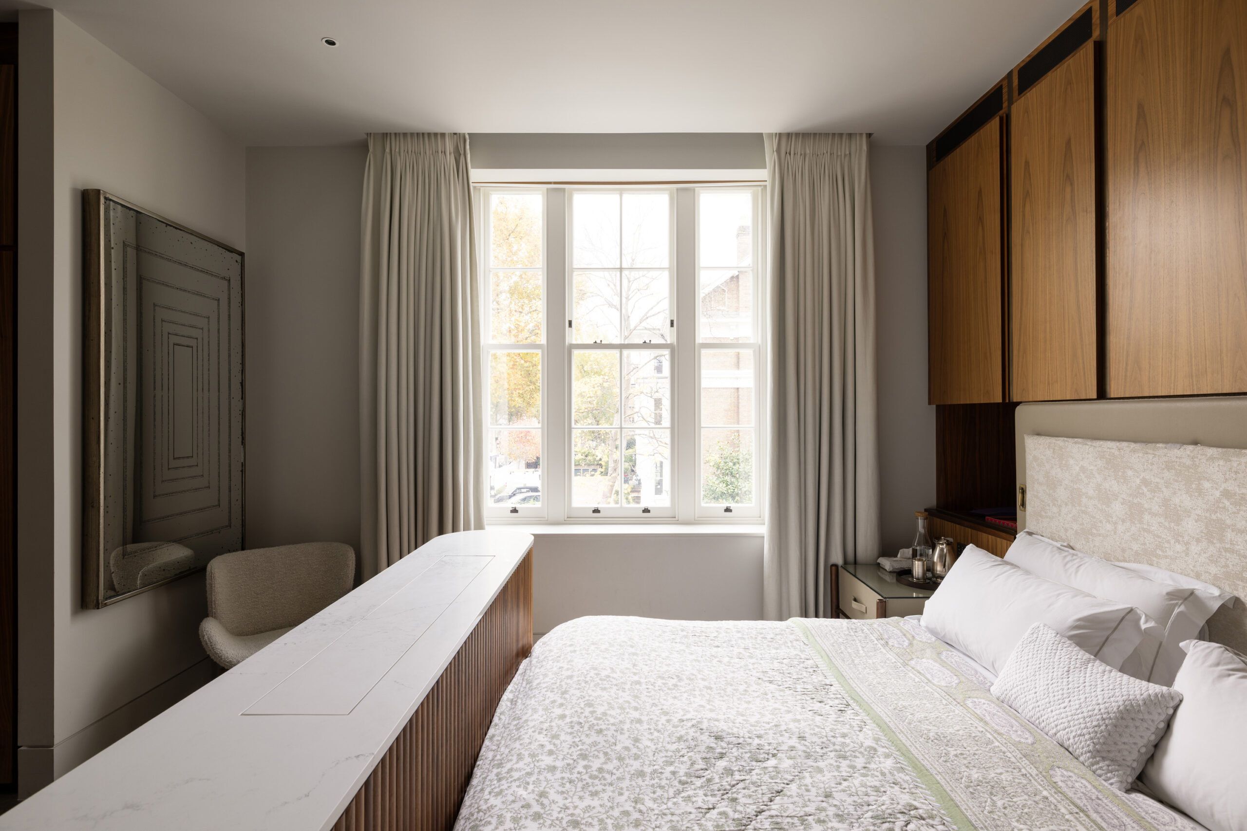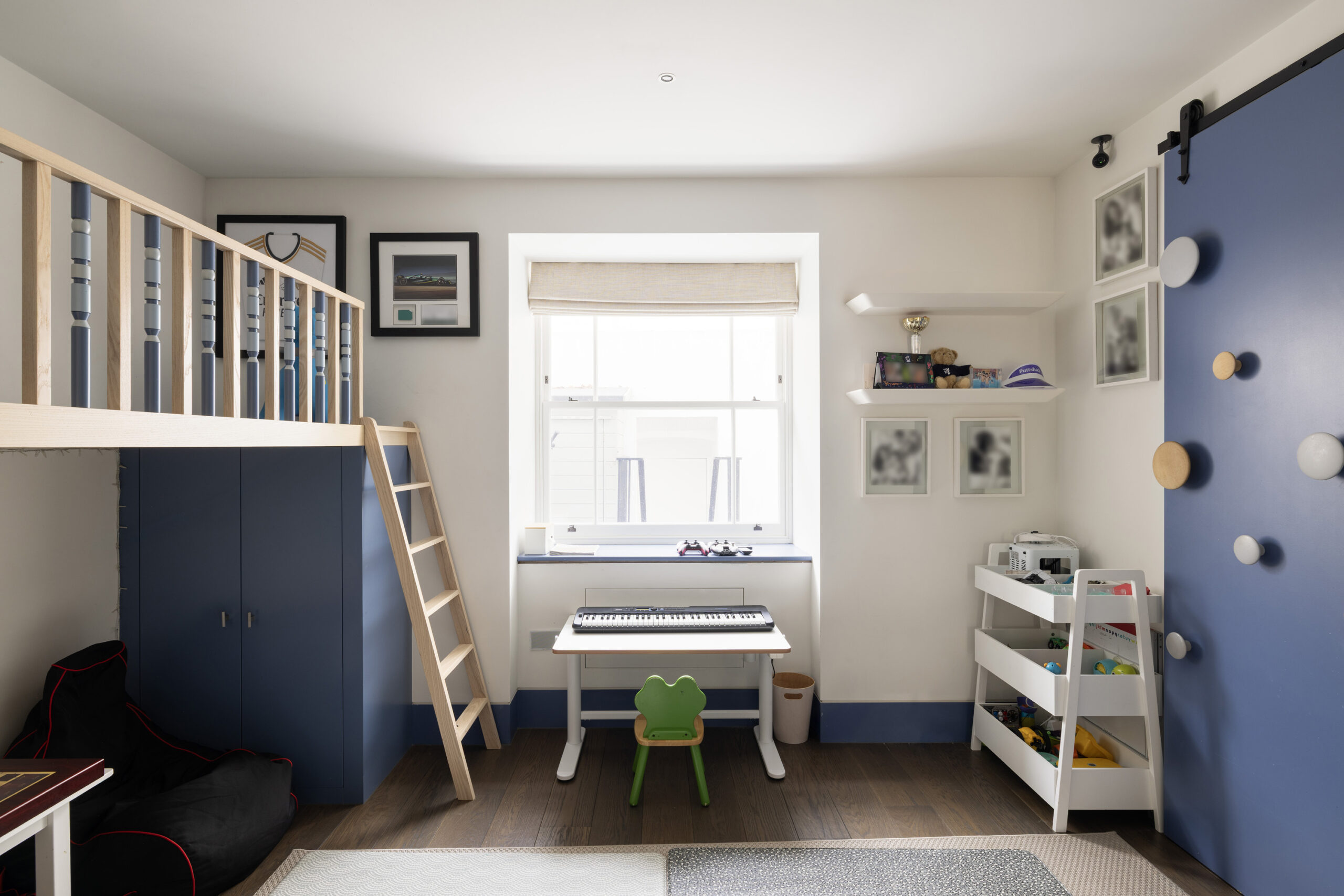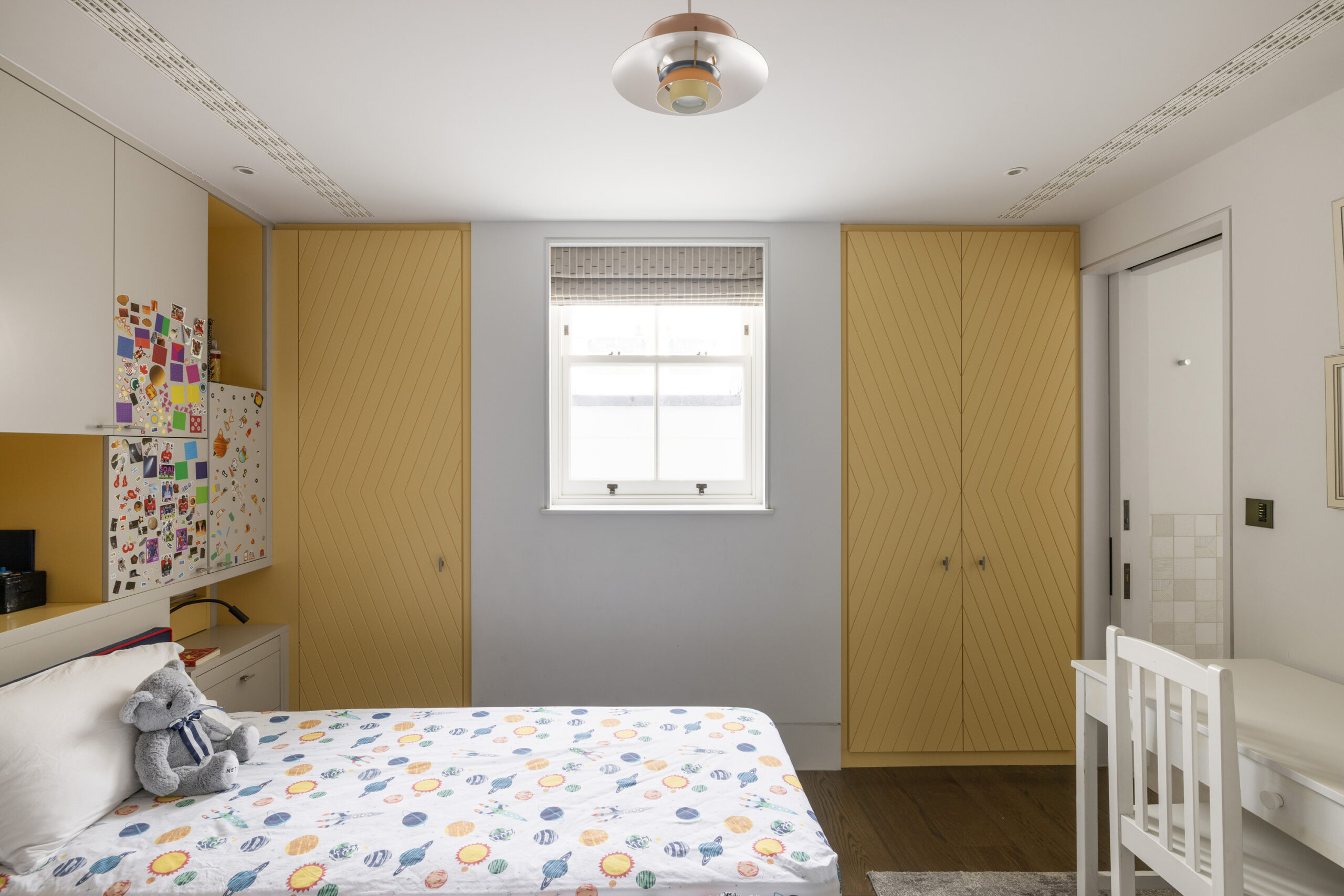 The top floor houses three guest bedrooms, one en suite, each defined by tonal palettes and built-in storage, punctuated by pops of colour. A family shower room and additional dressing space complete the layout.