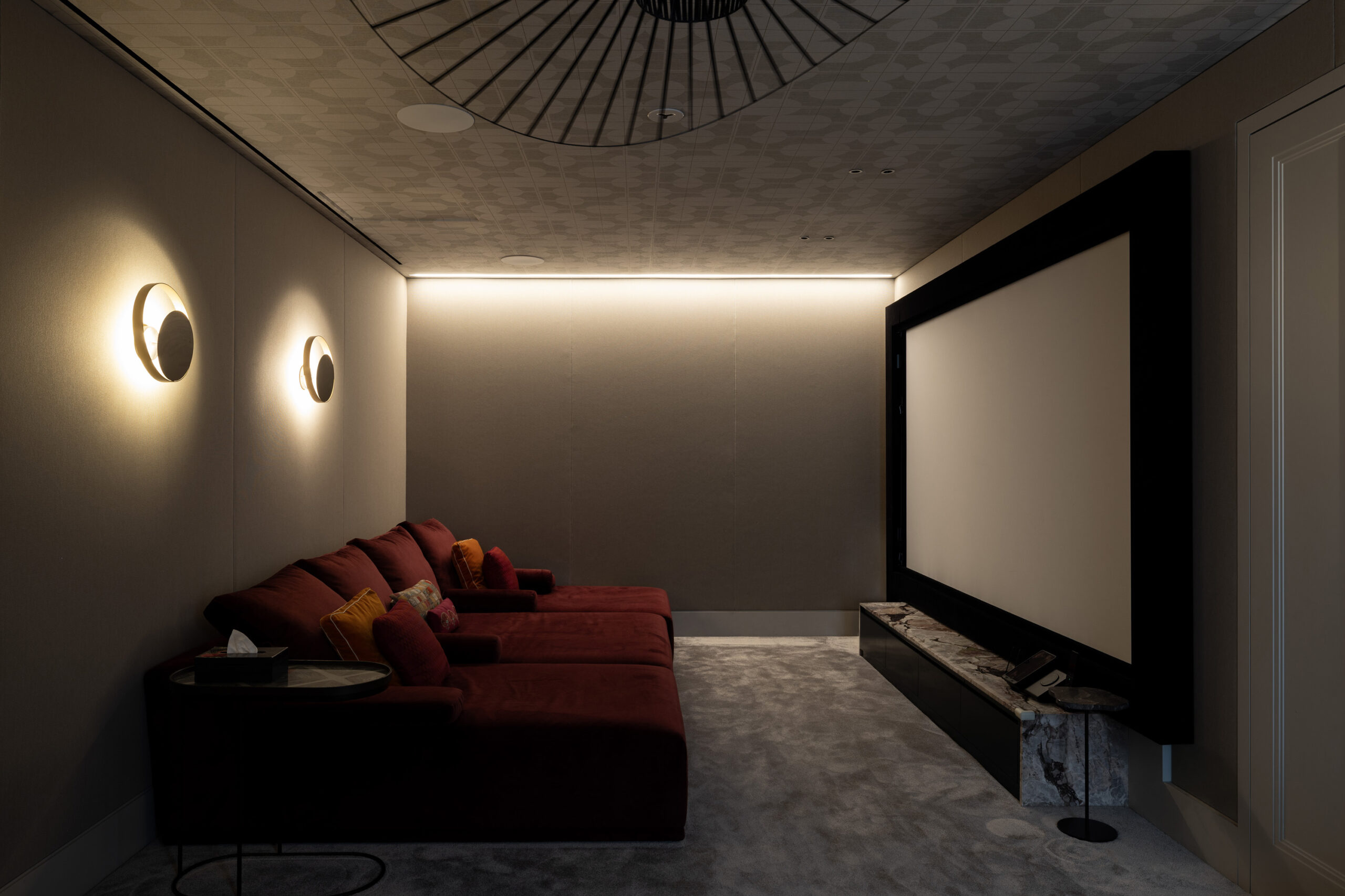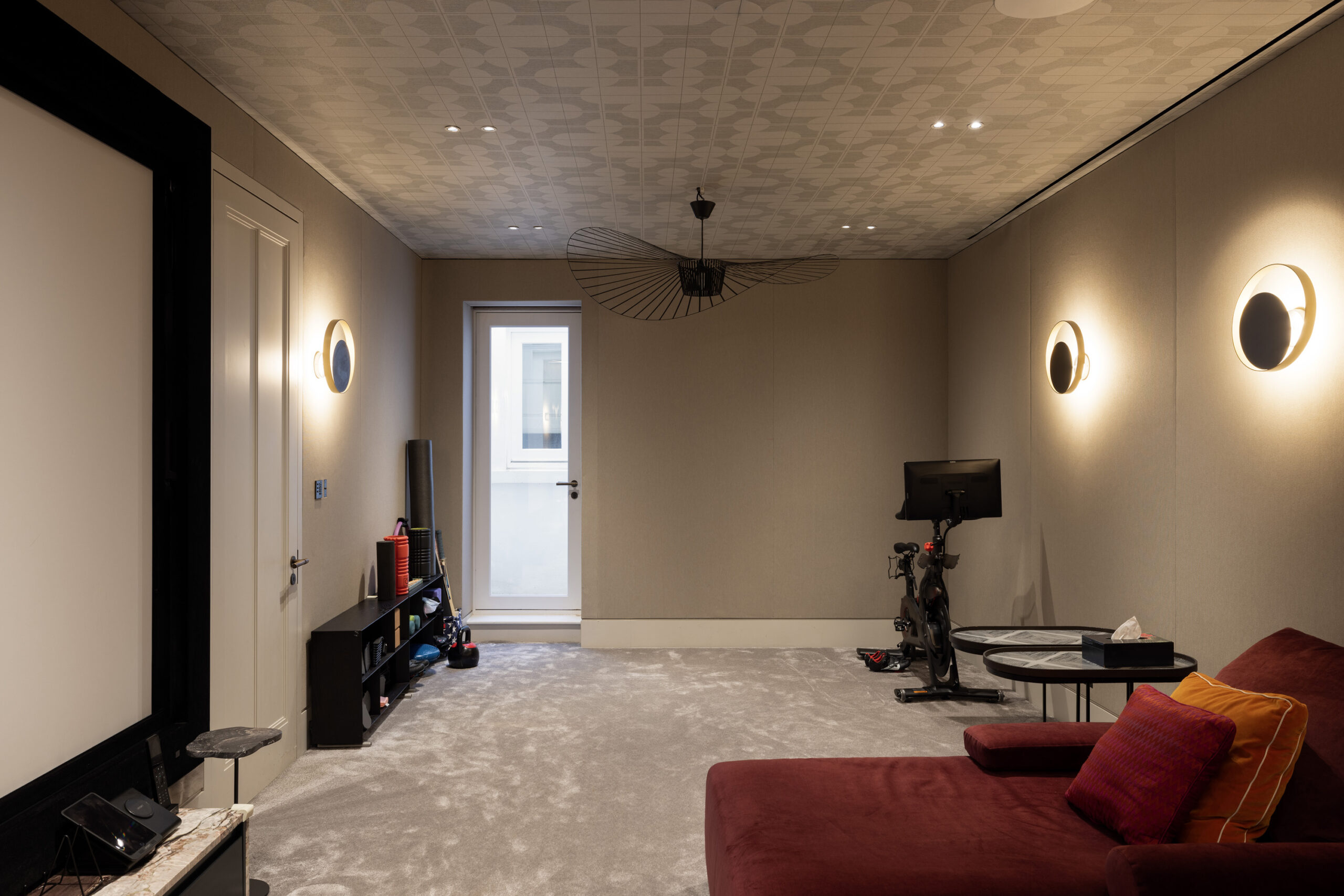 Back inside, the lower ground floor is dedicated to leisure. A games room doubles as a home cinema, with plush carpet, atmospheric lighting and a full-width screen ideal for movie nights or Peloton sessions. An expansive utility room and staff living quarters complete this level.