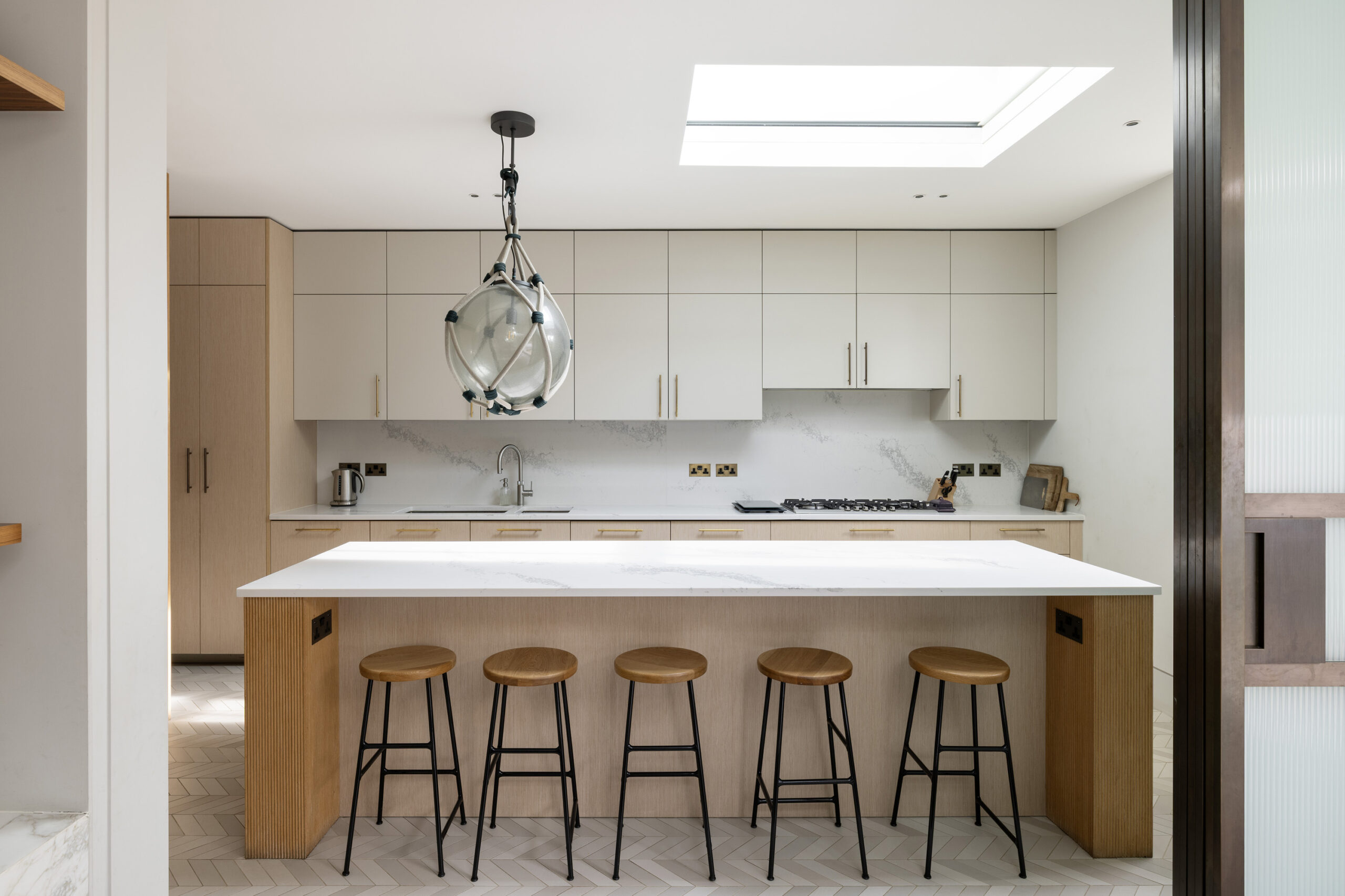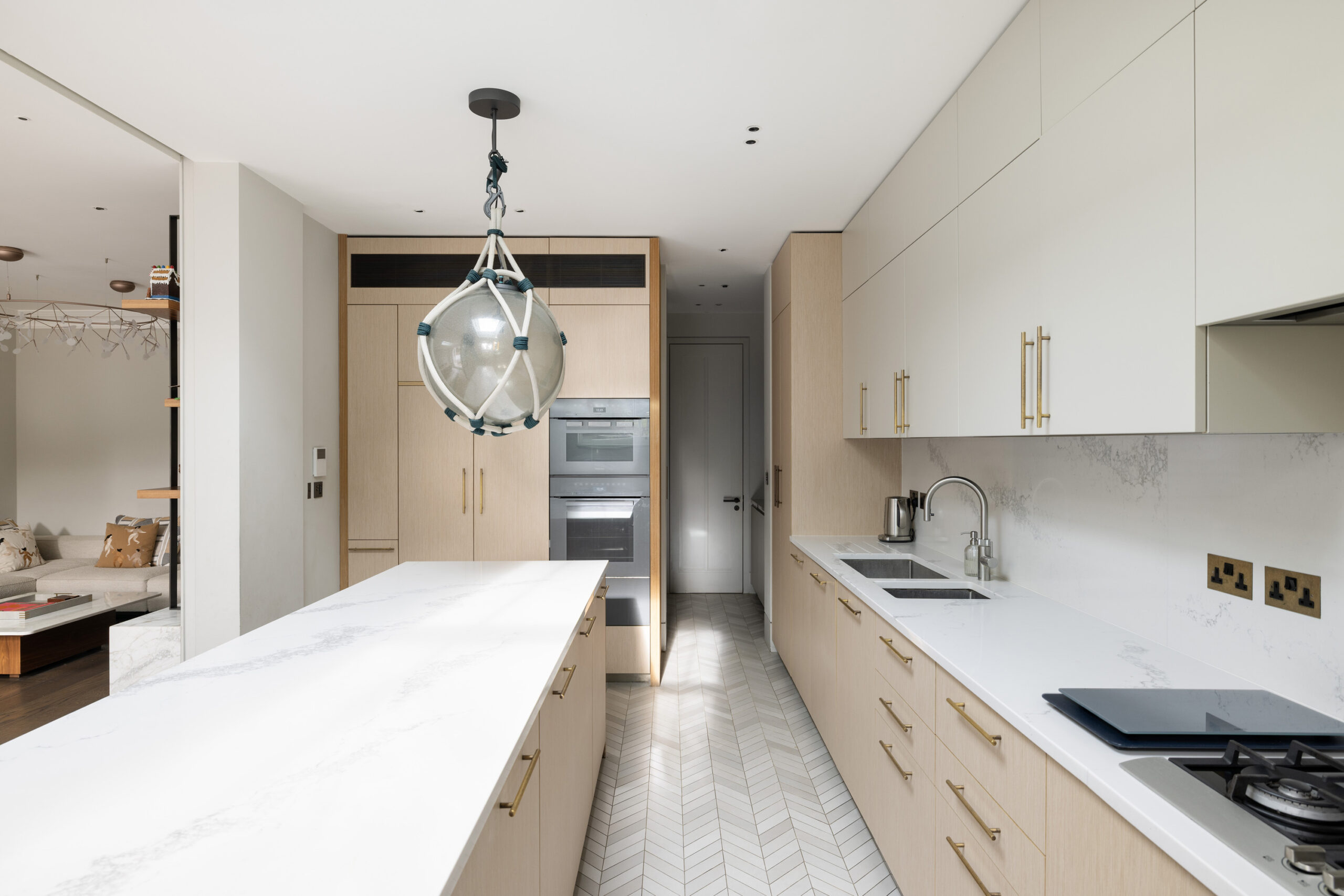 Descending to the garden level, the atmosphere turns to everyday living. Here, an open-plan reception area flows seamlessly beneath a skylight, with white walls and timber floors amplifying the sense of light. A sliding panel reveals the kitchen and dining space – an elegant blend of herringbone floor tiles, veined marble surfaces and soft-toned cabinetry. Appliances by Fisher & Paykel, Miele and Fulgor Milano, are paired with gold hardware and speak to a quiet luxury. Behind the scenes, a pantry, boot room, walk-in storage and twin dishwashers ensure the home is as functional as it is refined.