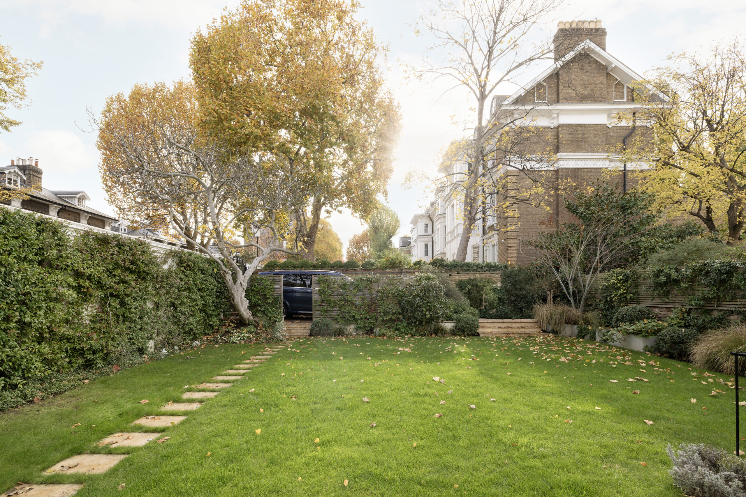 From here, full-height folding doors open to a generous garden – a rarity in this postcode – a layered outdoor retreat created by Charlotte Sanderson Garden Design. A terrace joins a manicured lawn and flowerbeds, while a stepping-stone path leads to a private gated driveway beyond.