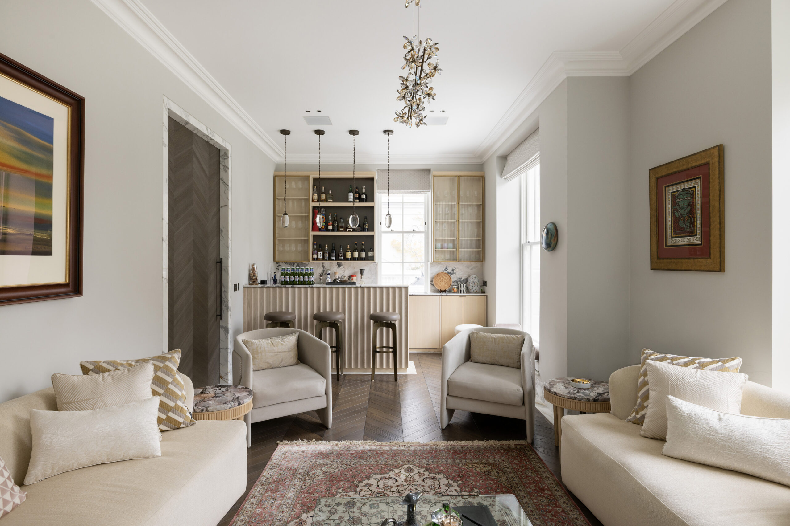 The drawing room, just off the entrance is elegant and understated. A working fireplace anchors one end, while at the other, a bespoke bar signals the room’s entertaining capabilities. Also on this floor, a quiet study with panelled walls and a bay window that lend the space both gravitas and calm.