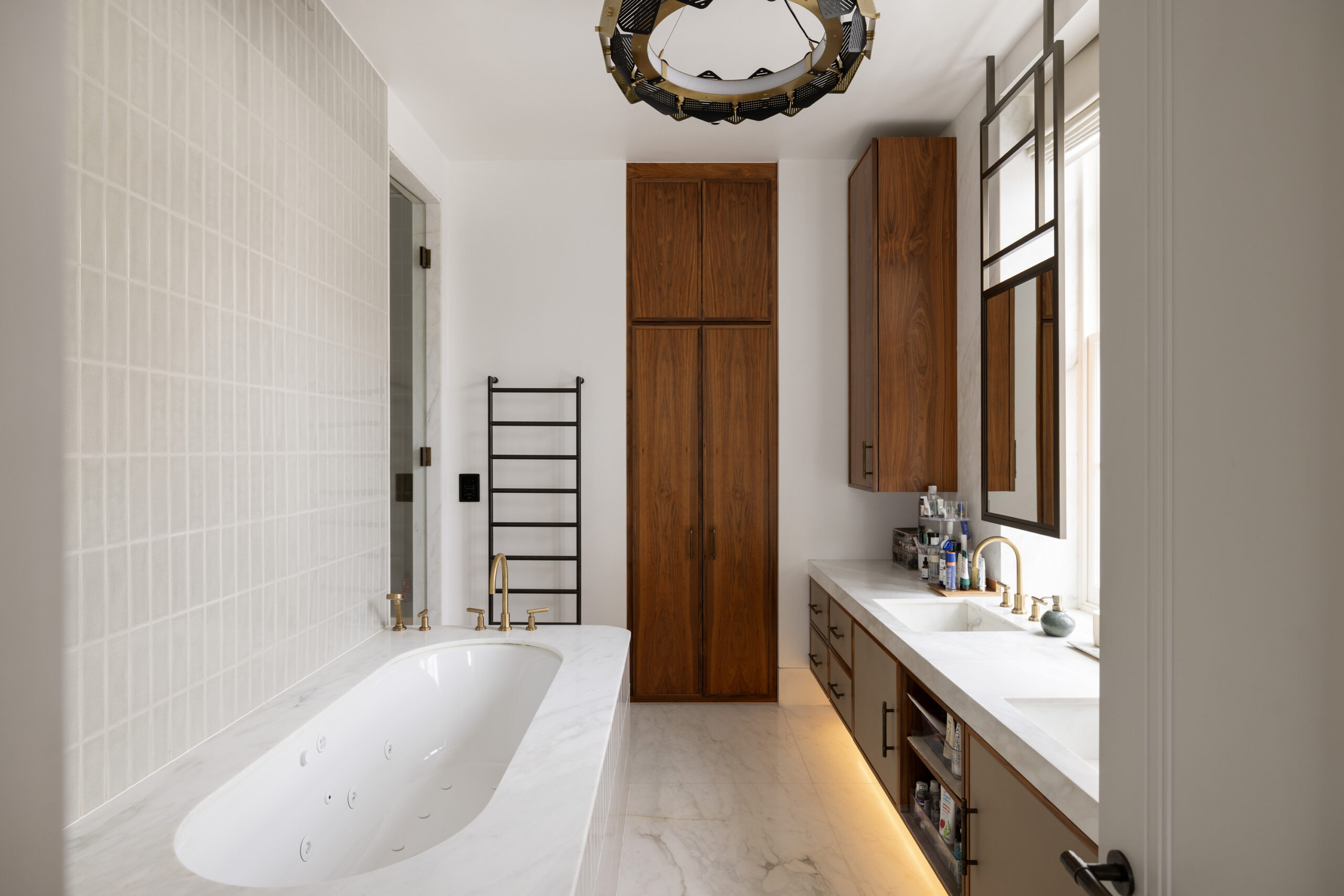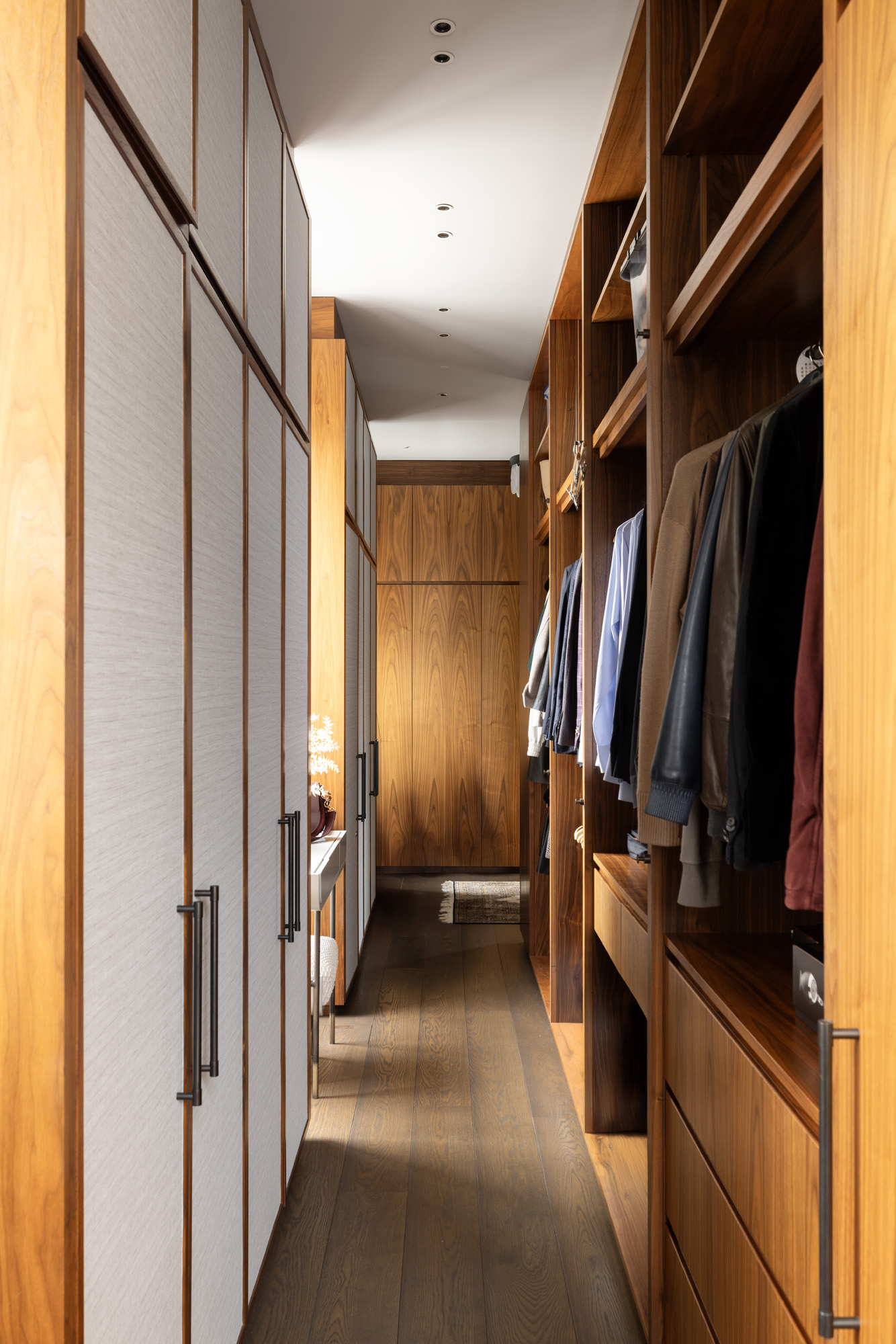 Ascending the sculptural staircase, the first floor is devoted to the principal suite – a sanctuary of neutral tones and bespoke joinery. A wraparound dressing area flows into a marble-clad bathroom, complete with dual vanities, a statement bathtub and walk-in shower, all enhanced by underfloor heating and a heated towel rail.