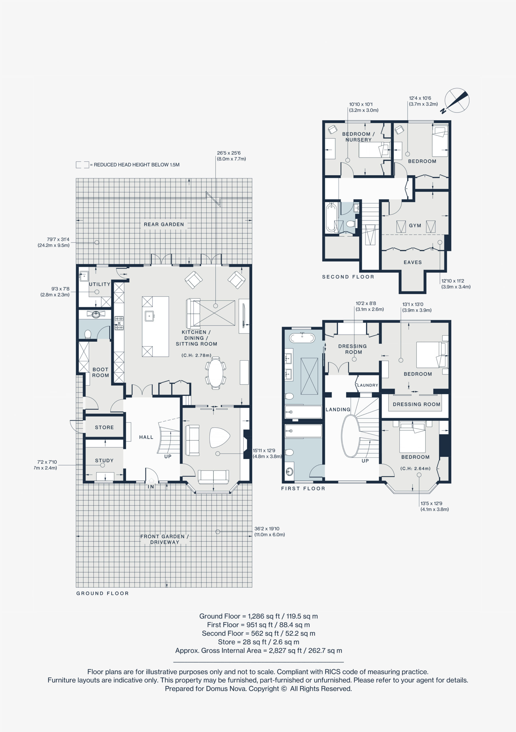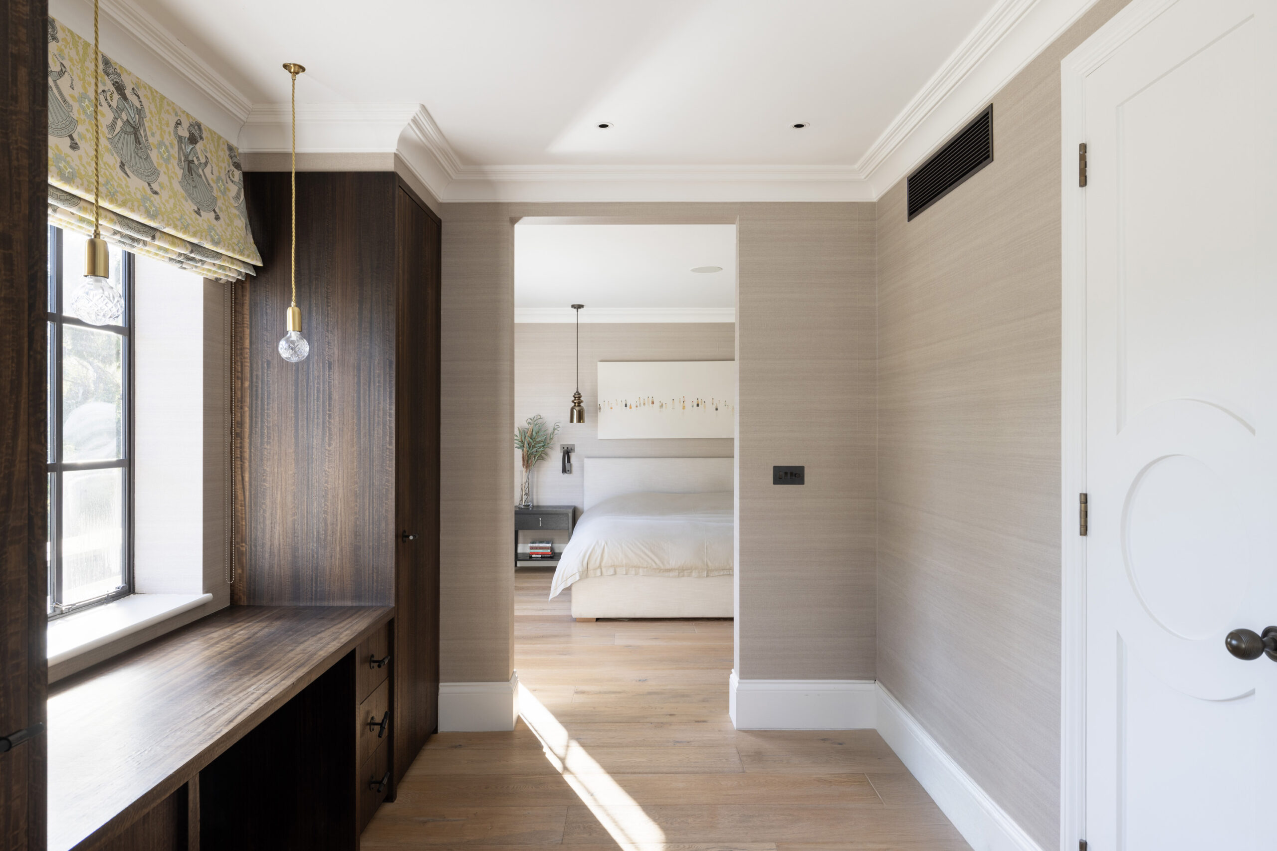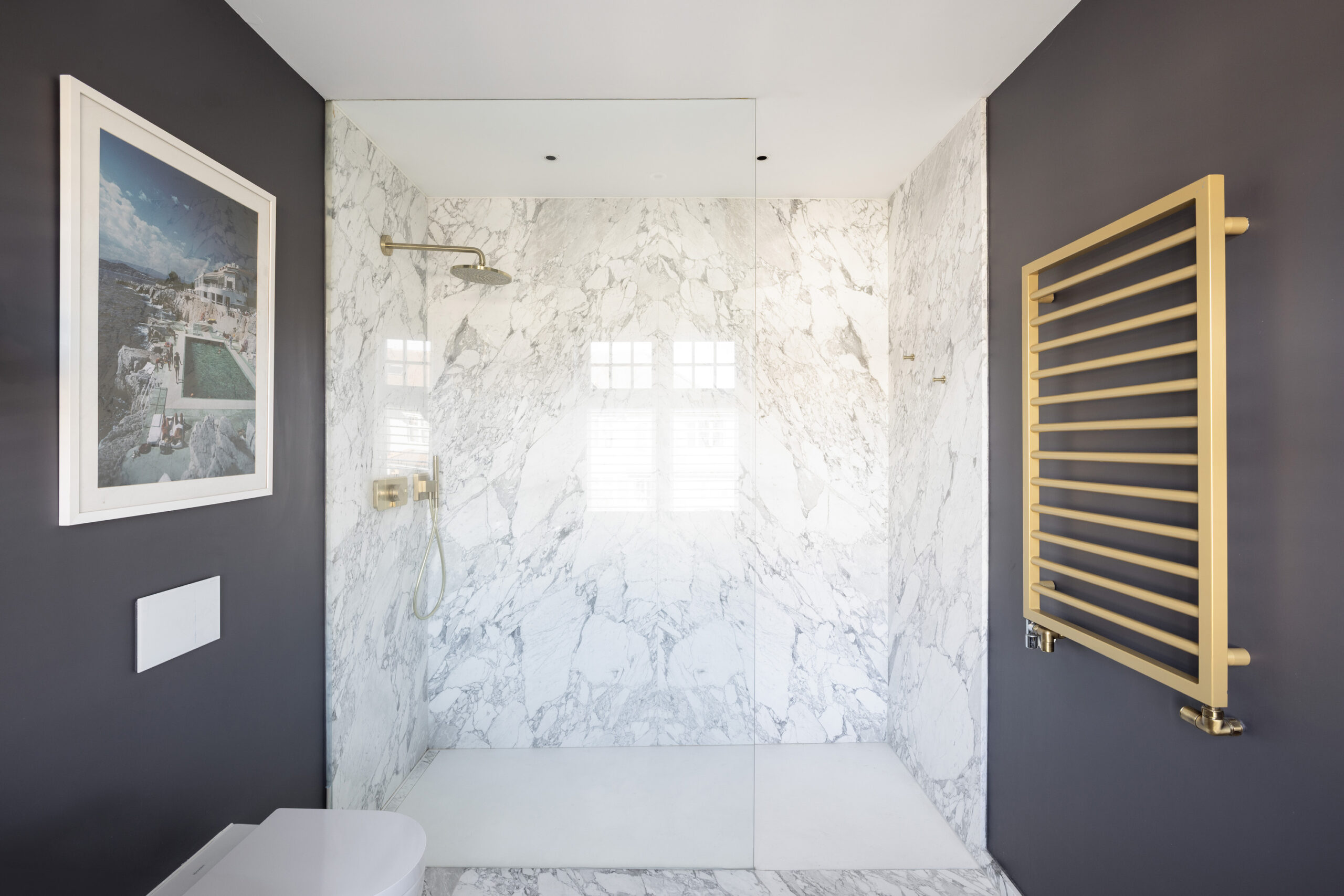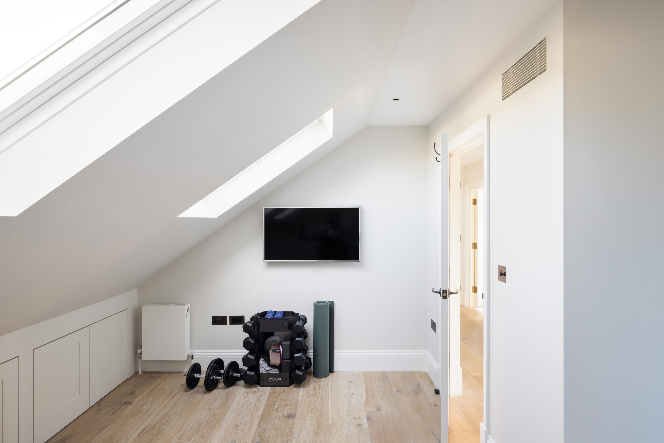 The first of the guest bedrooms enjoys a similar palette, with pale grey accents and an expansive bay window. A shower room completes the first floor, flecked with gold accents and enjoying a marble-clad rainfall shower. On the second floor, two further bedrooms unfold, accompanied by a family bathroom and home gym.