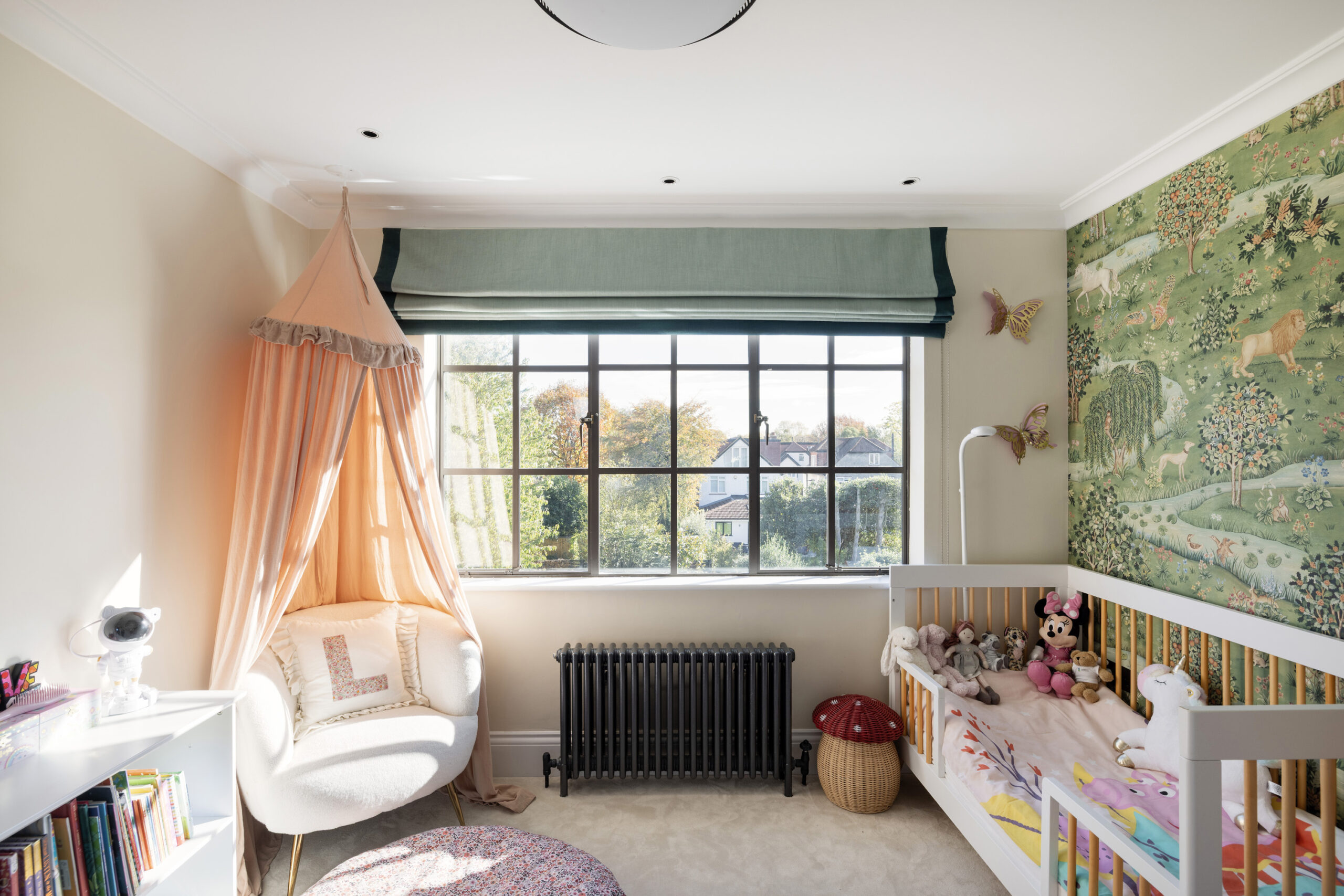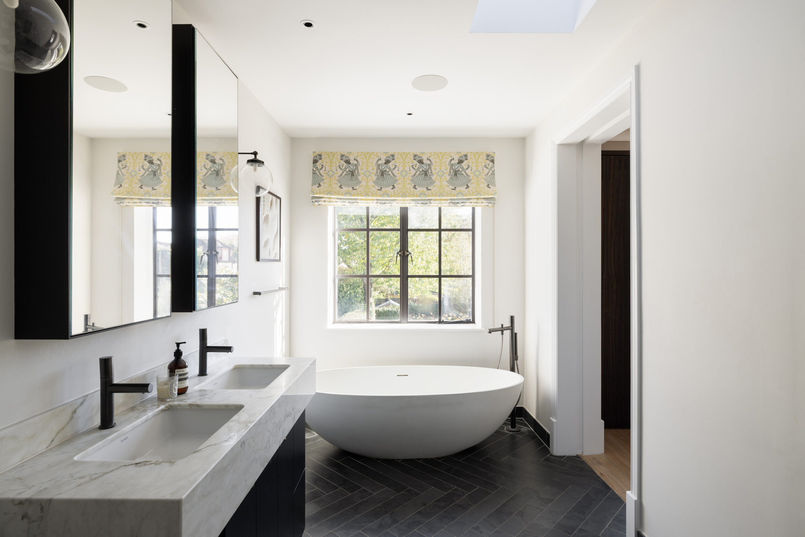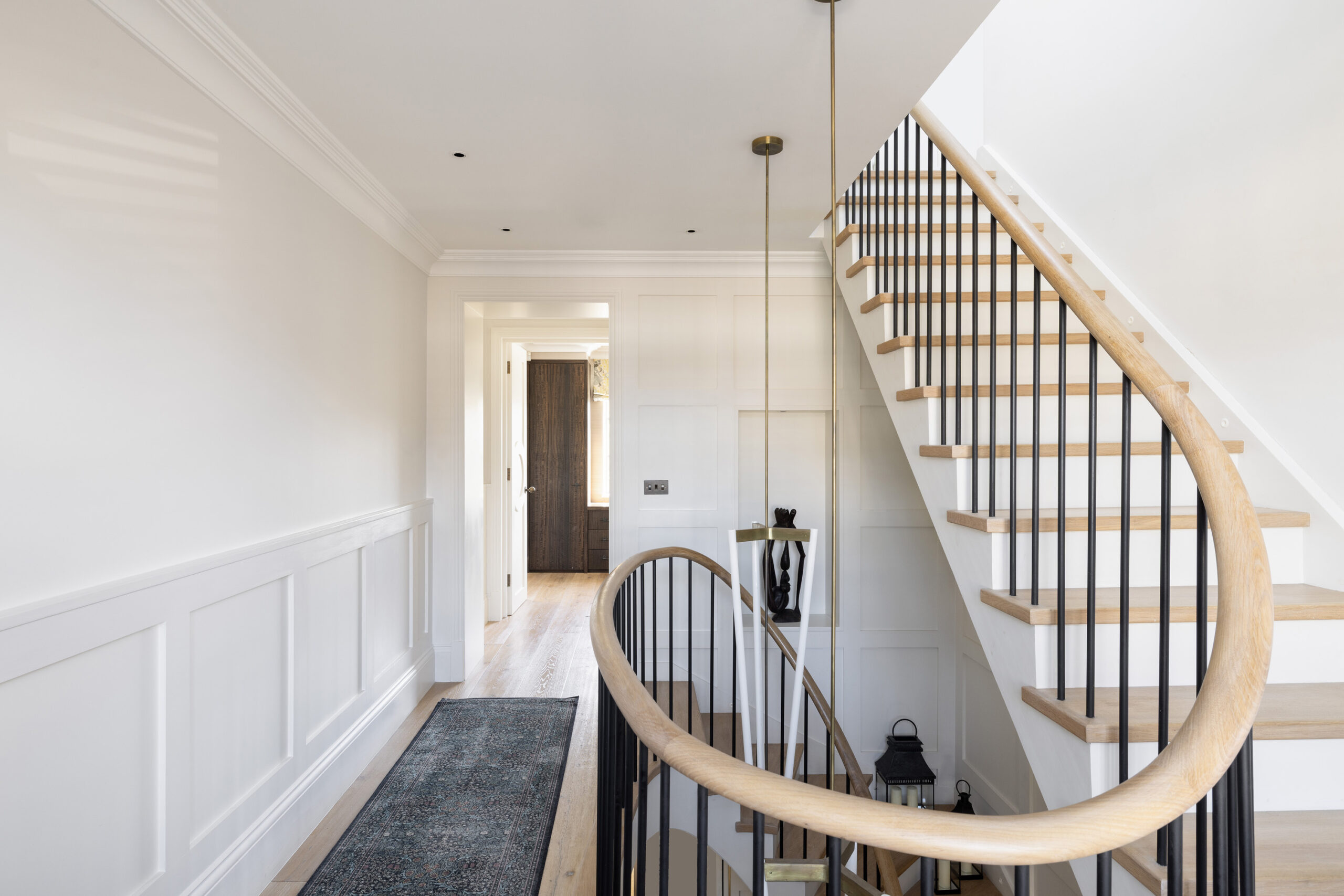 Upstairs, the home’s sleeping quarters unfold via the sweeping spiral staircase – a design statement with black minimalist spindles and a curved wooden banister lit by cascading pendant lights. The principal suite occupies much of the first floor, complete with dressing room, walk-in wardrobe and a sanctuary-esque en suite bathroom. Sisal wallpaper, mirrored wardrobes and cast-iron radiators nod to the heritage details, while slate herringbone tiles, dual Cielo sinks and a freestanding bath in the en suite lend a contemporary finish.