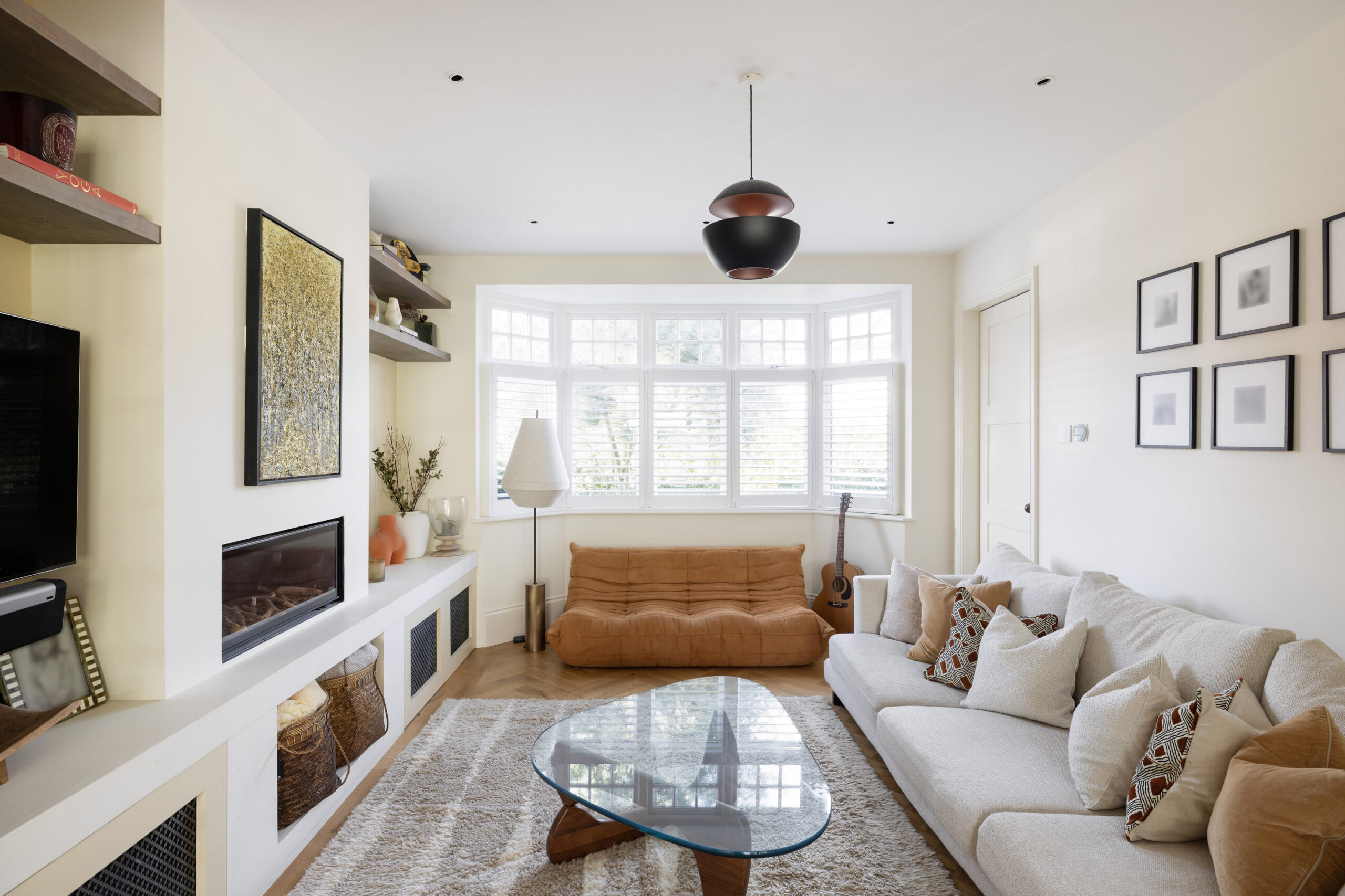 Through Crittall-style doors, a snug beckons – cosy and cocooning with a remote-controlled fire, Ligne Roset Togo sofa and a timeless Noguchi coffee table.