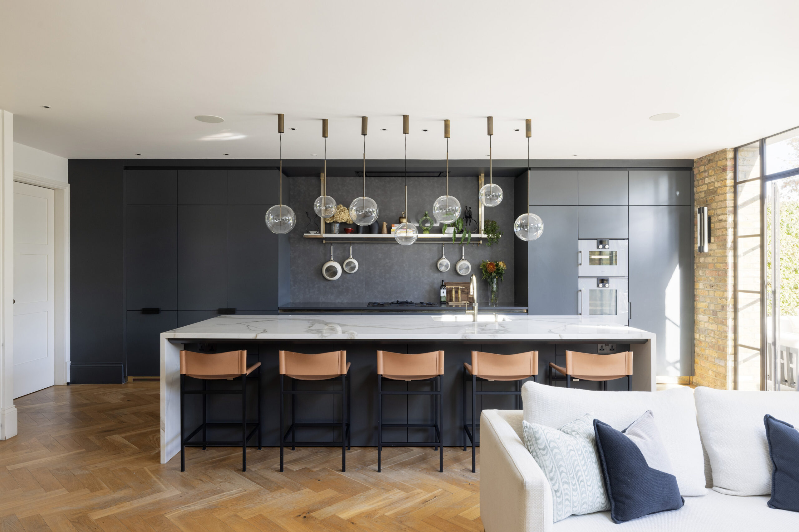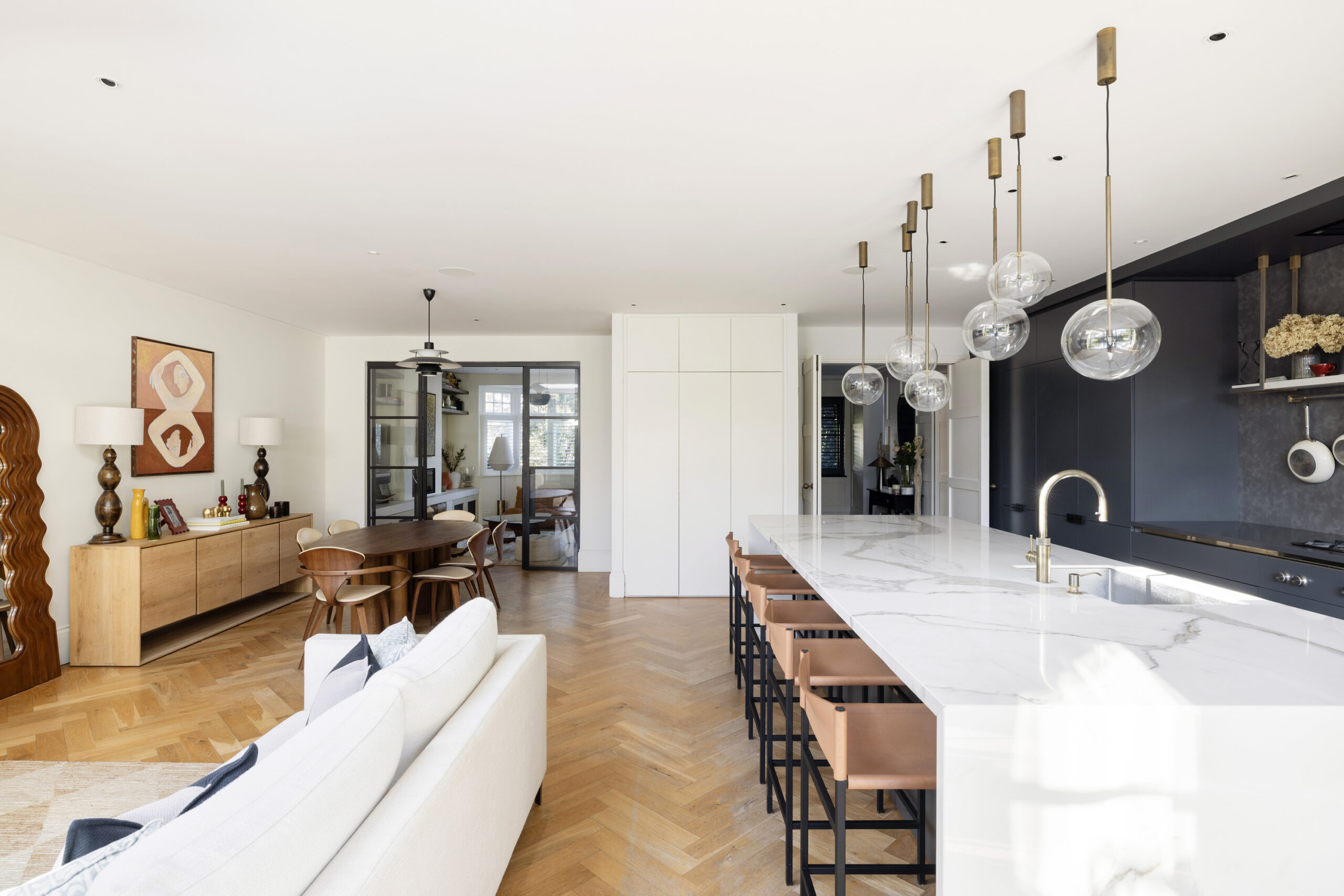 At its heart, an award-winning LANSERRING kitchen commands attention. A marble-topped waterfall island forms the centrepiece, fitted with a Quooker tap and Liebherr drinks fridge, paired with Paolo Tilche bar stools. Deep grey cabinetry and a mottled splashback set a sophisticated backdrop for AEG appliances, while pendant lights with brushed gold fittings add a soft, ambient glow.