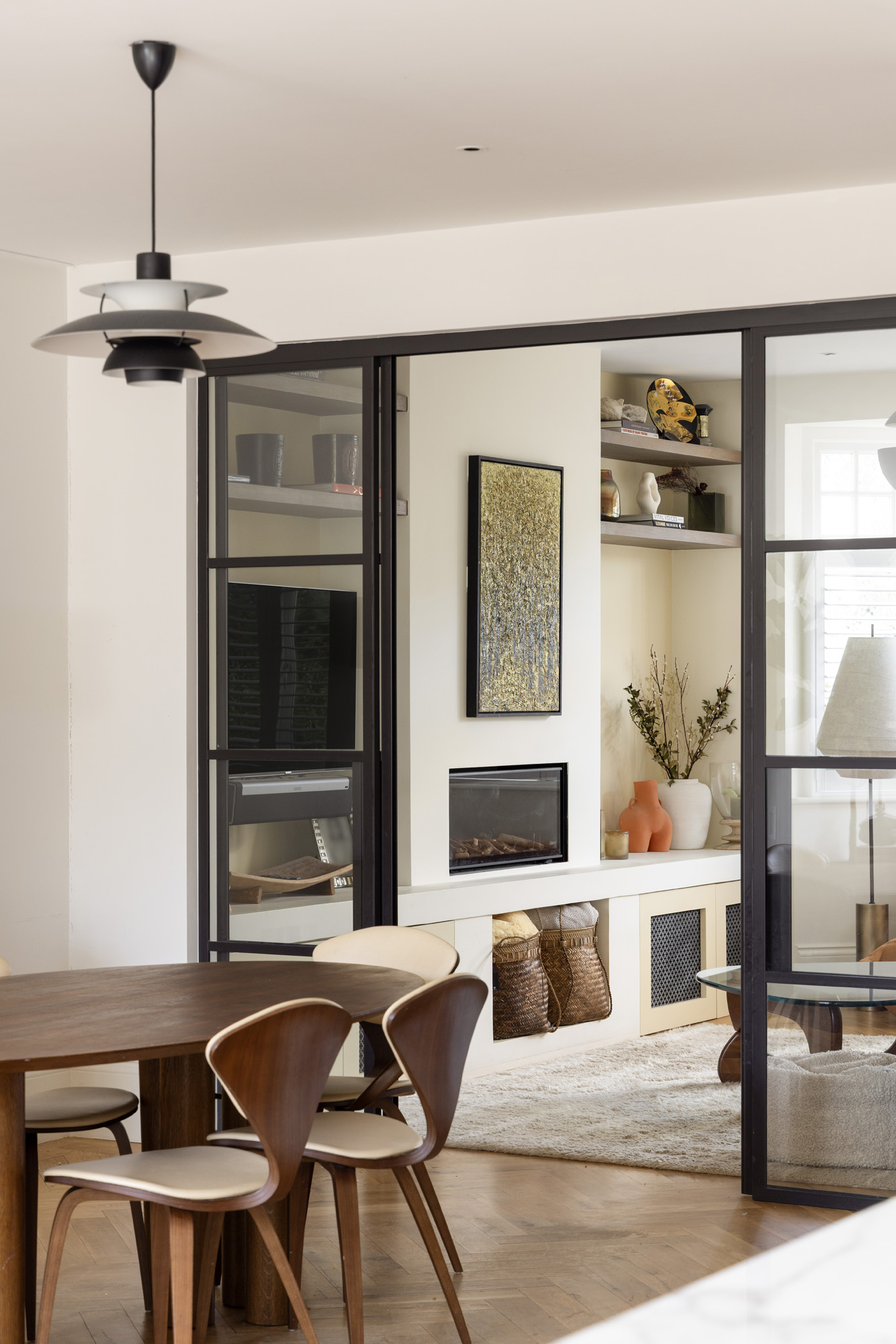 Across the room, the atmosphere shifts more intimate. Exposed brick columns, lit by uplighters, add texture and warmth, while a skylight brings natural light to the seating area below. A custom-made Nathan Lindberg oak dining table anchors the space, surrounded by six Norman Cherner chairs, creating an elegant yet inviting setting. A Fiddle-leaf fig and sculptural wave mirror are homely touches. Through Crittall-style doors, a snug beckons – cosy and cocooning with a remote-controlled fire, Ligne Roset Togo sofa and a timeless Noguchi coffee table.