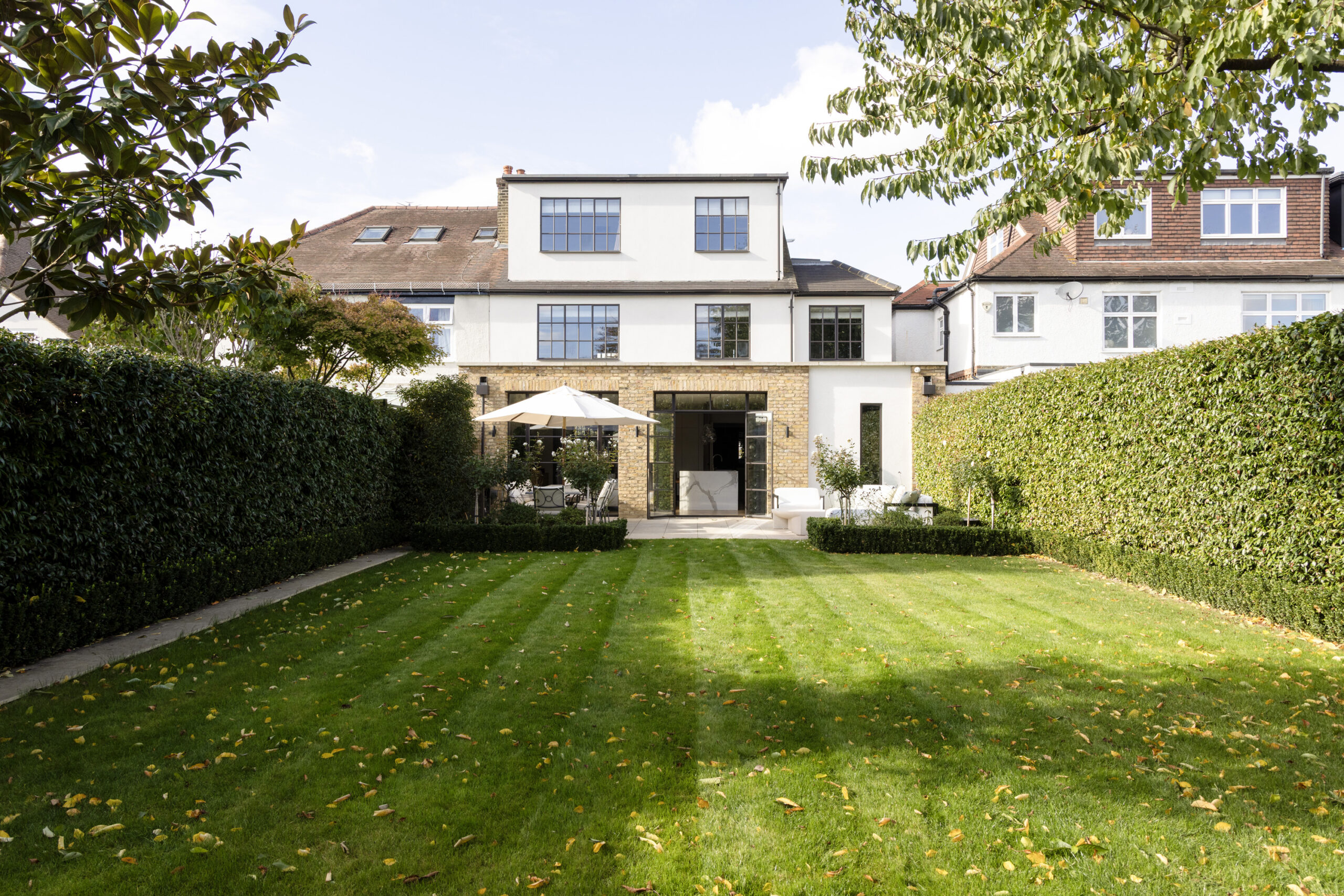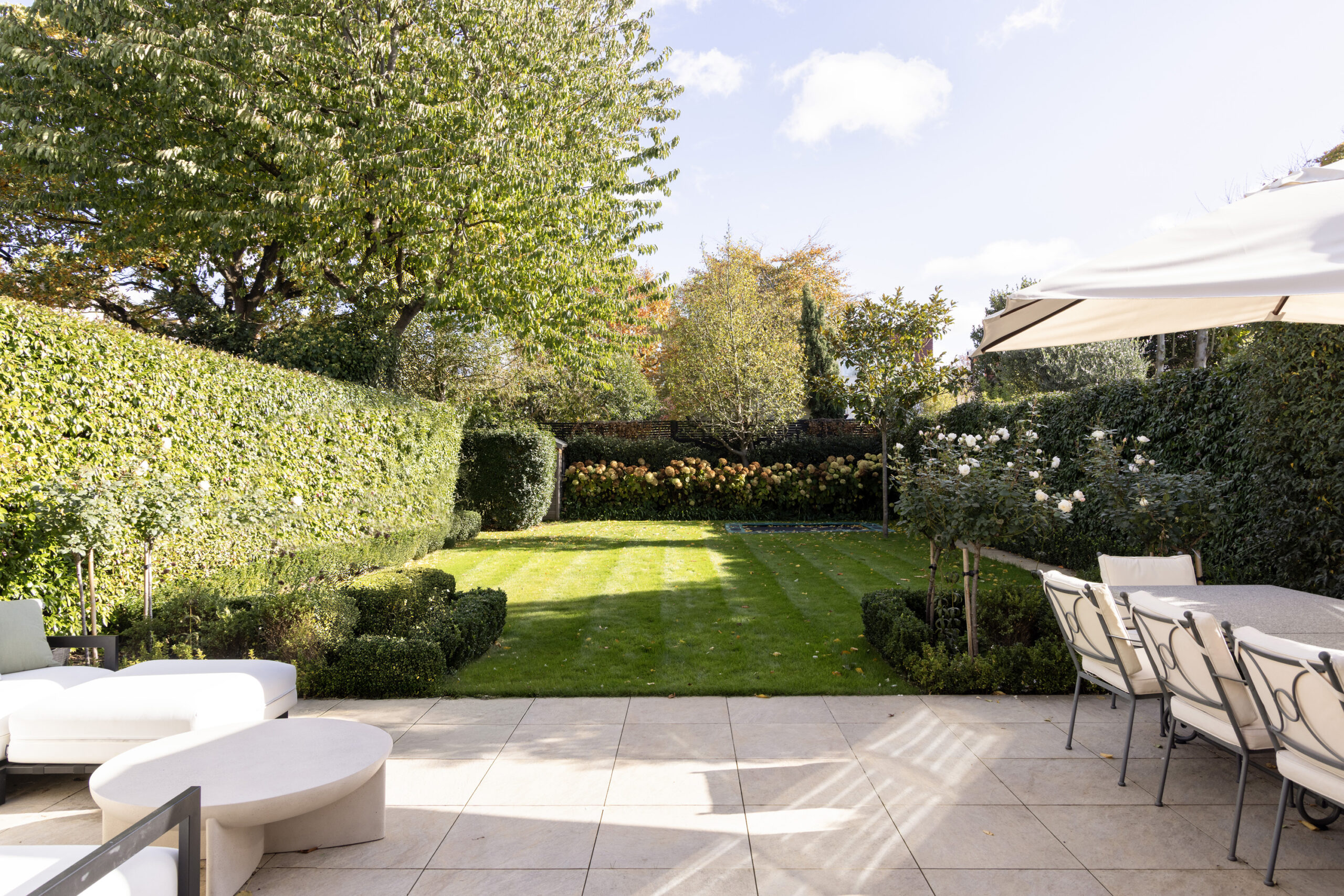 At the back of the home, double Crittall doors lead out to the landscaped garden, where a flagstone patio gives way to a manicured lawn. Outdoor furniture by Domkapa and Neptune creates a considered setting for alfresco dining and summer gatherings.