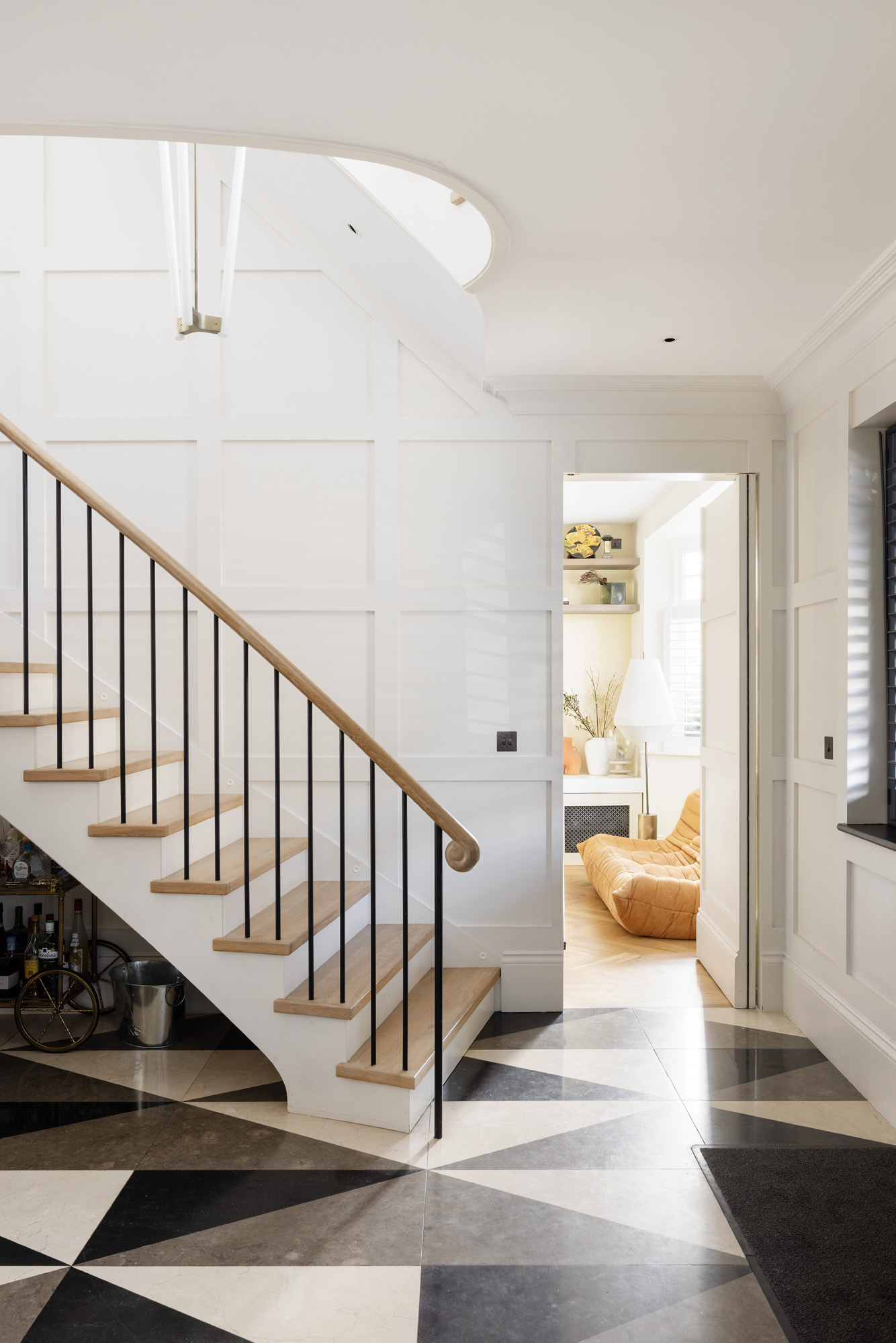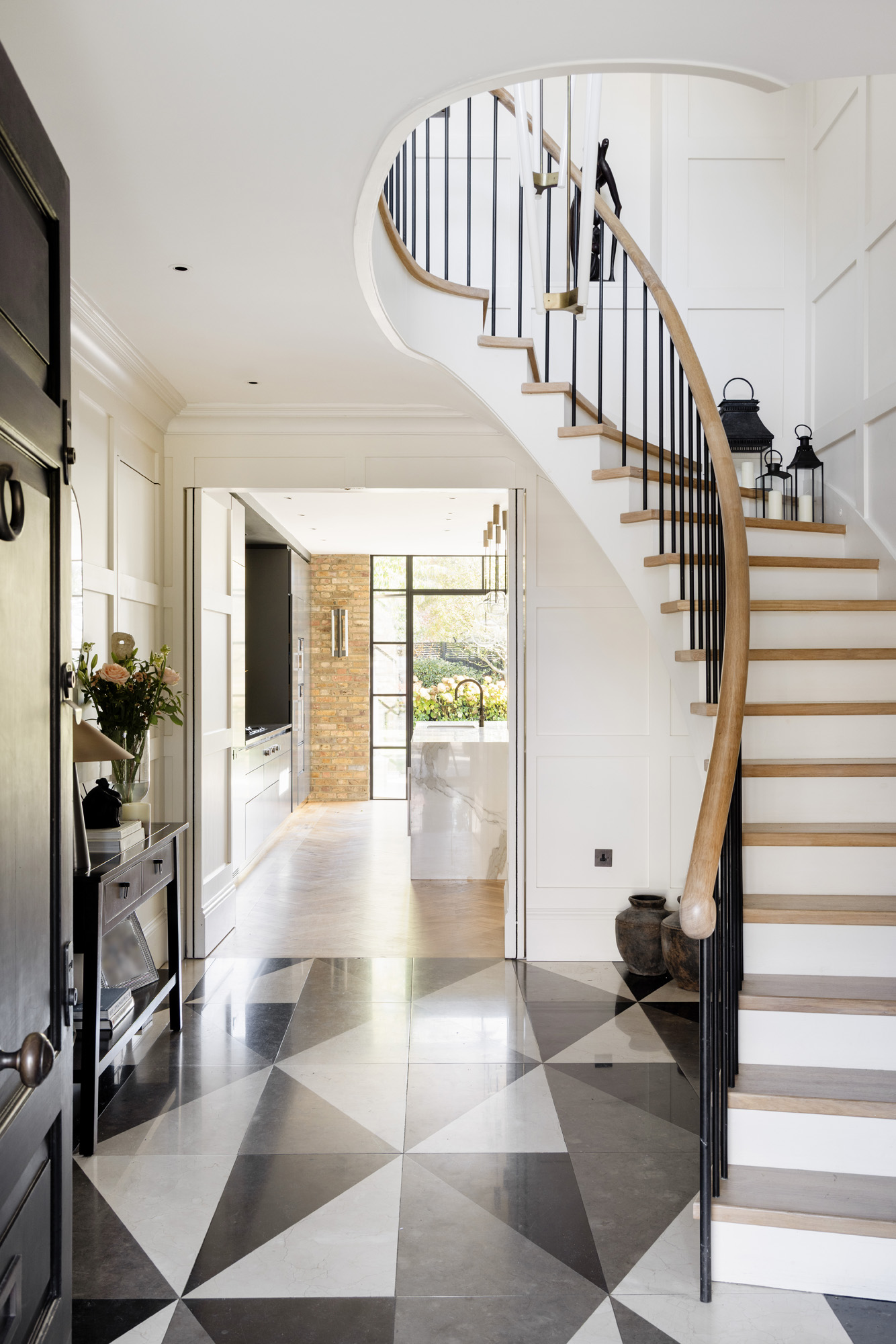 An archway of greenery leads through the front door and into an impressive hallway that sets the tone: marble flooring and a striking spiral staircase. Behind a hidden panelled door, a study offers privacy and focus. Beyond, monochrome tiles give way to detailed parquet flooring as the open-plan kitchen, dining and reception room unfolds – a space conceived for modern living and effortless entertaining.