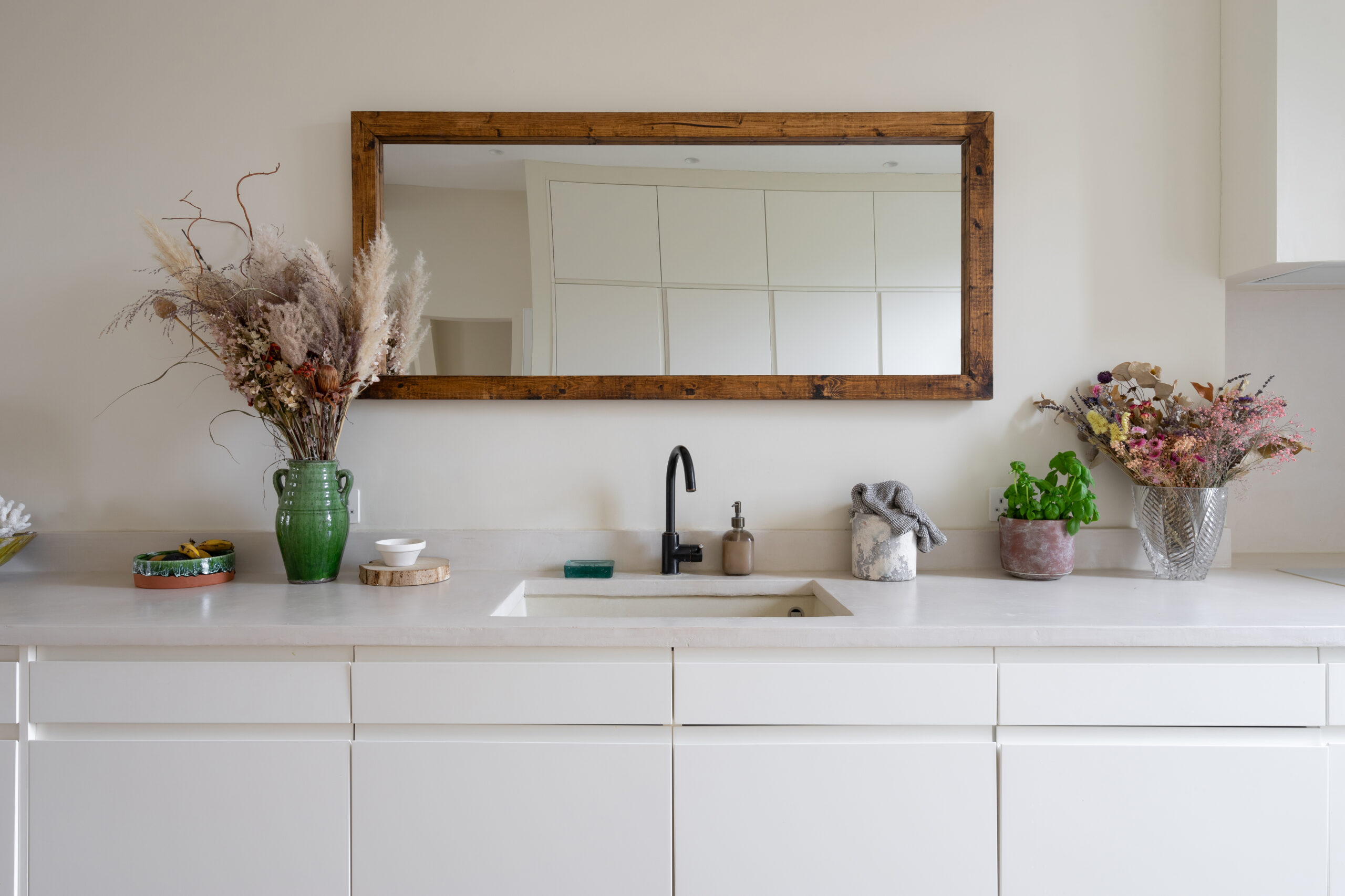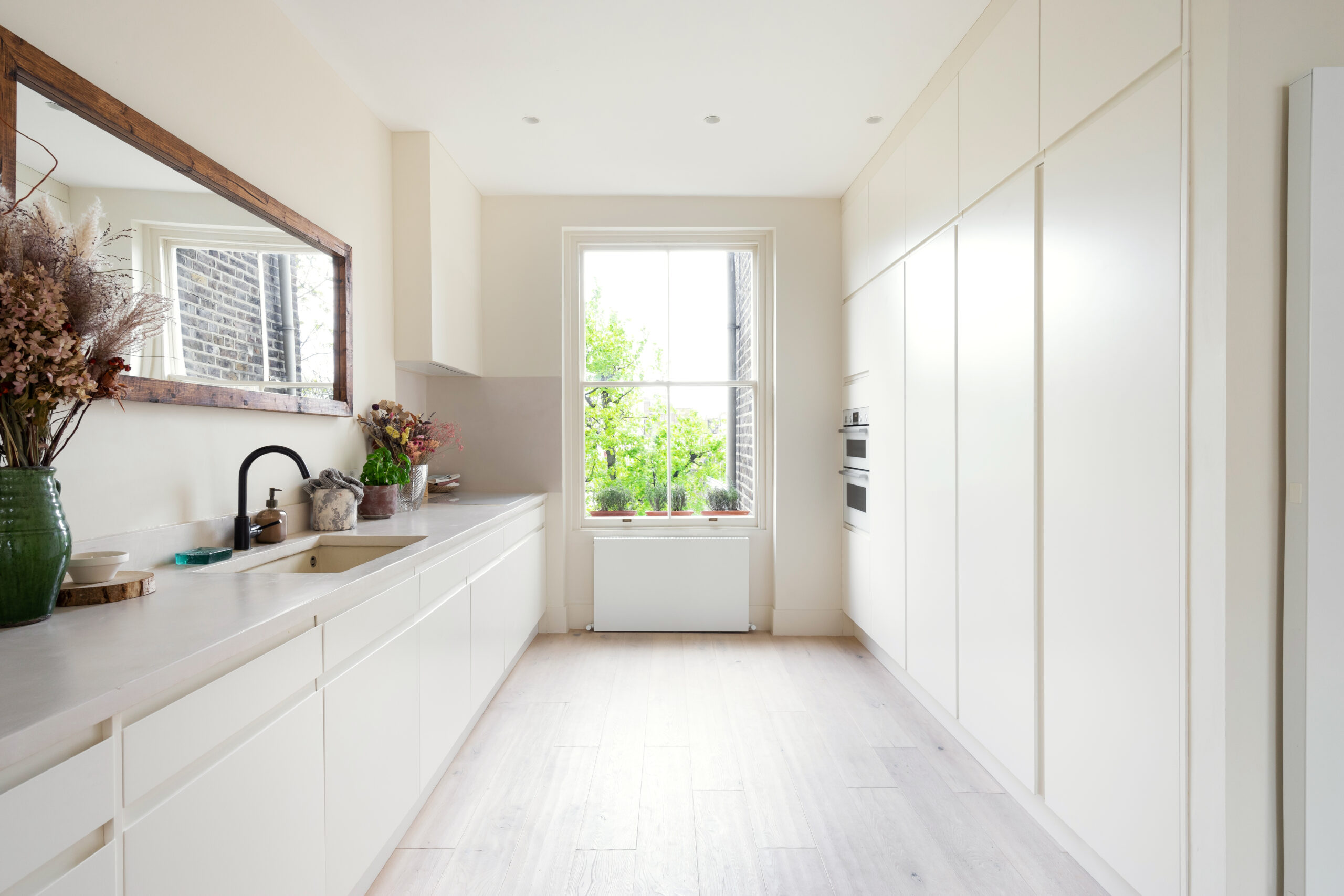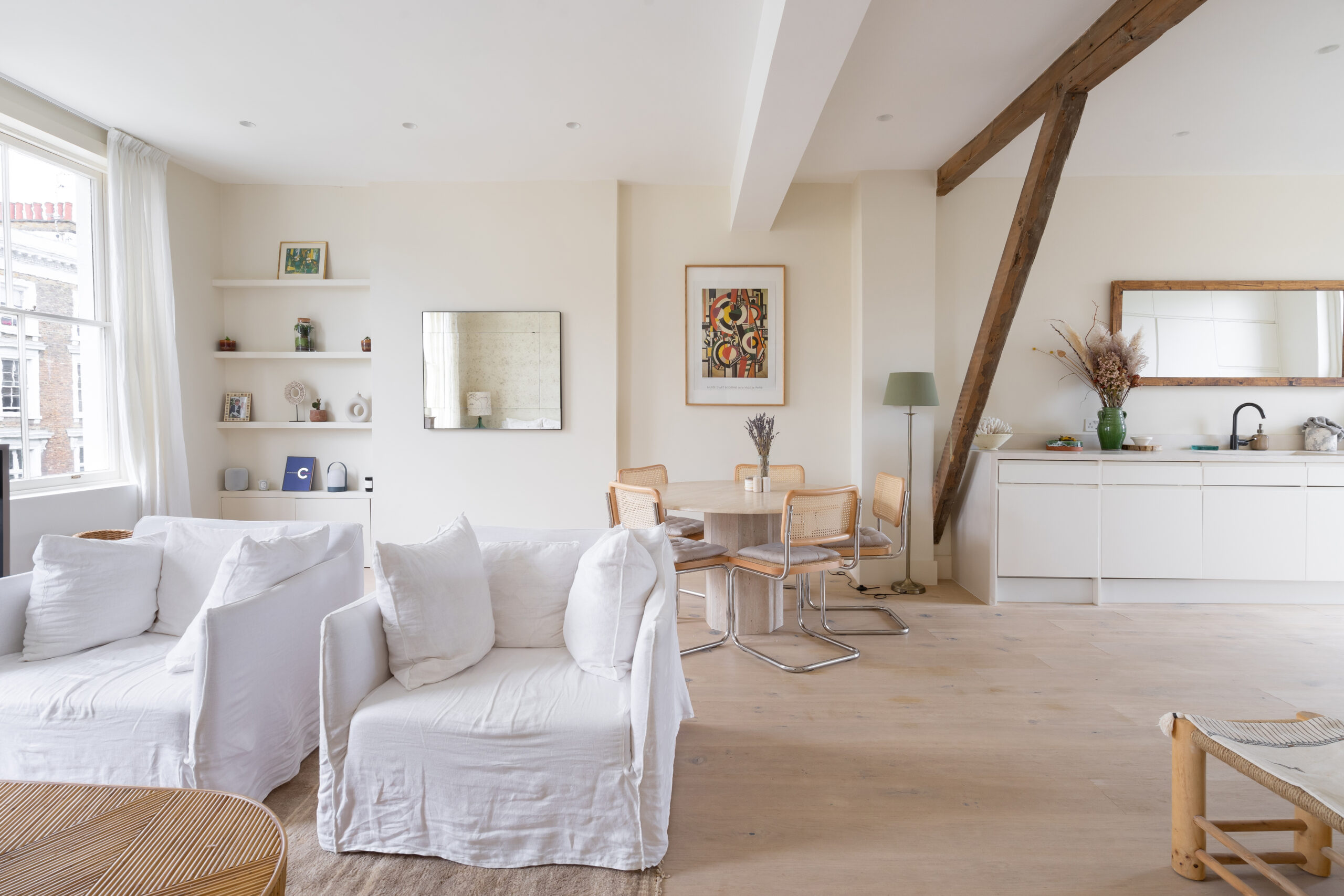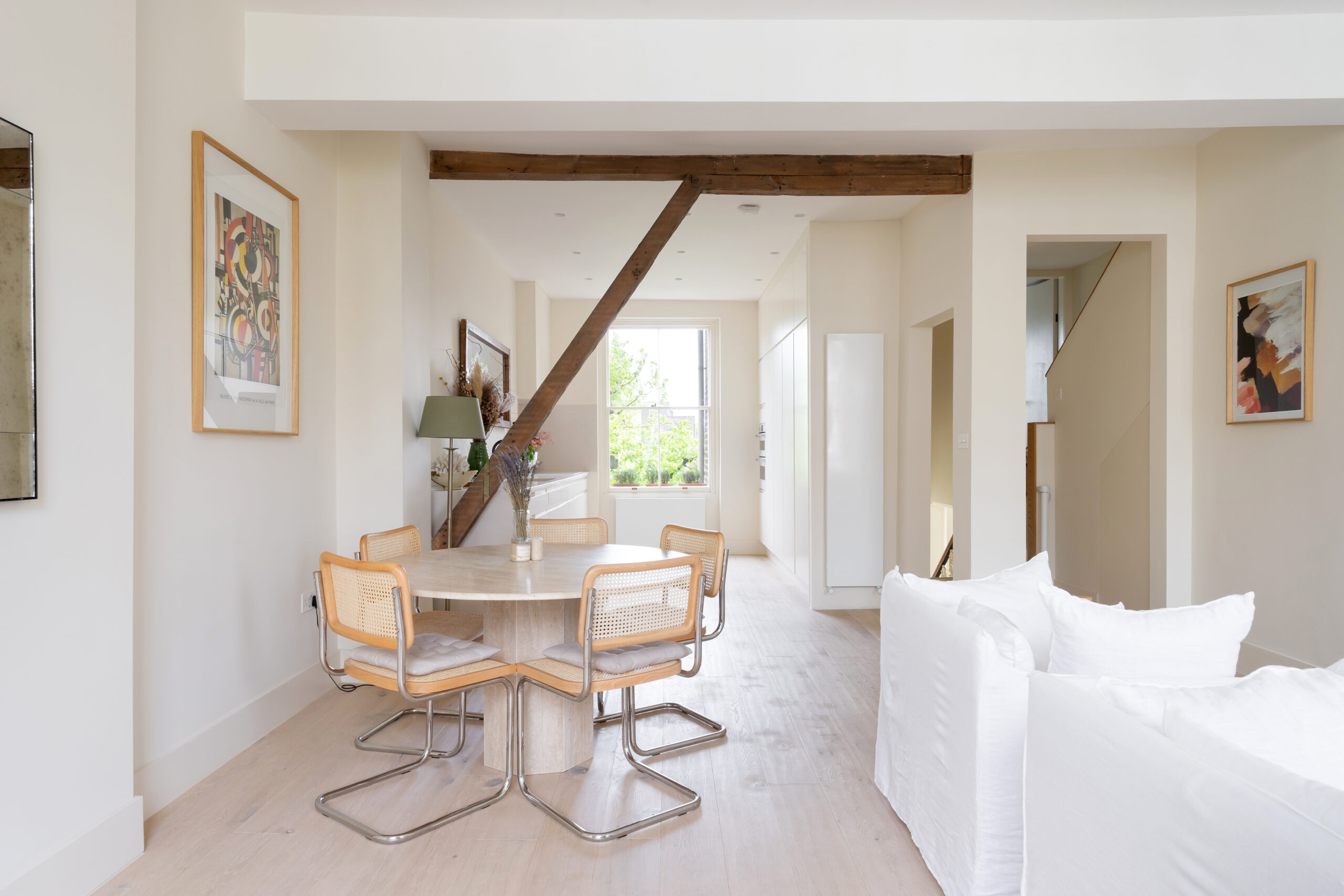 Introduced with pale wood floors, the home opens into a spacious open-plan kitchen, dining and reception room. There’s an uplifting atmosphere to the whitewashed setting, with reams of natural light that pour in through dual-aspect fenestration. Two tuxedo sofas are arranged for conversation, a circular marble table is complemented with mid century-style dining chairs and open shelving showcases statement pieces of art. An exposed timber beam brings textural charm and works to delineate the kitchen beyond. Smooth worktops, handless cabinetry and integrated appliances make for a sleek and streamlined culinary environment.