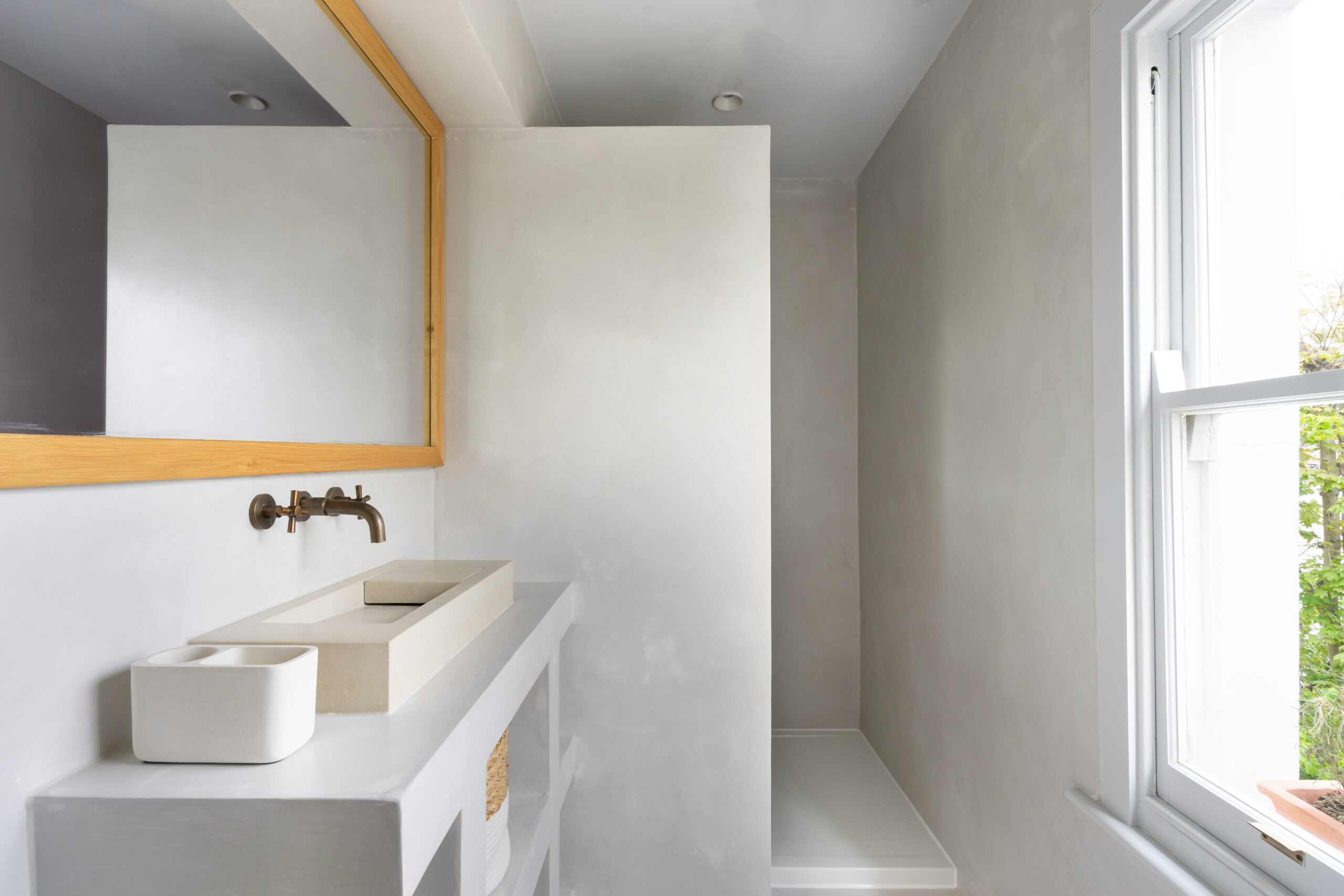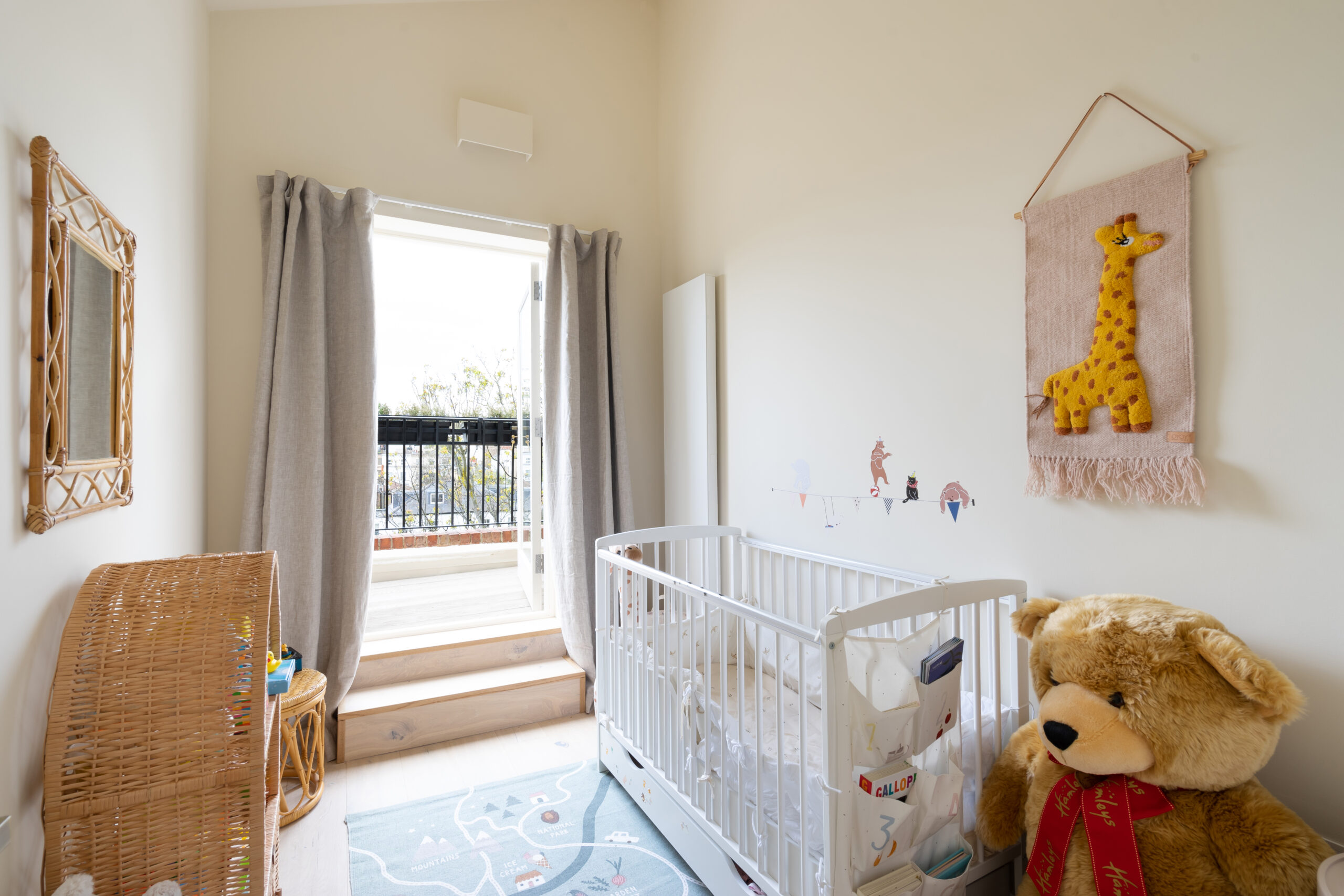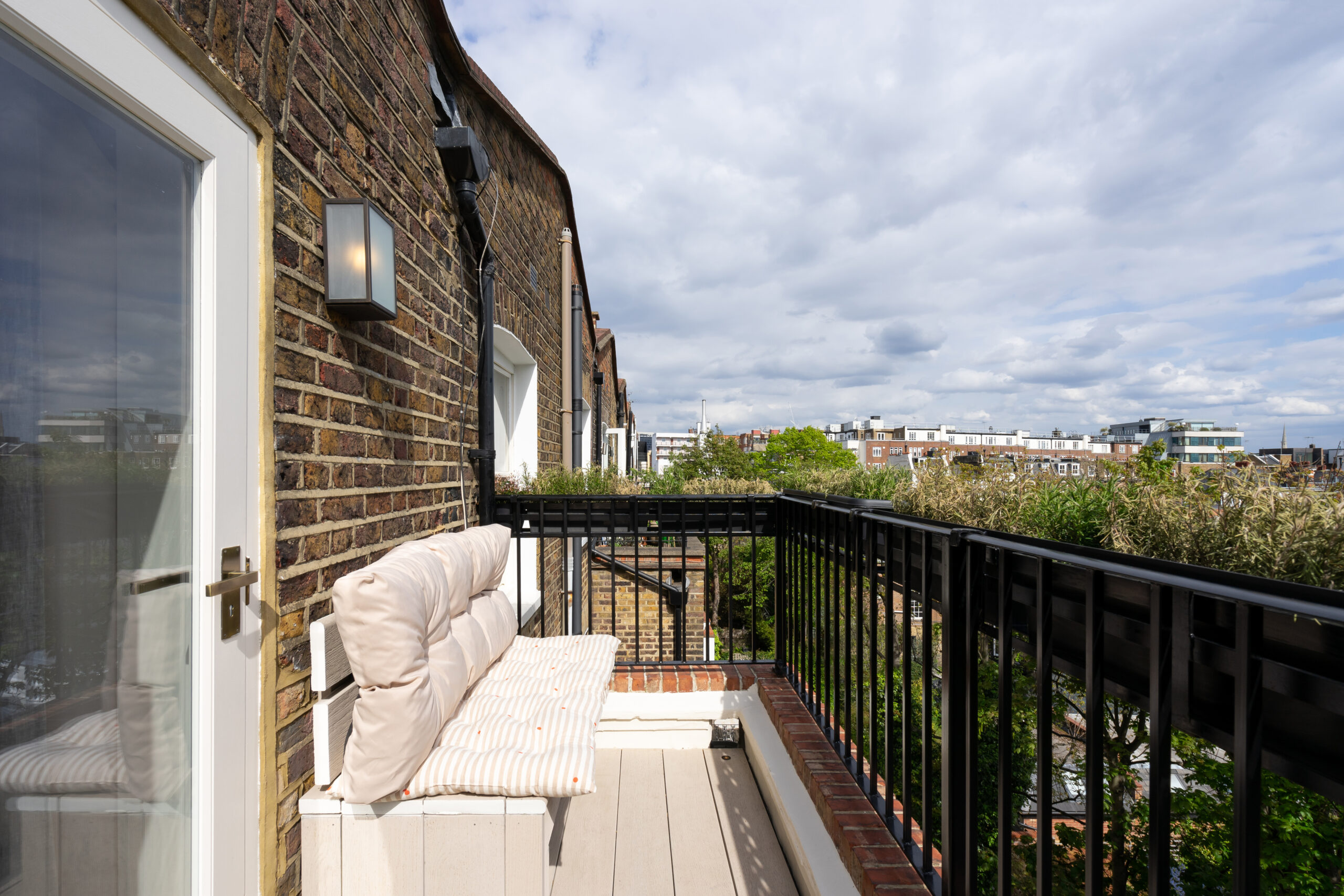 Upstairs, three bedrooms continue the restful ambiance. With its gently sloping butterfly roof, wall-to-wall storage and pared-back colour scheme, the principal bedroom is a tranquil scene. Next door, an en suite bathroom is a modern affair, with its clean lines, minimalist sink and inviting walk-in shower. Two guest bedrooms – one of which is currently configured as a nursery – are served by a shower room on the half landing. During London’s warmer months, head out to the suntrap terrace which overlooks the neighbouring roofscape.