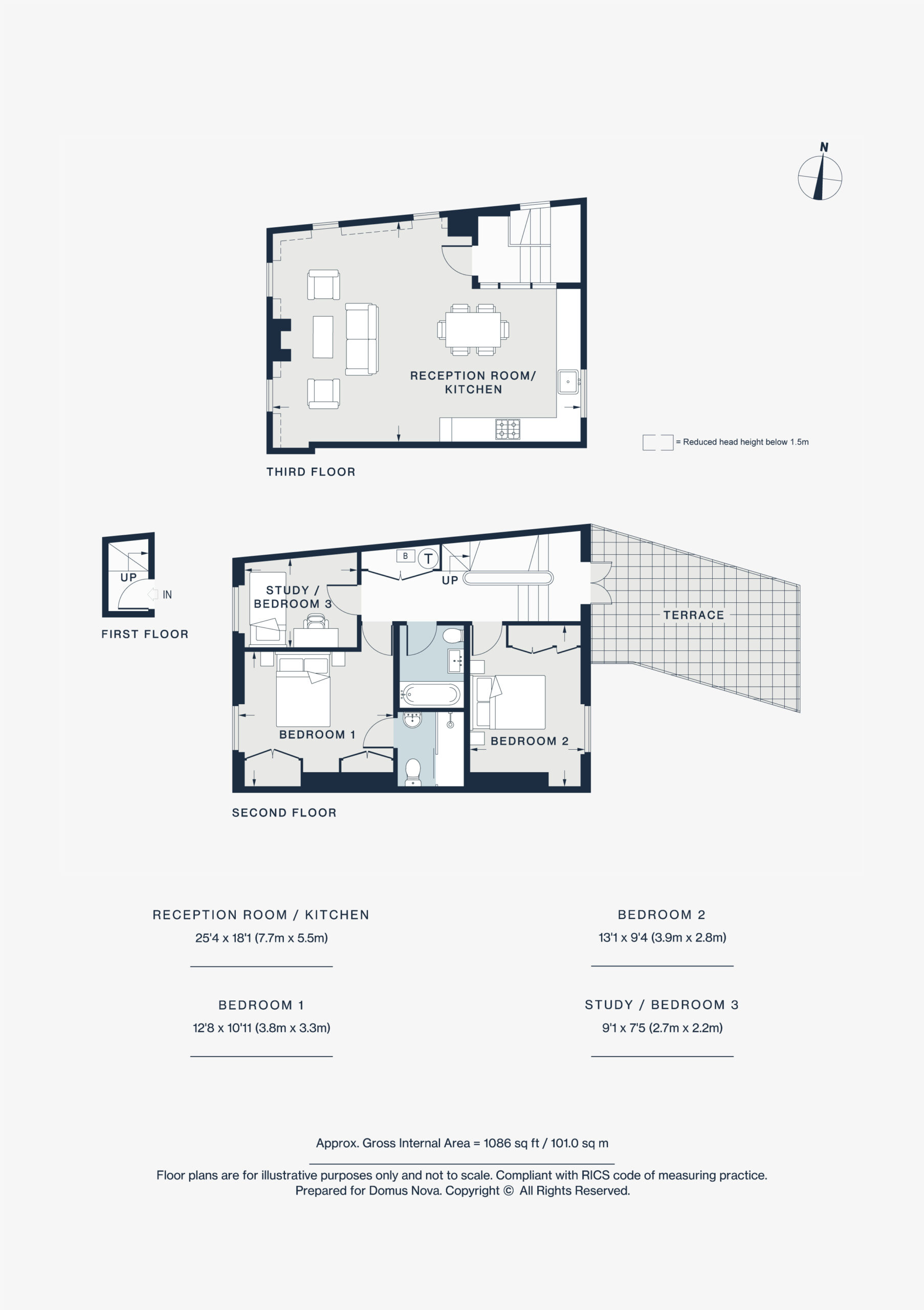 A Crittall-style glass door opens to a stairwell awash with natural light, leading down to the second floor’s tranquil sleeping quarters. Here, heritage details – intricate wooden floors and cast-iron radiators – are a nod to the home’s period character. The principal bedroom suite features wall-to-wall storage, soft sisal carpet and a contemporary shower room. Two additional bedrooms maintain the neutral palette, served by a family bathroom lined with large Bert & May tiles.