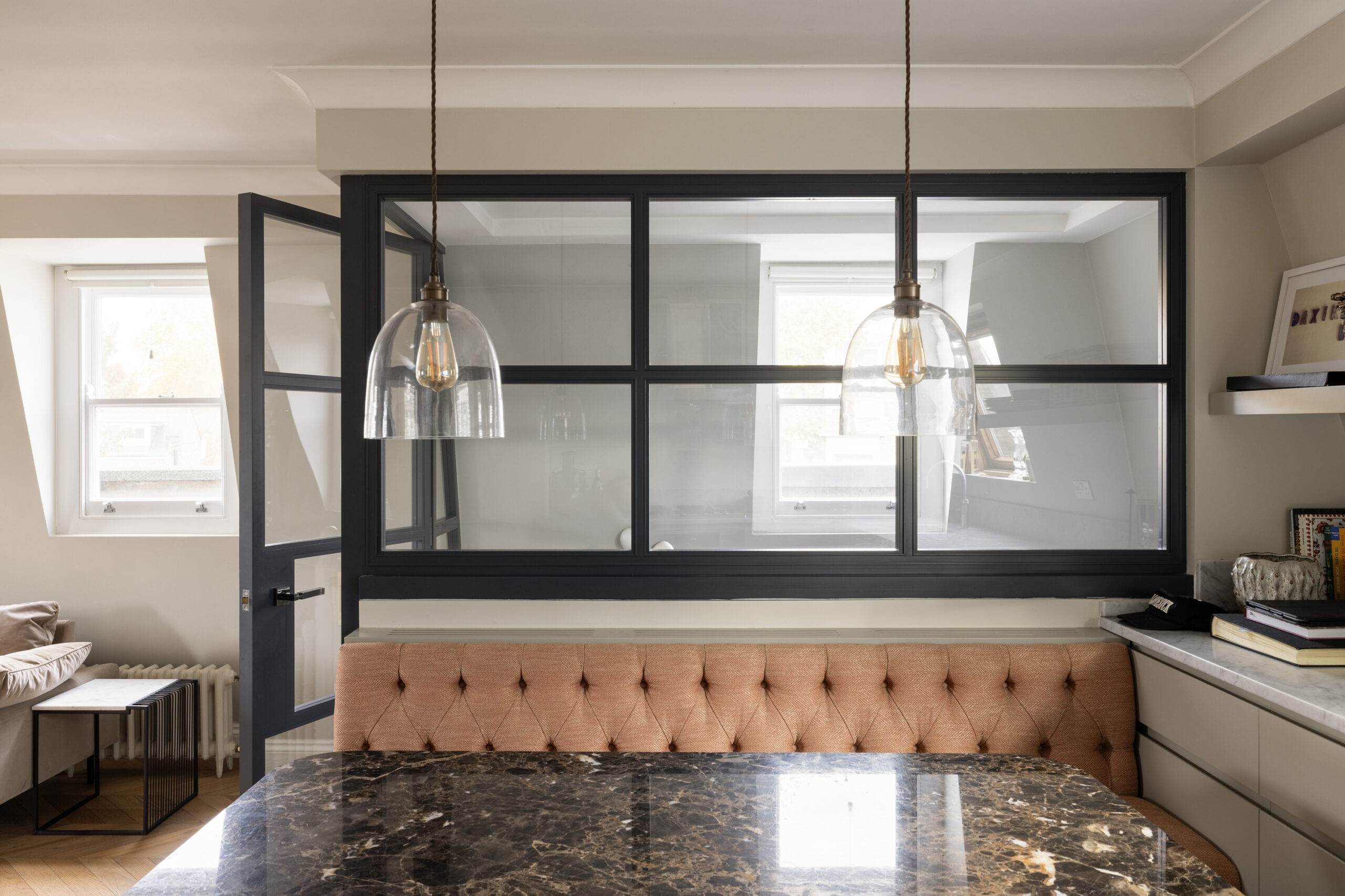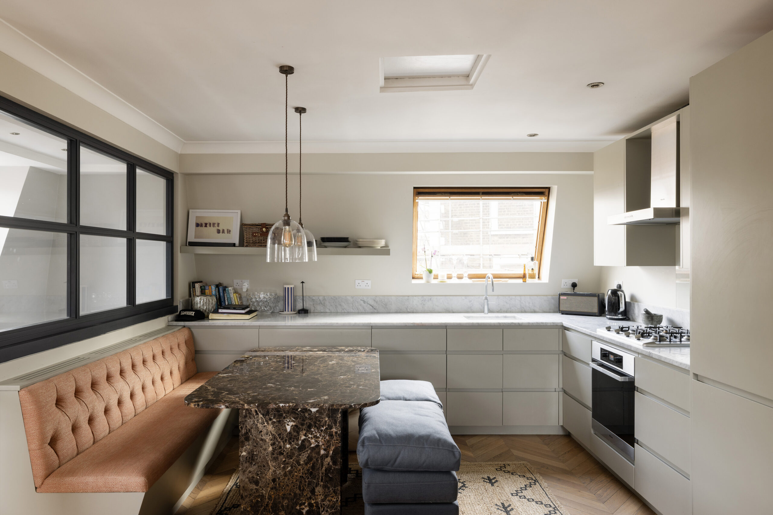 Miele appliances, a Quooker tap and an integrated banquette seating area complete a space as practical as it is refined.