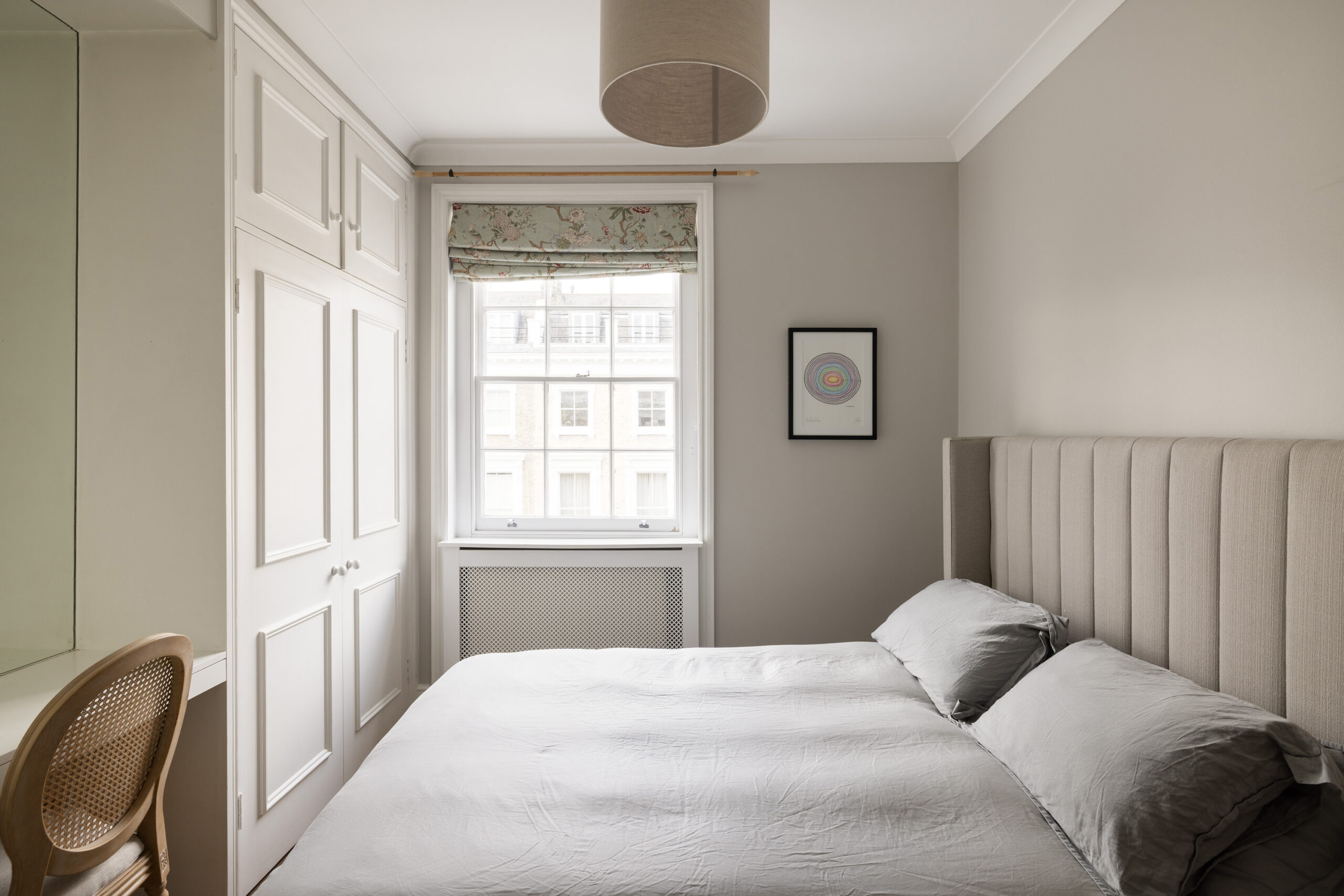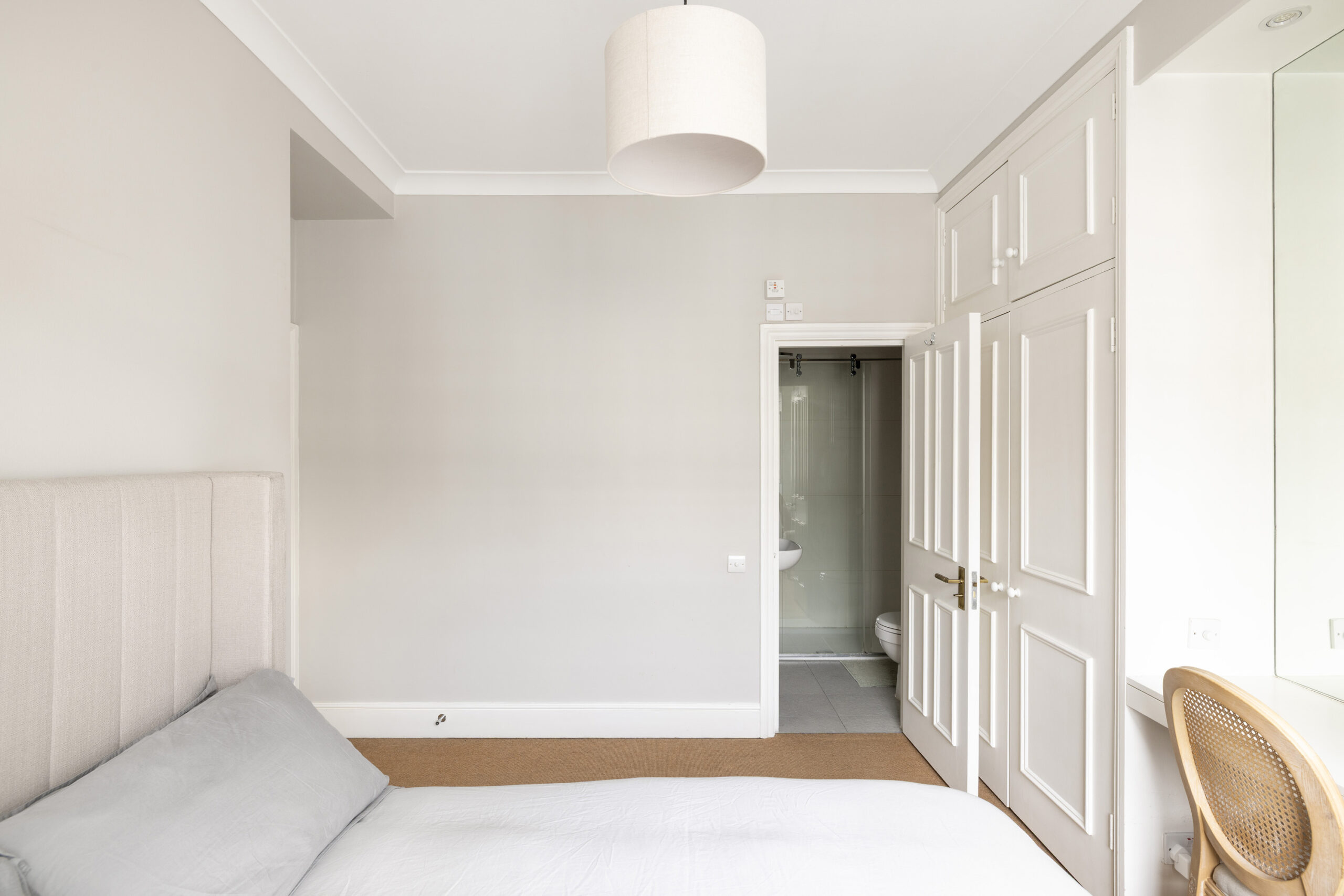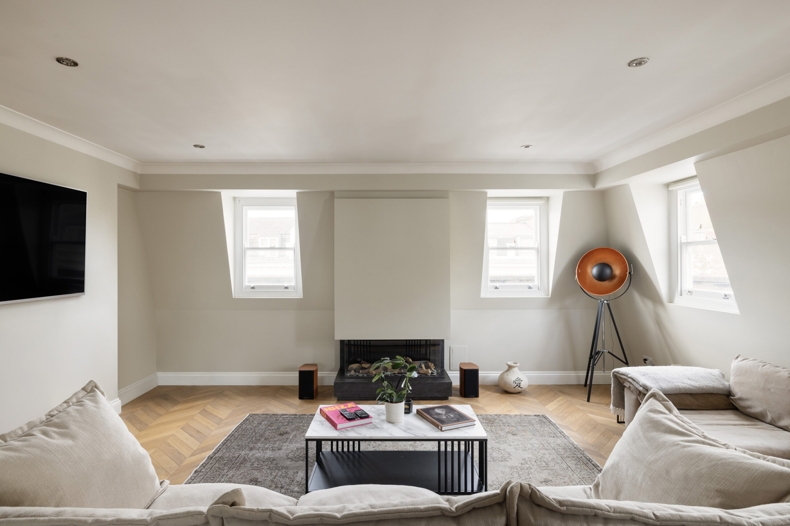 Beyond the wisteria-draped, pale brick façade, this second- and third-floor duplex reveals a light-filled, impeccably finished home. Designed by De Rosee Sa, the upper level unfolds as a considered open-plan living space where form meets function. Wooden parquet floors complement Farrow & Ball Cornforth White walls, while bespoke McCarron & Co. cabinetry and a Calacatta marble worktop bring understated elegance to the kitchen. Miele appliances, a Quooker tap and an integrated banquette seating area complete a space as practical as it is refined. Across the room, a Marble Hill Bellfire fireplace provides a warm focal point for relaxed evenings in.
