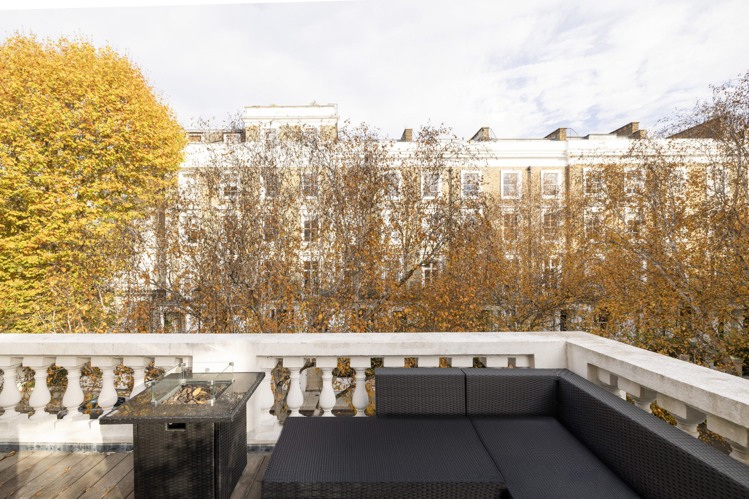 Steps from the second floor lead onto the home’s private roof terrace. A classic cast stone balustrade contains the space with wooden decking underfoot, a leafy outlook and an east-facing orientation – ideal for the morning sun.