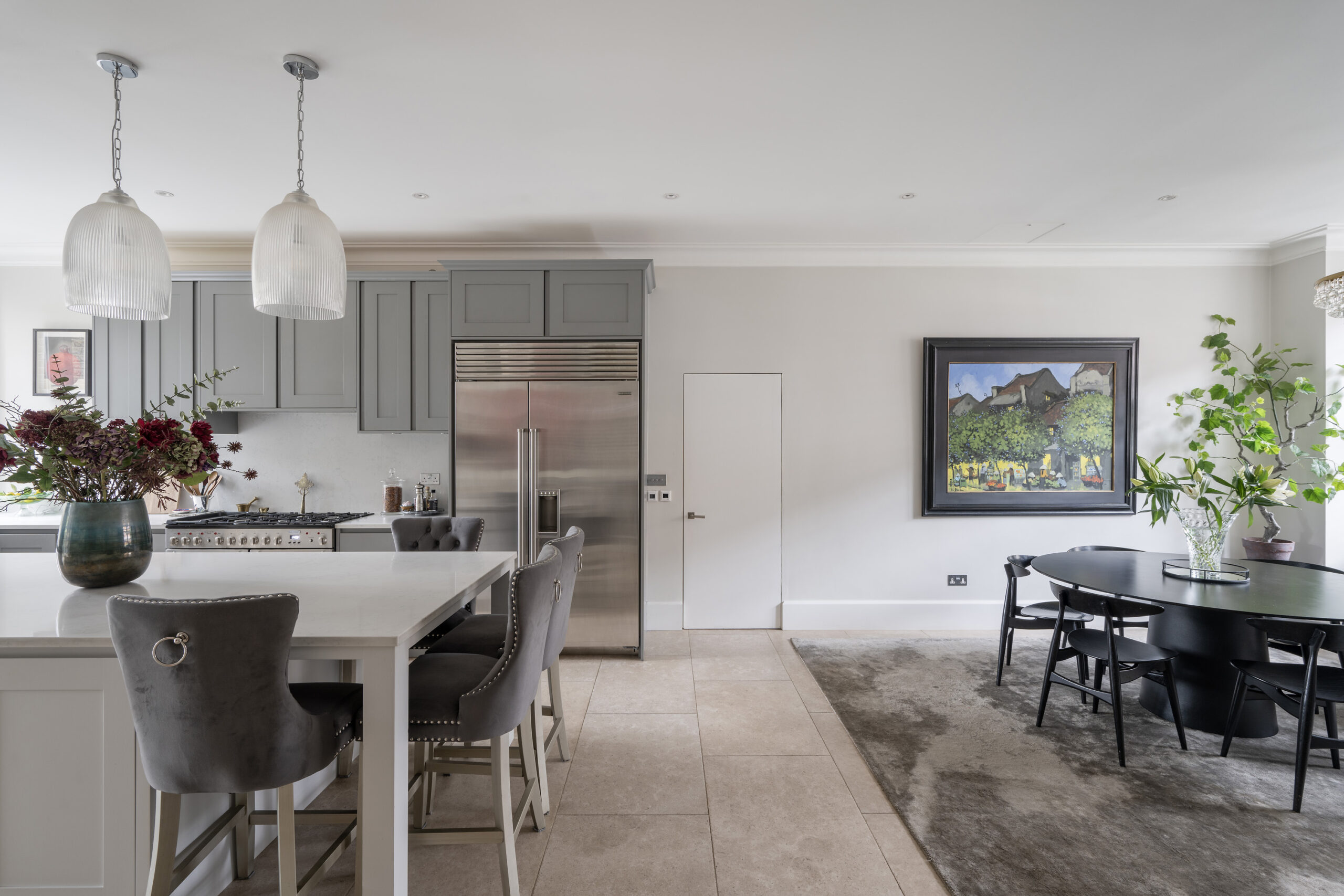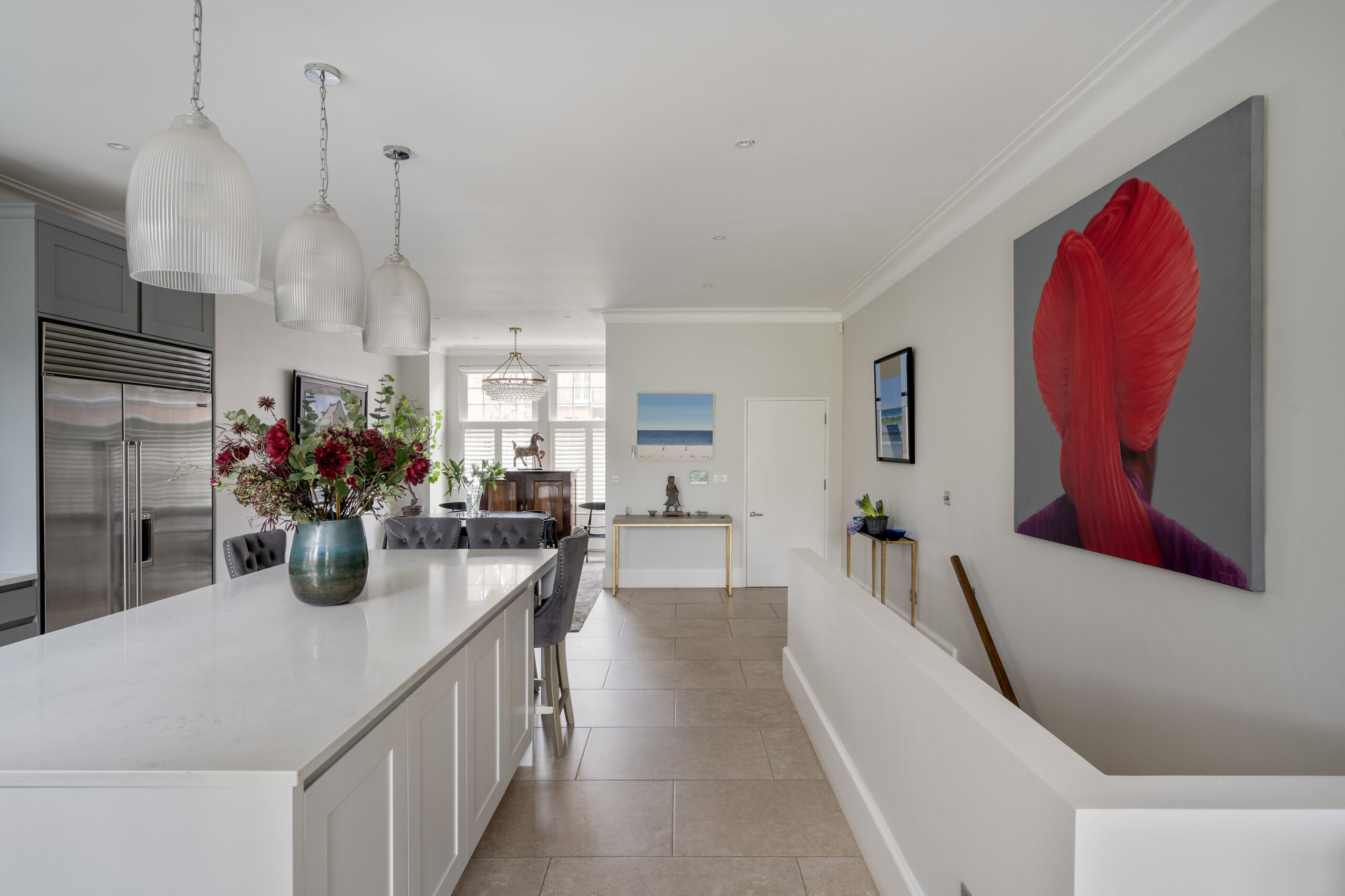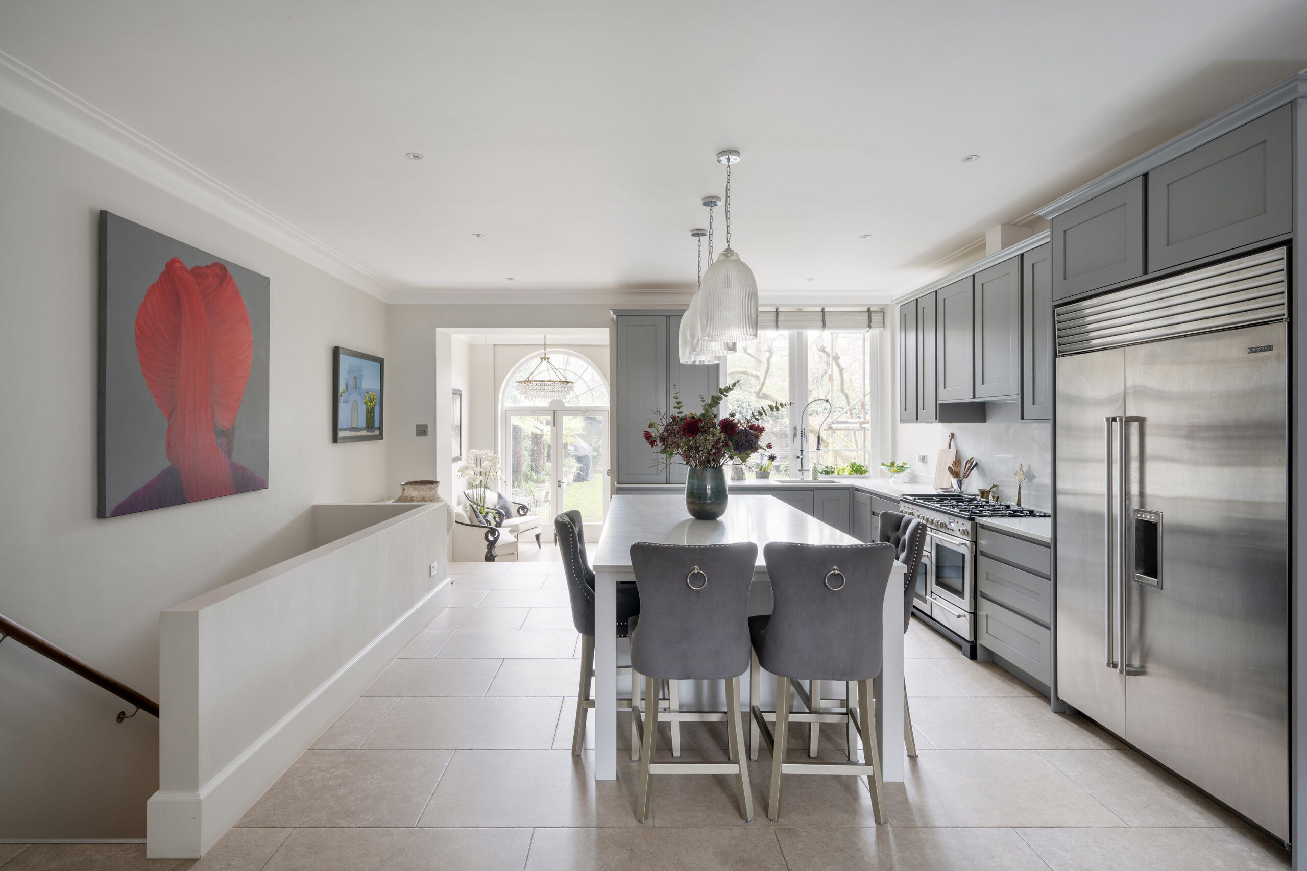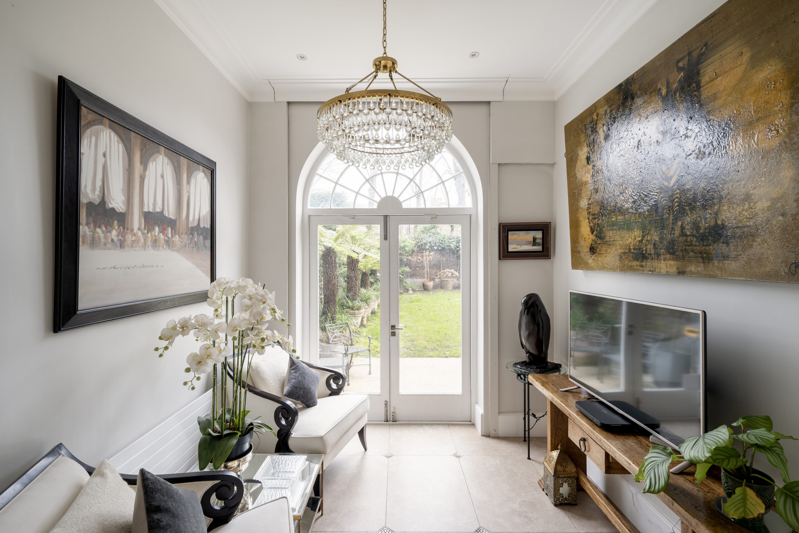 Through a grand private entrance, a neutral colour palette accentuates the open, airy feel in the well-proportioned kitchen and dining room. Cornicing crowns the lofty ceilings – a reminder of the home’s Victorian past, while a sleek, modern kitchen ensures the culinary setting is in the present. Beneath glass pendant lighting, a breakfast bar provides a central hub, while integrated appliances – including a Rangemaster stove and Sub-Zero fridge freezer – add to the streamlined finish. There’s also space for a table, illuminated by light from two large windows. At the rear of the home, descend to a TV room where an eye-catching arched window and French doors lead into the large, west-facing walled garden, bringing the outside in. The patio is perfect for al fresco feasting, while a shed provides convenient storage space.
