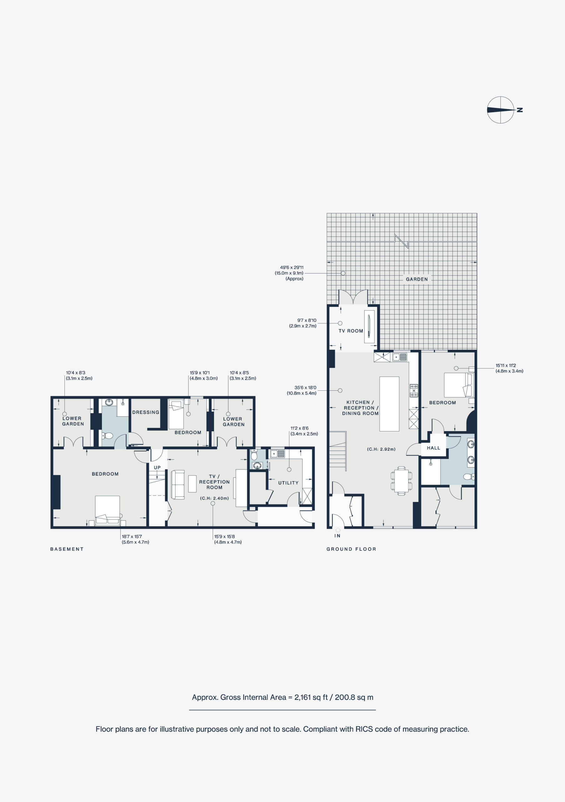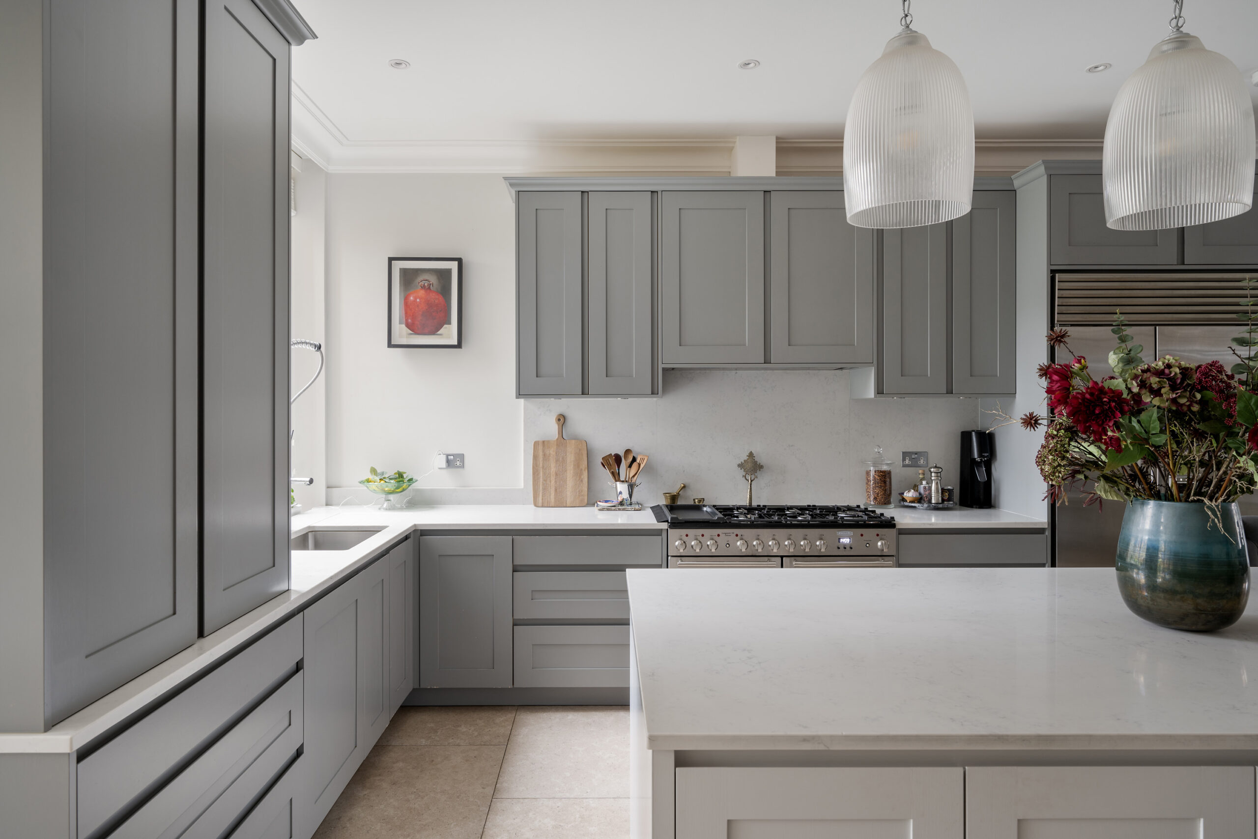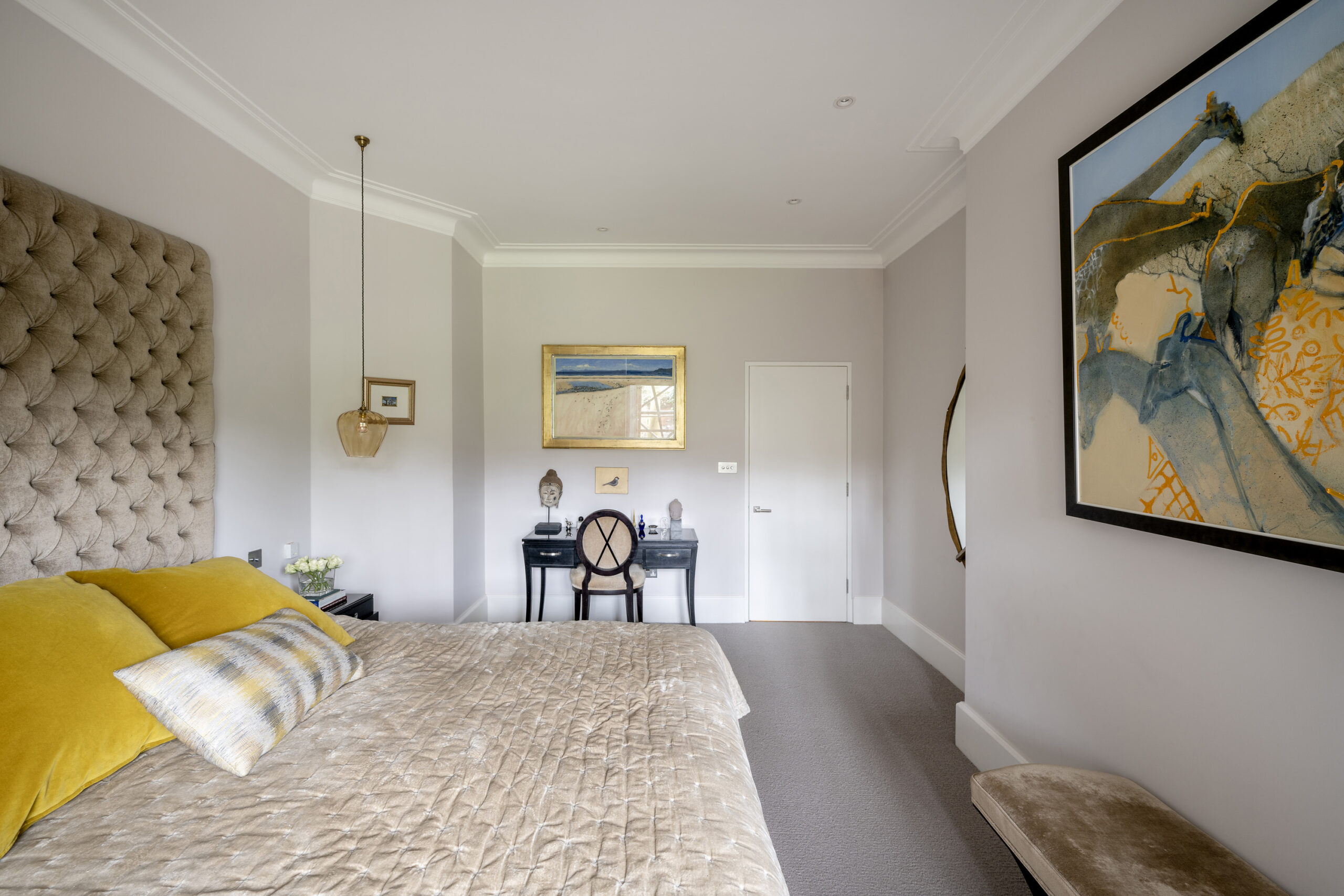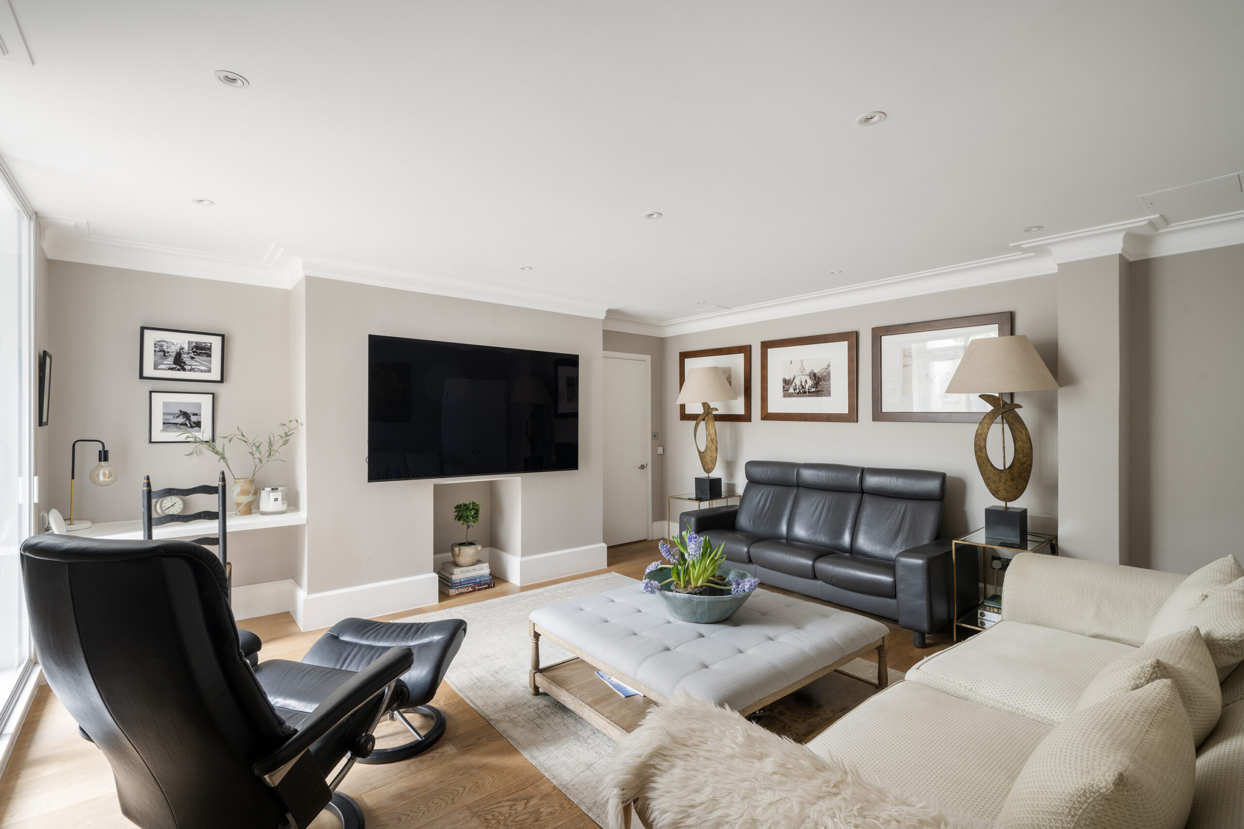 Through a grand private entrance, a neutral colour palette accentuates the open, airy feel in the well-proportioned kitchen and dining room. Cornicing crowns the lofty ceilings – a reminder of the home’s Victorian past, while a sleek, modern kitchen ensures the culinary setting is in the present. Beneath glass pendant lighting, a breakfast bar provides a central hub, while integrated appliances – including a Rangemaster stove and Sub-Zero fridge freezer – add to the streamlined finish. There’s also space for a table, illuminated by light from two large windows. At the rear of the home, descend to a TV room where an eye-catching arched window and French doors lead into the large, west-facing walled garden, bringing the outside in. The patio is perfect for al fresco feasting, while a shed provides convenient storage space.