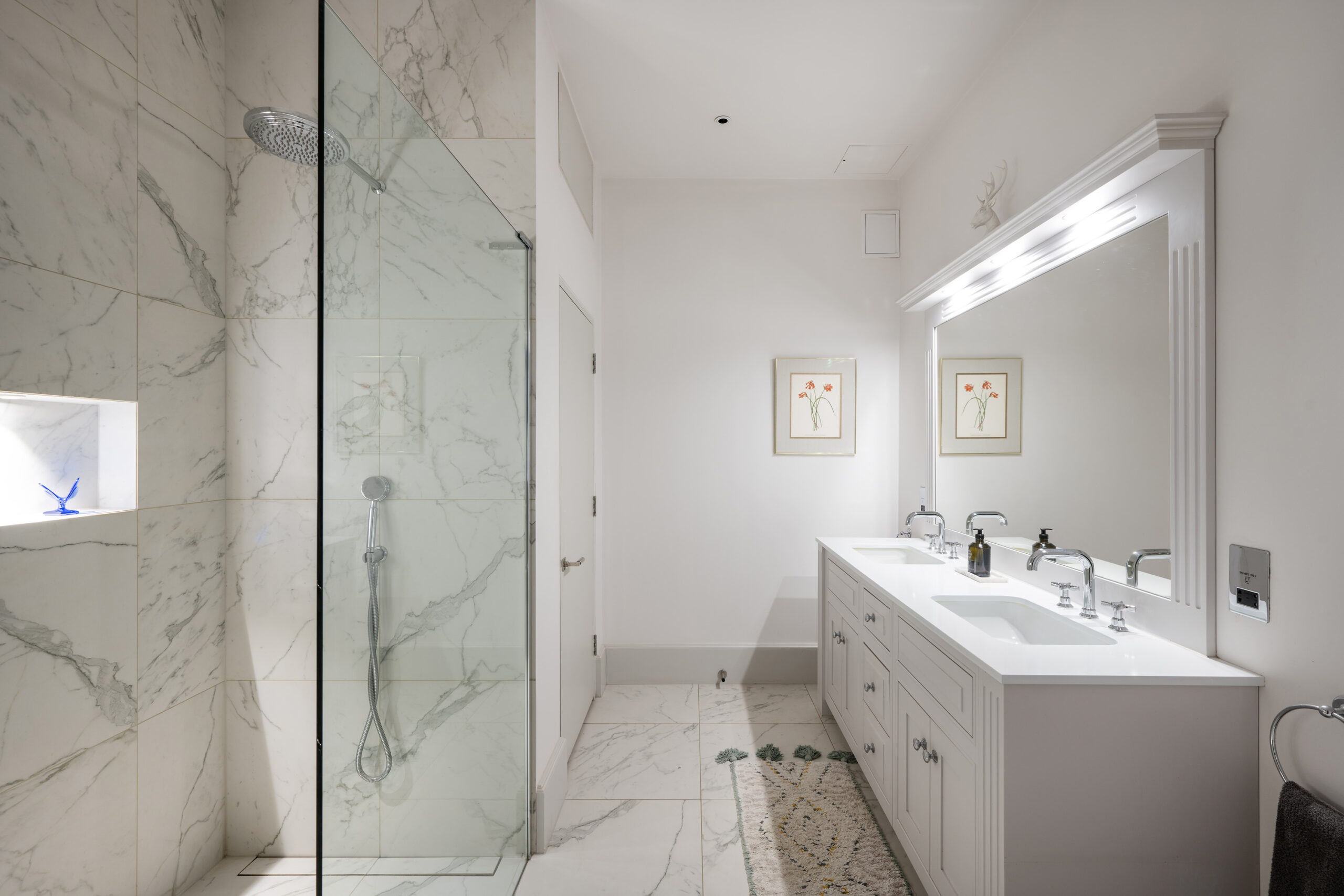 Back inside, neutral tones continue into the principal bedroom where a sense of calm unfolds. White walls meld into large format tiles in the family bathroom, which pairs a dual vanity with a walk in rainfall shower. A dressing room sits off the bathroom with plenty of build-in storage.