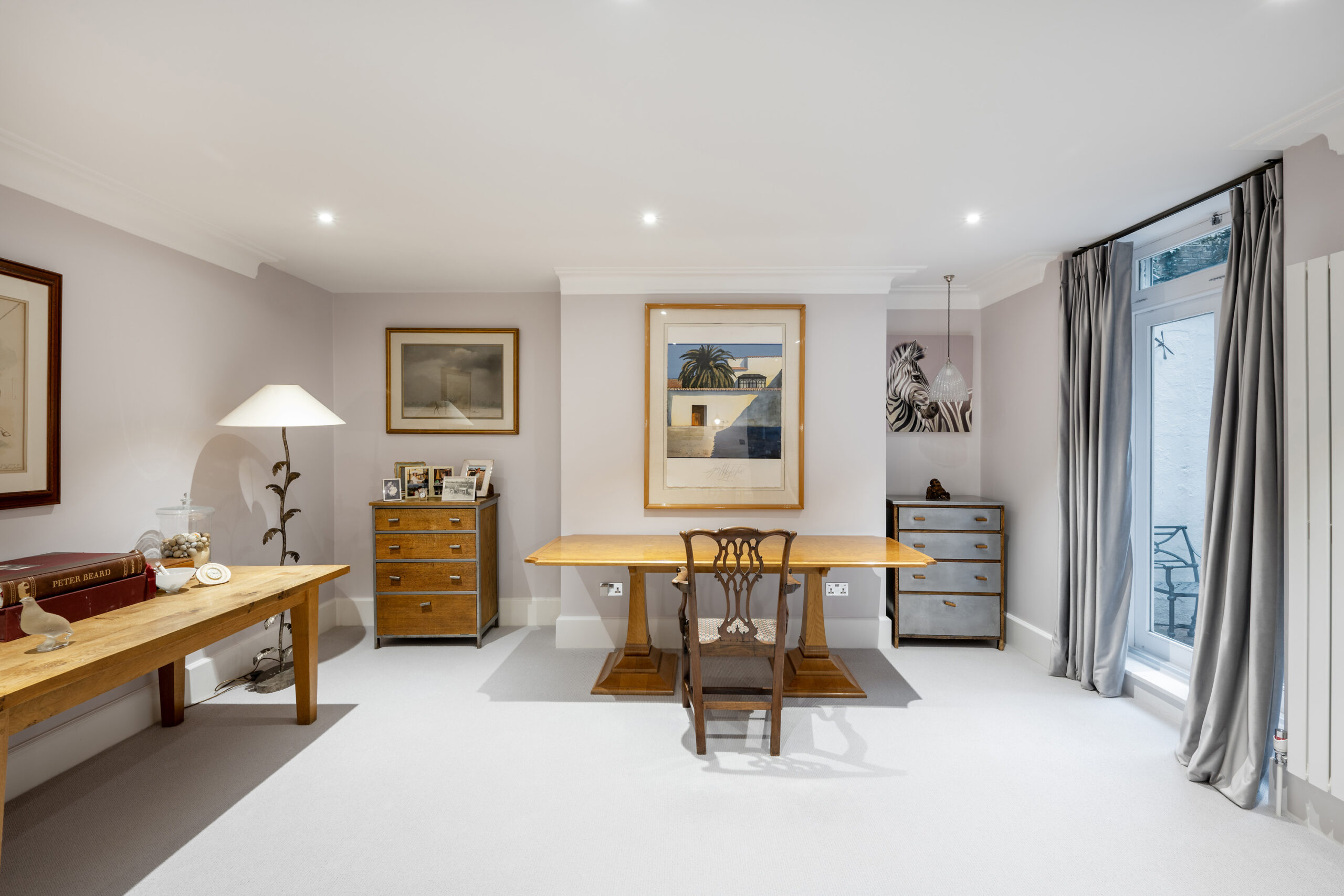 Downstairs, further living spaces unfold. Considered design flows across a second kitchen and a reception room. In the living area, a custom-built desk offers versatility to be used as a study. A door to one of the lower ground patios floods the space with natural light. Also on this floor, two guest bedrooms – one with a dressing room, the other with access to a second lower ground patio – sit alongside a second family bathroom with a rainfall shower.