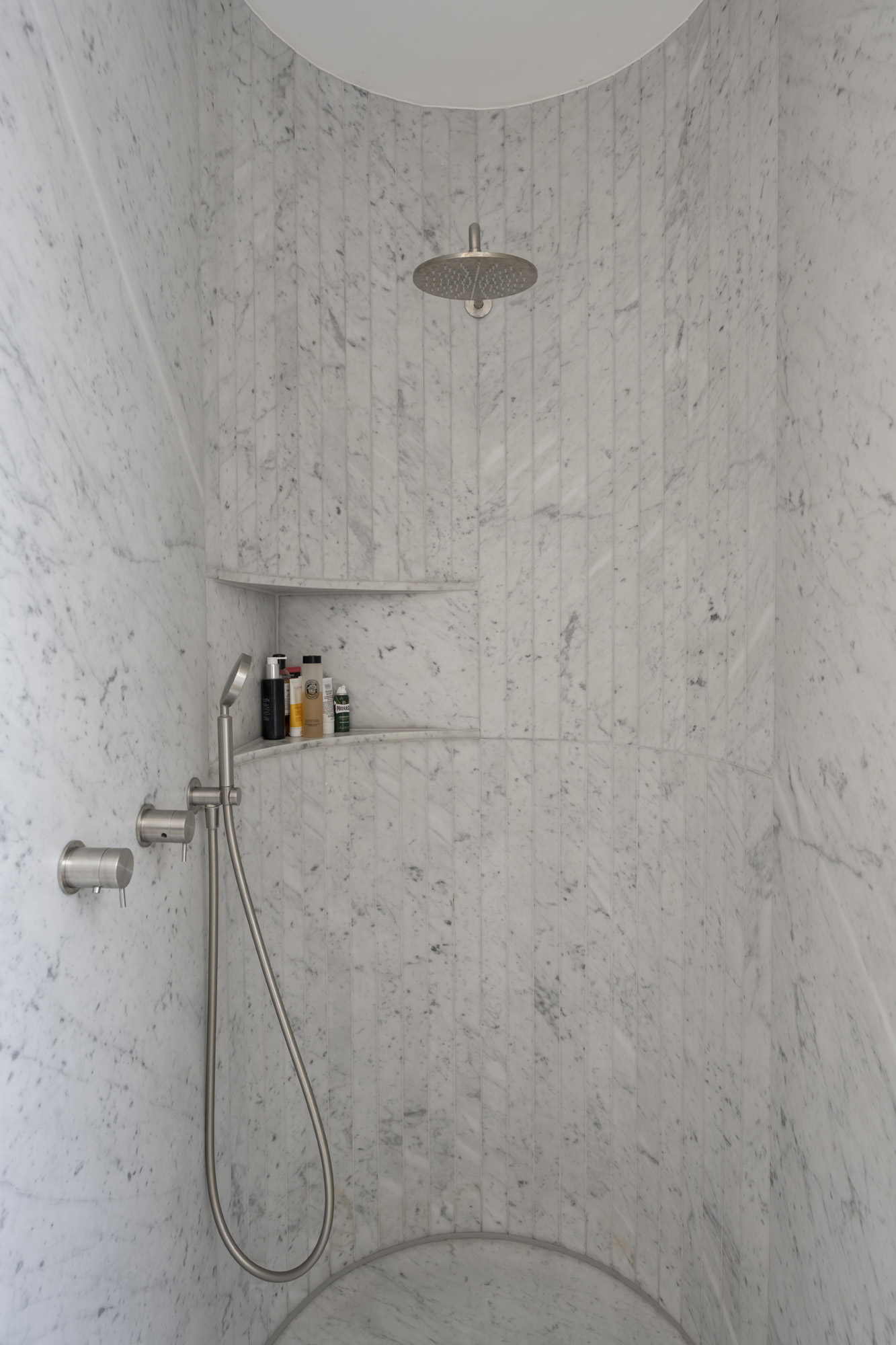 Two of the guest bedrooms feature bunk levels with integrated ladders, offering additional living and working spaces. The fourth guest bedroom is complete with built-in wardrobes and exposed wooden shelving. These rooms are served by a family bathroom – containing a bathtub and walk-in shower, finished in the same pale grey marble.