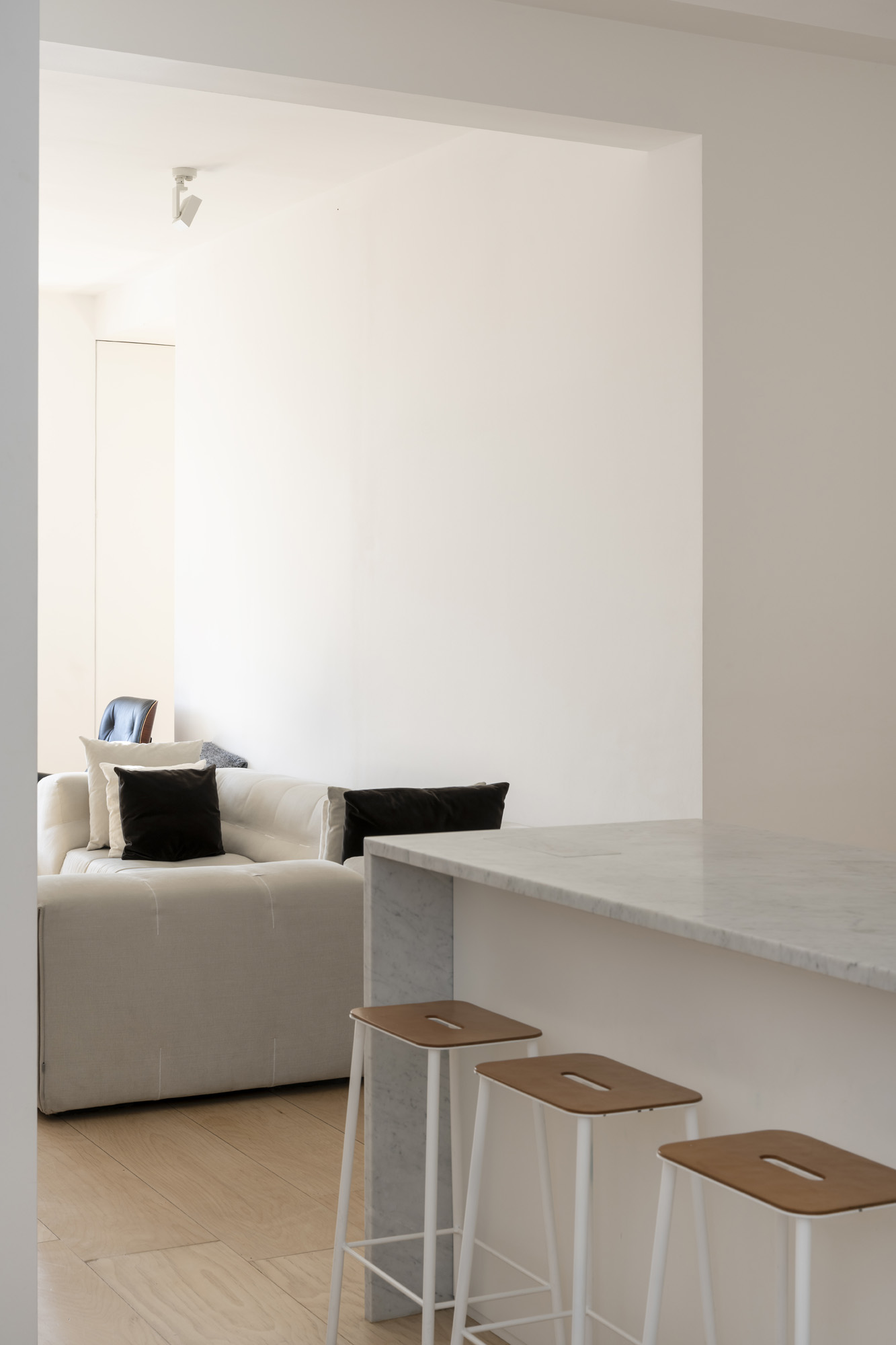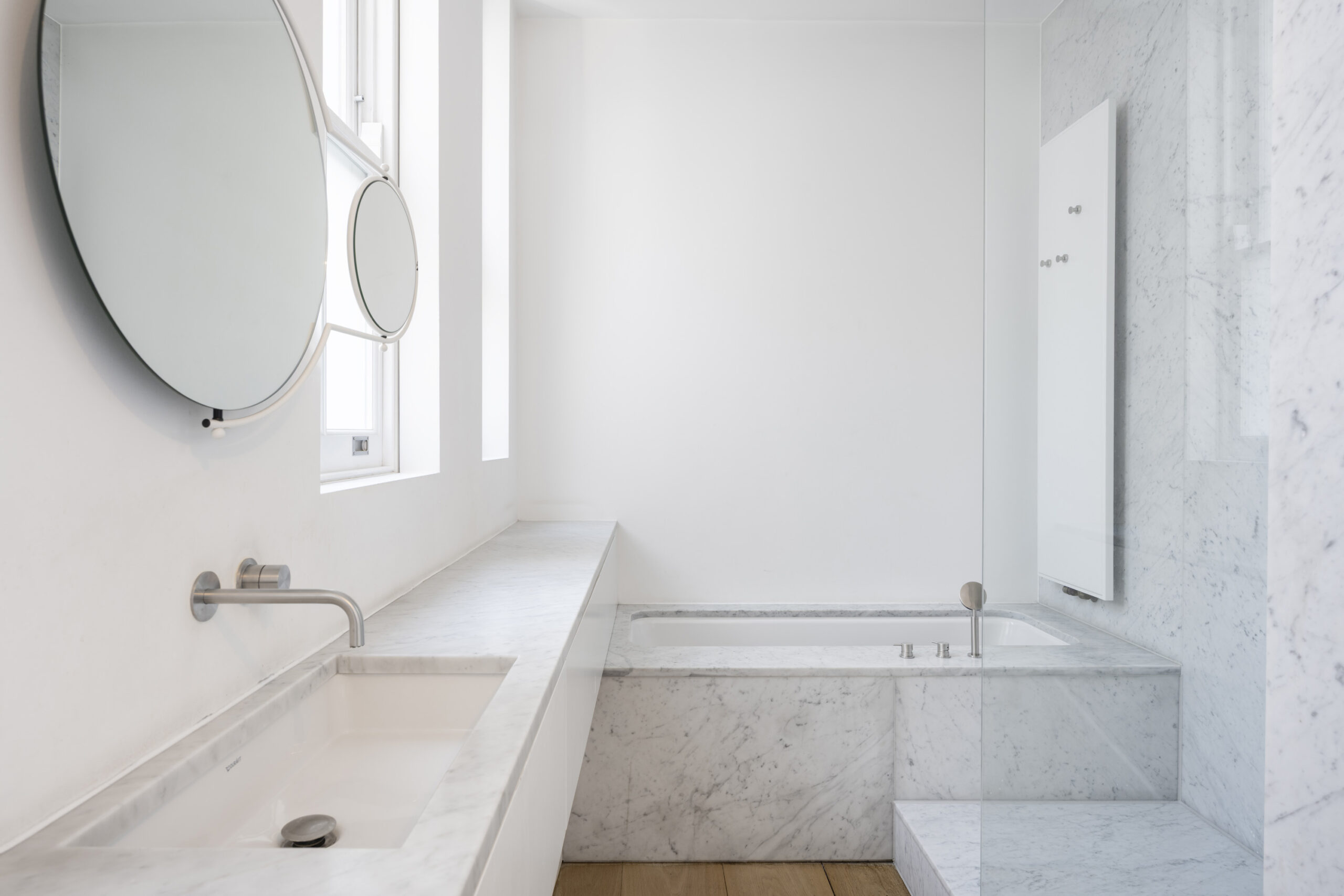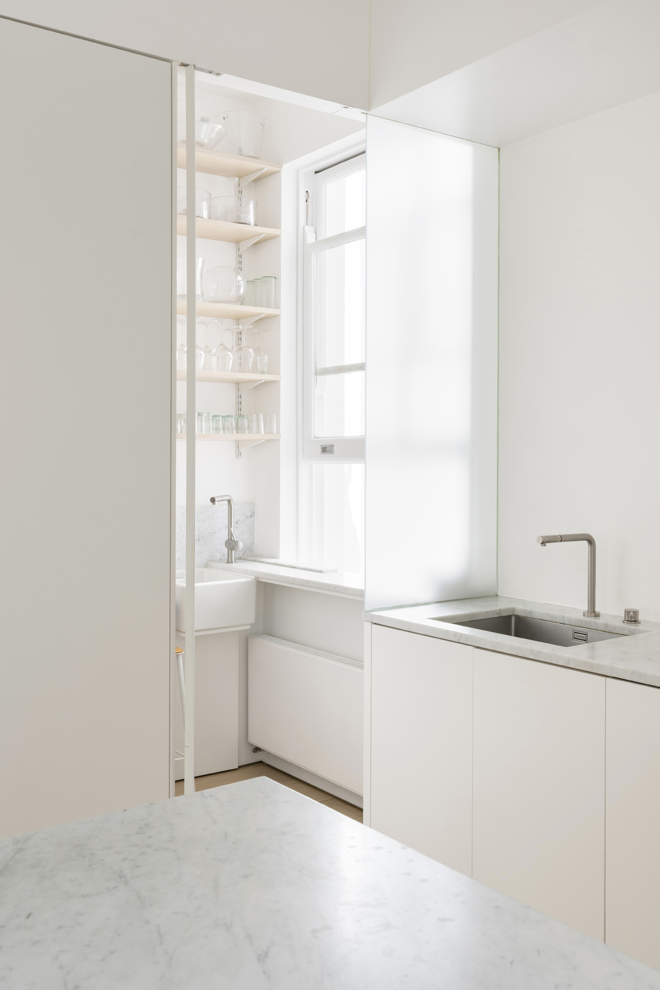 Beyond the ornate portico entrance, take the life to the fourth floor. Whitewashed walls and pale wood floors make a tranquil first impression, as you enter the open-plan kitchen and reception room. Internal columns subtly zone the two spaces, while natural light pours in through a bay window. Defined by clean lines and sleek technology, the kitchen features Gaggenau and Miele appliances neatly interspersed amongst Carrara marble worktops. Handless cabinetry affords a clean look throughout, including tall cupboards that fold back to reveal additional preparation and display space.