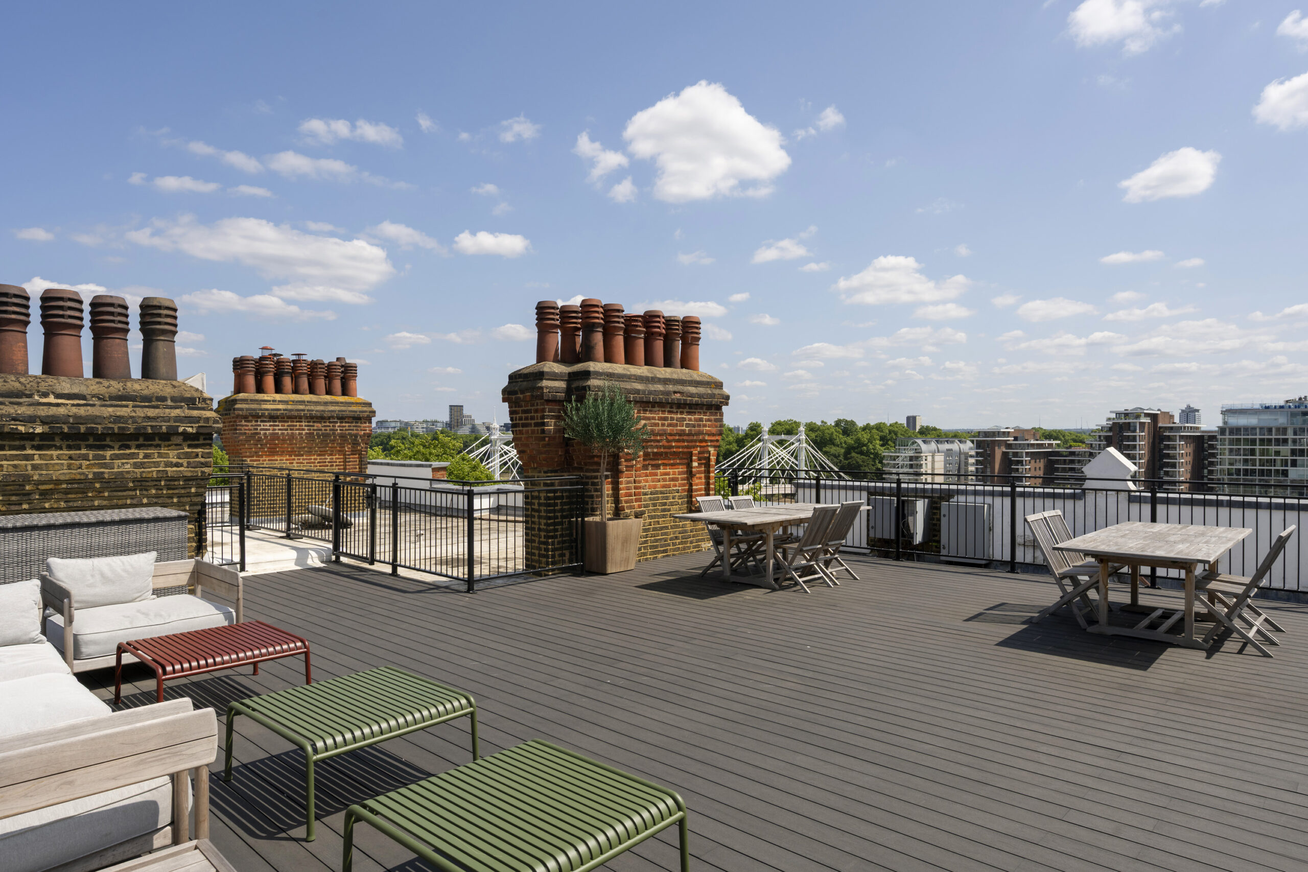 At the top of the home, a communal roof terrace is tailor-made for London’s warmer months. Enjoy far-reaching views across the Chelsea Embankment, River Thames and eclectic neighbourhood skyline.