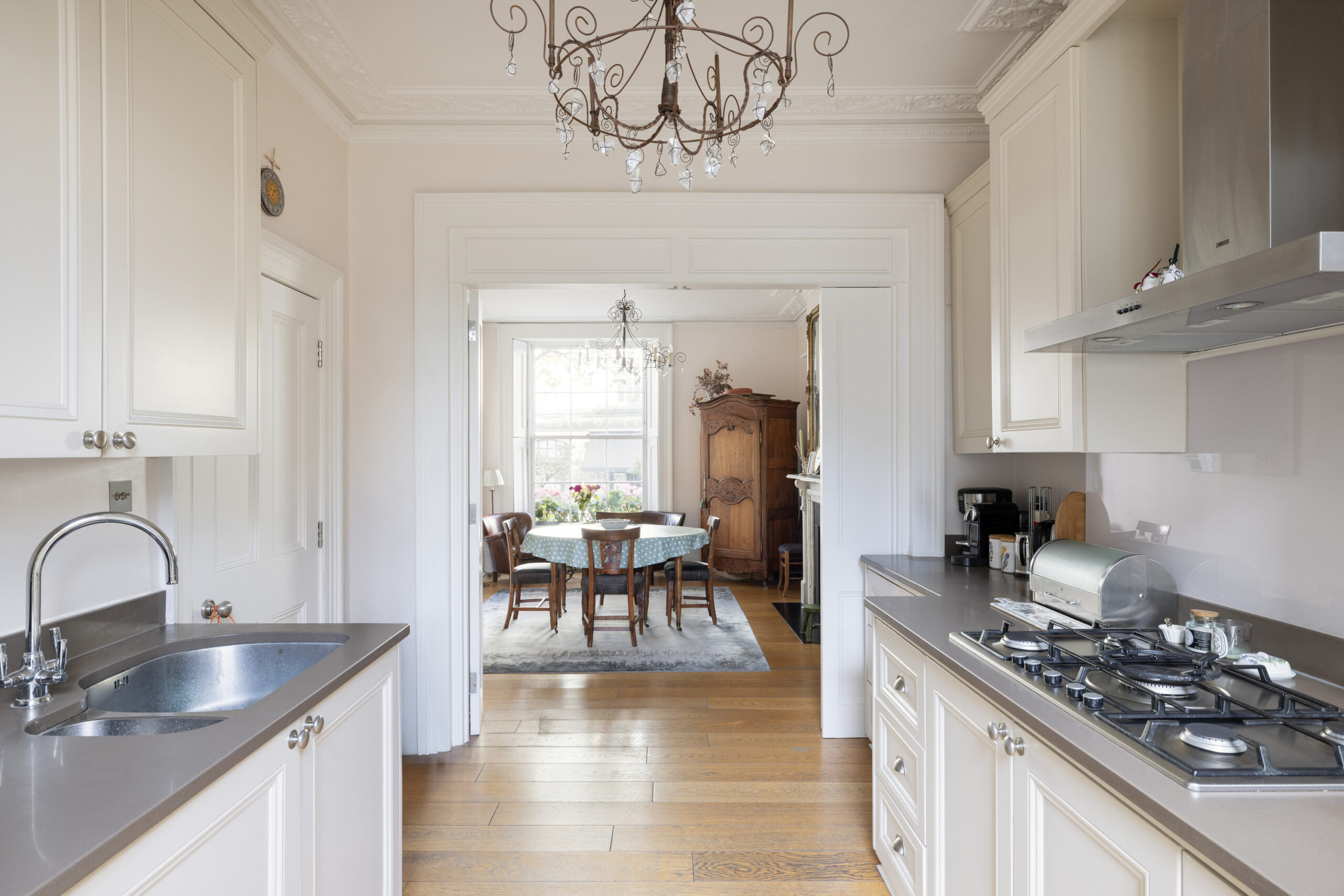 The open-plan kitchen and dining room sets the tone: tall ceilings edged with decorative roses and cornicing, a south-facing sash window drawing sunlight across oak floorboards and a marble fireplace. Folding doors lead through to the kitchen, where period detailing meets farmhouse cabinetry, integrated appliances and a double sink. From the same floor, a tranquil terrace garden unfolds – mature shrubbery and boundary walls create a private leafy sanctuary.