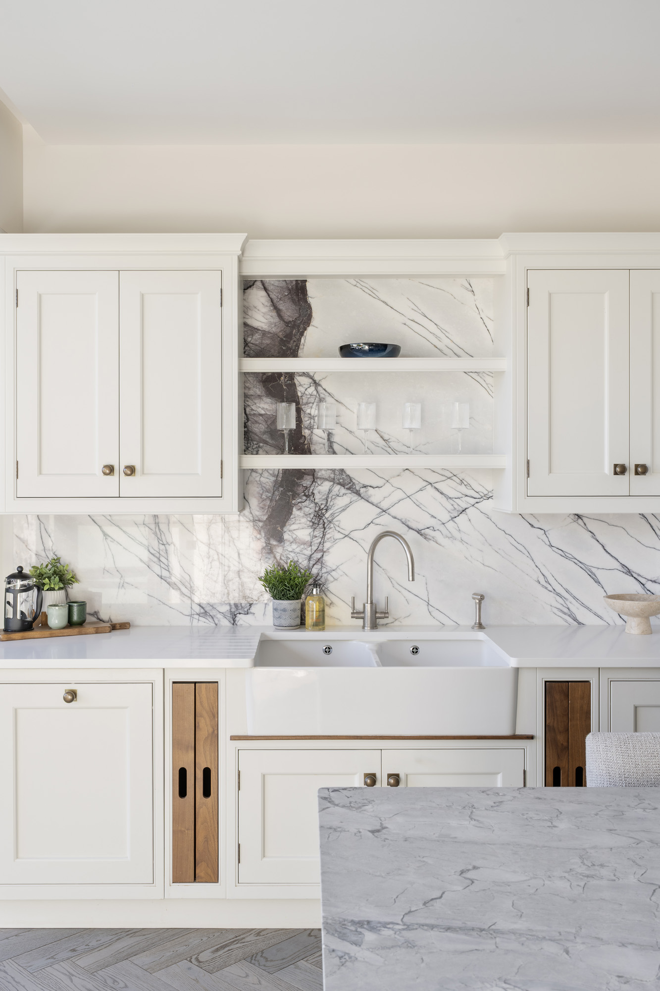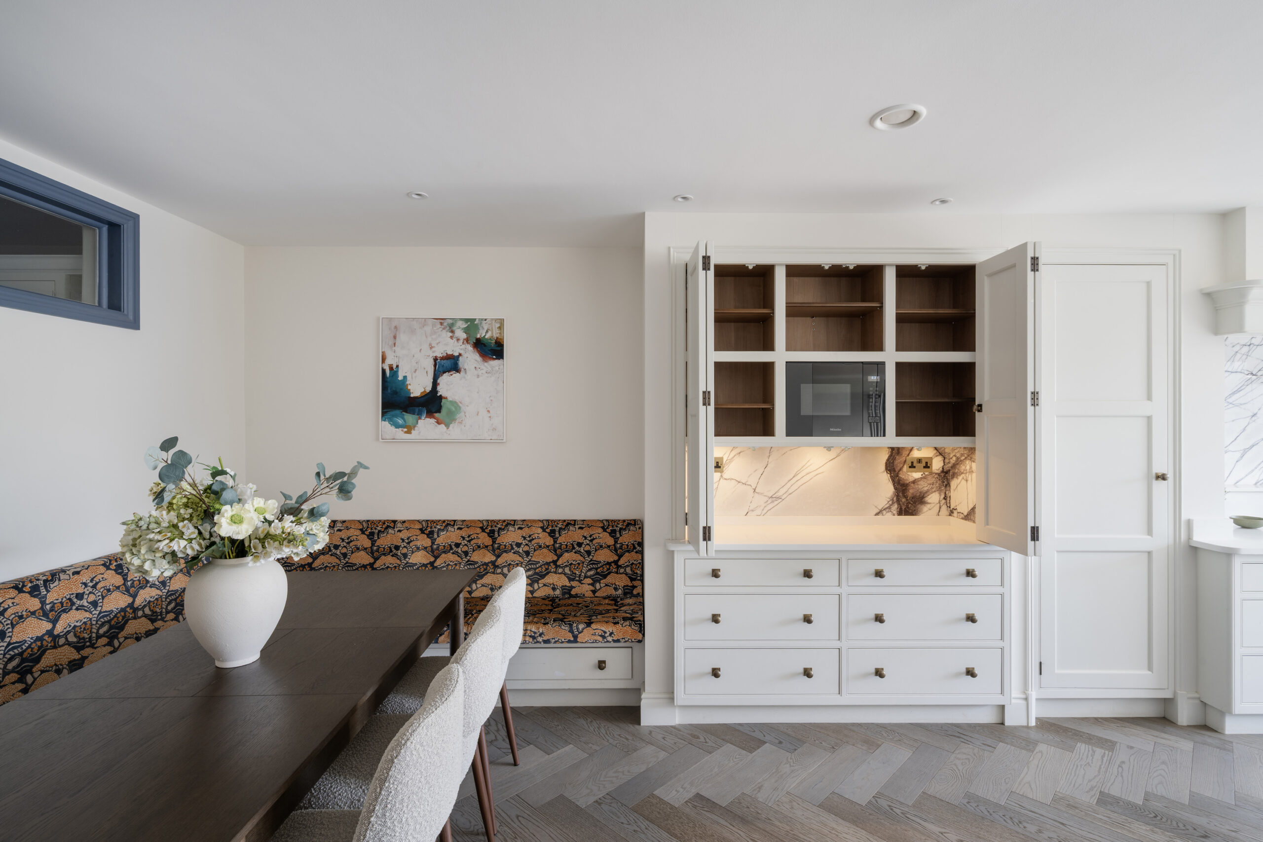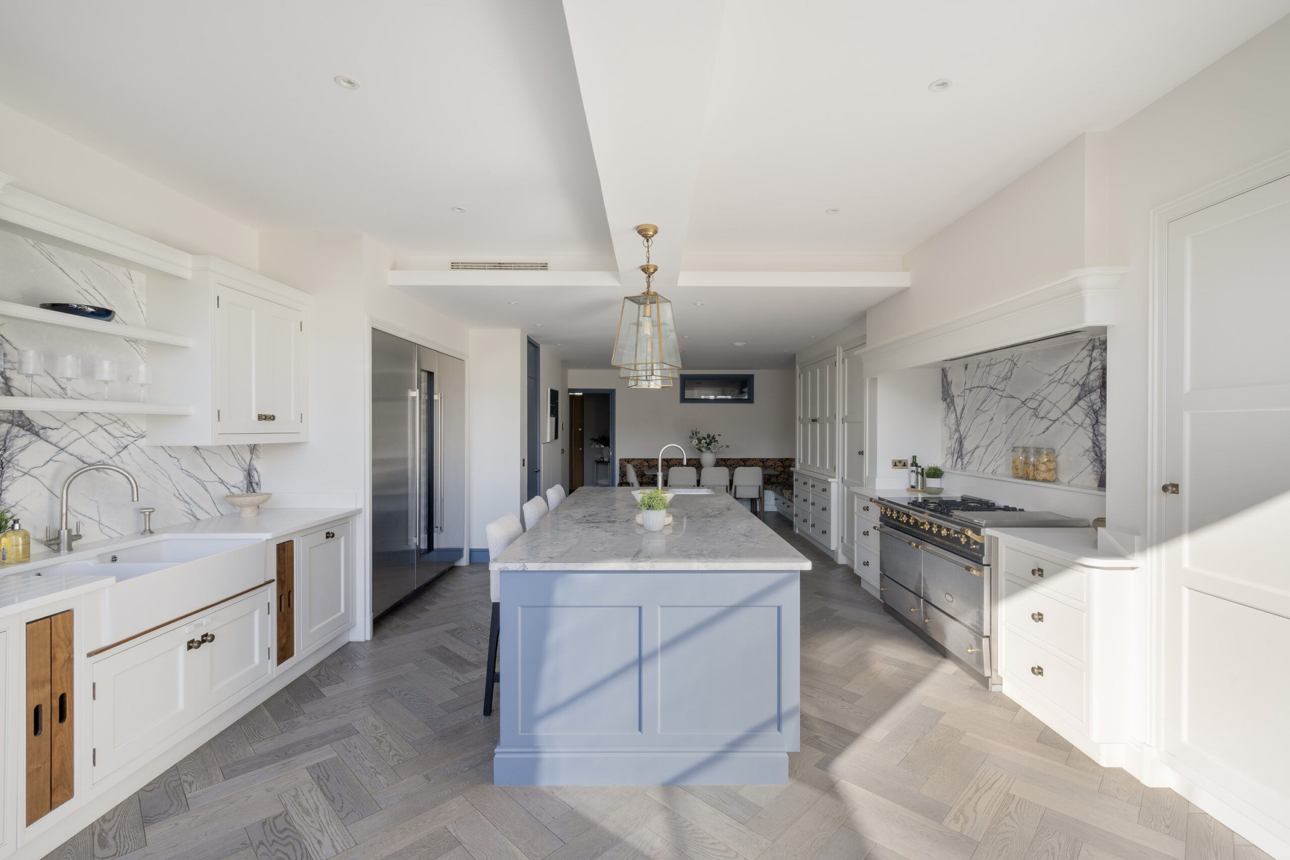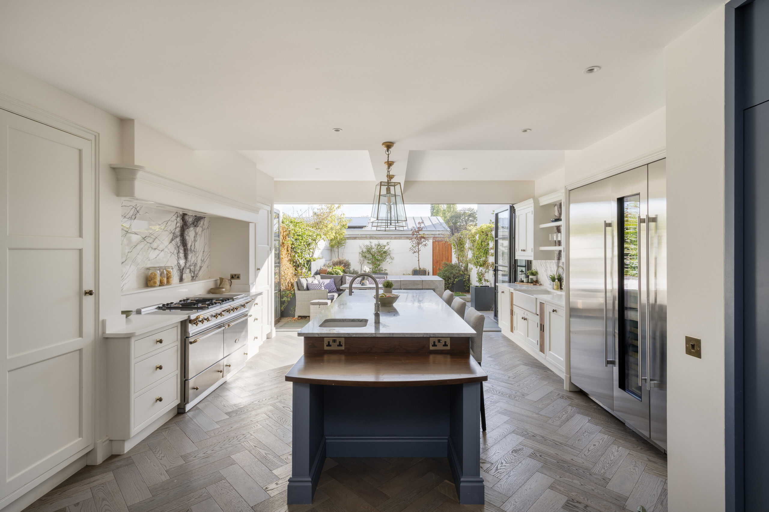 Recently reconfigured, the ground level living space is equal parts refined and functional. A Martin Moore kitchen anchors the setting; marble splashbacks catch the light, while a Nebula quartz island invites conversation or cooking. Every culinary demand is catered to here; make use of the Lacanche cooker, Sub-Zero fridge and dual Siemens dishwashers. When the weather calls for it, full-height sliding doors peel away to a landscaped garden.