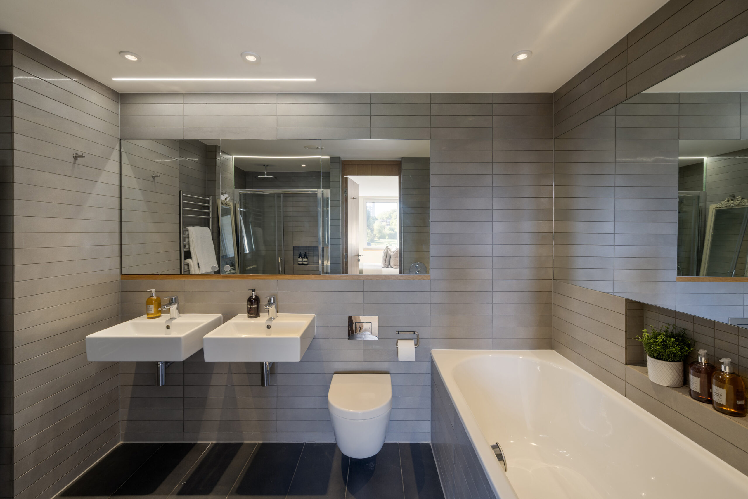 Upstairs, elegance meets ease in the principal bedroom suite. Soft neutrals and bespoke wardrobes instill a sense of calm, while multiple windows frame verdant views. Its en suite is a statement in slate grey, fitted with a freestanding bathtub and walk-in rainfall shower. One further bedroom sits on this floor, while two bedrooms above embody an inside-out feel, each opening to private terraces. Perfect for an au pair or extra privacy, the lower ground floor features two additional bedrooms, a private patio, utility room and family bathroom.