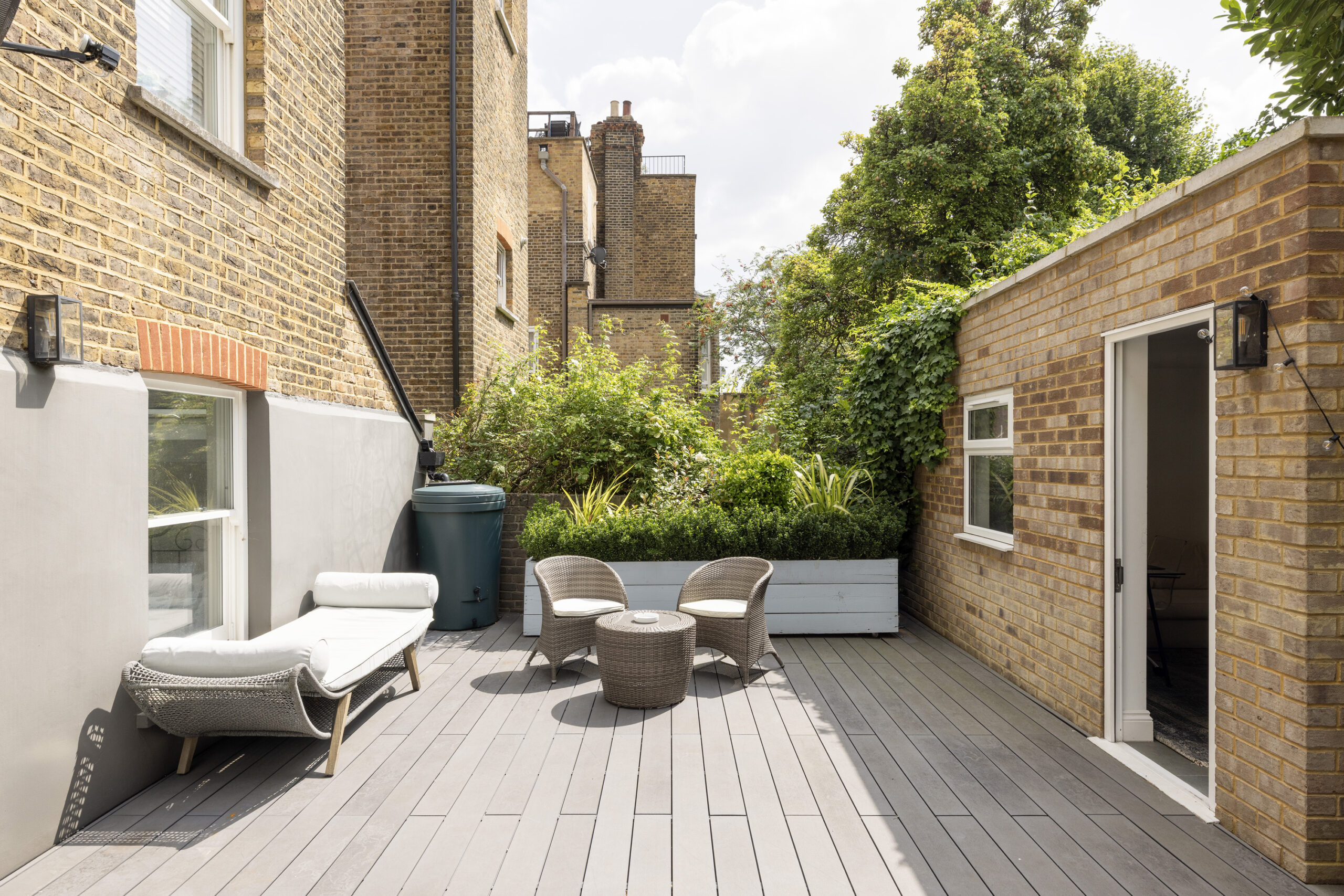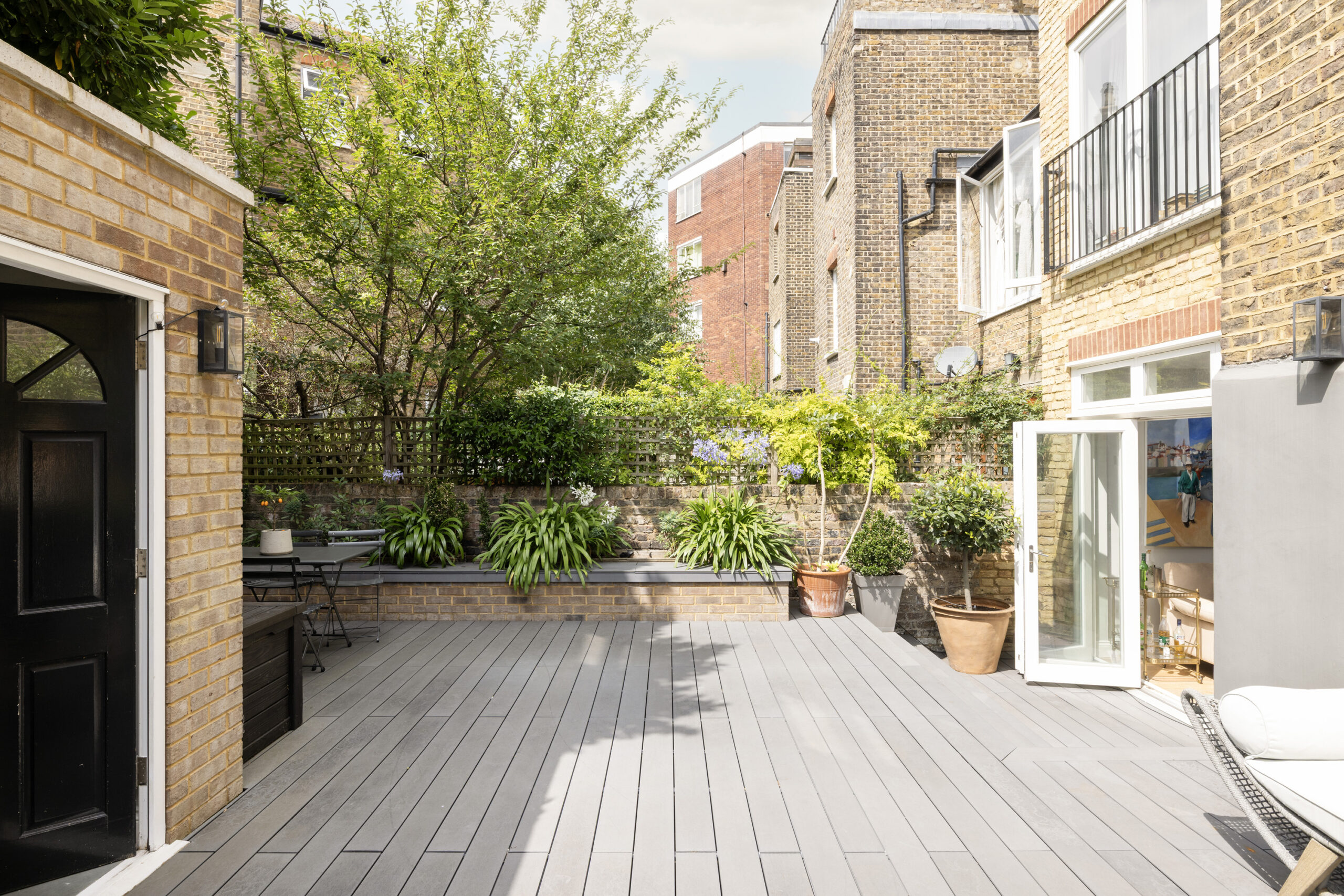 Step outside and the space transitions effortlessly into a tranquil patio garden. Decked in dark-grey cladding and enclosed by leafy trees and trellised walls, it’s a space designed as much for quiet moments as it is for al fresco entertaining. Raised flower beds add seasonal colour, while a garden studio to the rear offers a versatile space – equally suited to a home office or gym.